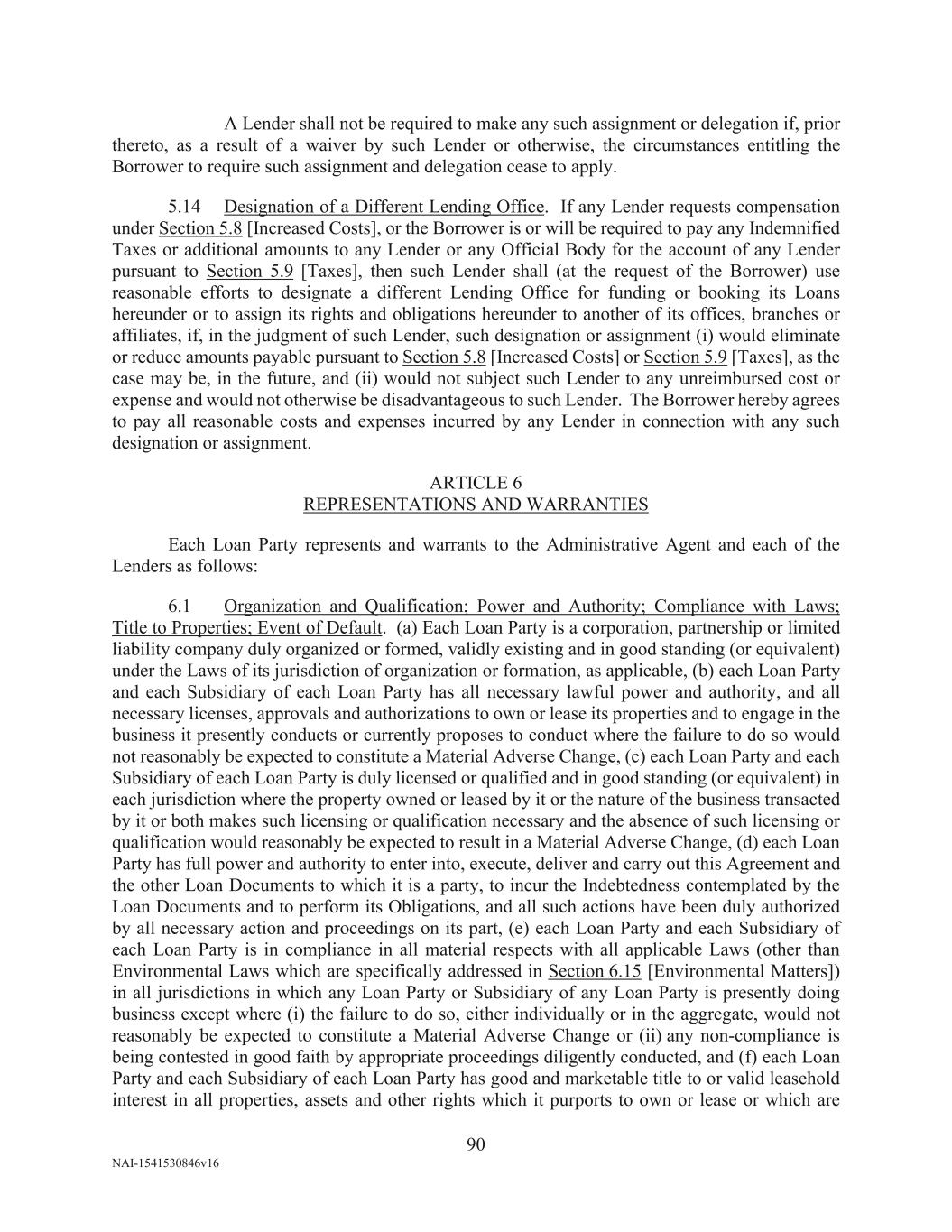 NAI-1541530846v16 90 A Lender shall not be required to make any such assignment or delegation if, prior thereto, as a result of a waiver by such Lender or otherwise, the circumstances entitling the Borrower to require such assignment and delegation cease to apply. 5.14 Designation of a Different Lending Office. If any Lender requests compensation under Section 5.8 [Increased Costs], or the Borrower is or will be required to pay any Indemnified Taxes or additional amounts to any Lender or any Official Body for the account of any Lender pursuant to Section 5.9 [Taxes], then such Lender shall (at the request of the Borrower) use reasonable efforts to designate a different Lending Office for funding or booking its Loans hereunder or to assign its rights and obligations hereunder to another of its offices, branches or affiliates, if, in the judgment of such Lender, such designation or assignment (i) would eliminate or reduce amounts payable pursuant to Section 5.8 [Increased Costs] or Section 5.9 [Taxes], as the case may be, in the future, and (ii) would not subject such Lender to any unreimbursed cost or expense and would not otherwise be disadvantageous to such Lender. The Borrower hereby agrees to pay all reasonable costs and expenses incurred by any Lender in connection with any such designation or assignment. ARTICLE 6 REPRESENTATIONS AND WARRANTIES Each Loan Party represents and warrants to the Administrative Agent and each of the Lenders as follows: 6.1 Organization and Qualification; Power and Authority; Compliance with Laws; Title to Properties; Event of Default. (a) Each Loan Party is a corporation, partnership or limited liability company duly organized or formed, validly existing and in good standing (or equivalent) under the Laws of its jurisdiction of organization or formation, as applicable, (b) each Loan Party and each Subsidiary of each Loan Party has all necessary lawful power and authority, and all necessary licenses, approvals and authorizations to own or lease its properties and to engage in the business it presently conducts or currently proposes to conduct where the failure to do so would not reasonably be expected to constitute a Material Adverse Change, (c) each Loan Party and each Subsidiary of each Loan Party is duly licensed or qualified and in good standing (or equivalent) in each jurisdiction where the property owned or leased by it or the nature of the business transacted by it or both makes such licensing or qualification necessary and the absence of such licensing or qualification would reasonably be expected to result in a Material Adverse Change, (d) each Loan Party has full power and authority to enter into, execute, deliver and carry out this Agreement and the other Loan Documents to which it is a party, to incur the Indebtedness contemplated by the Loan Documents and to perform its Obligations, and all such actions have been duly authorized by all necessary action and proceedings on its part, (e) each Loan Party and each Subsidiary of each Loan Party is in compliance in all material respects with all applicable Laws (other than Environmental Laws which are specifically addressed in Section 6.15 [Environmental Matters]) in all jurisdictions in which any Loan Party or Subsidiary of any Loan Party is presently doing business except where (i) the failure to do so, either individually or in the aggregate, would not reasonably be expected to constitute a Material Adverse Change or (ii) any non-compliance is being contested in good faith by appropriate proceedings diligently conducted, and (f) each Loan Party and each Subsidiary of each Loan Party has good and marketable title to or valid leasehold interest in all properties, assets and other rights which it purports to own or lease or which are