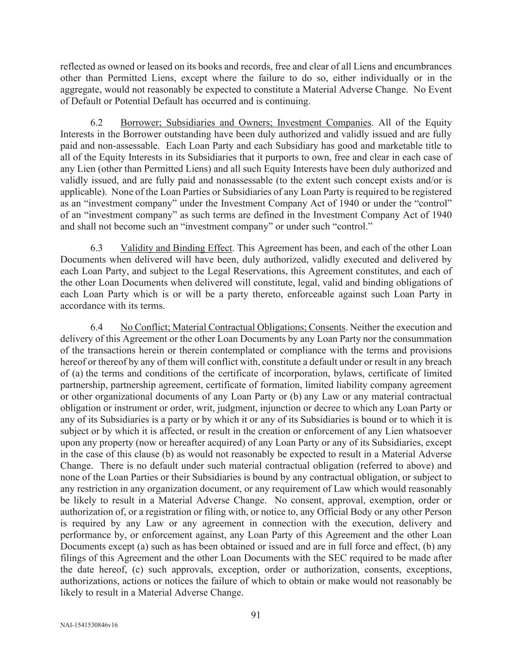 NAI-1541530846v16 91 reflected as owned or leased on its books and records, free and clear of all Liens and encumbrances other than Permitted Liens, except where the failure to do so, either individually or in the aggregate, would not reasonably be expected to constitute a Material Adverse Change. No Event of Default or Potential Default has occurred and is continuing. 6.2 Borrower; Subsidiaries and Owners; Investment Companies. All of the Equity Interests in the Borrower outstanding have been duly authorized and validly issued and are fully paid and non-assessable. Each Loan Party and each Subsidiary has good and marketable title to all of the Equity Interests in its Subsidiaries that it purports to own, free and clear in each case of any Lien (other than Permitted Liens) and all such Equity Interests have been duly authorized and validly issued, and are fully paid and nonassessable (to the extent such concept exists and/or is applicable). None of the Loan Parties or Subsidiaries of any Loan Party is required to be registered as an “investment company” under the Investment Company Act of 1940 or under the “control” of an “investment company” as such terms are defined in the Investment Company Act of 1940 and shall not become such an “investment company” or under such “control.” 6.3 Validity and Binding Effect. This Agreement has been, and each of the other Loan Documents when delivered will have been, duly authorized, validly executed and delivered by each Loan Party, and subject to the Legal Reservations, this Agreement constitutes, and each of the other Loan Documents when delivered will constitute, legal, valid and binding obligations of each Loan Party which is or will be a party thereto, enforceable against such Loan Party in accordance with its terms. 6.4 No Conflict; Material Contractual Obligations; Consents. Neither the execution and delivery of this Agreement or the other Loan Documents by any Loan Party nor the consummation of the transactions herein or therein contemplated or compliance with the terms and provisions hereof or thereof by any of them will conflict with, constitute a default under or result in any breach of (a) the terms and conditions of the certificate of incorporation, bylaws, certificate of limited partnership, partnership agreement, certificate of formation, limited liability company agreement or other organizational documents of any Loan Party or (b) any Law or any material contractual obligation or instrument or order, writ, judgment, injunction or decree to which any Loan Party or any of its Subsidiaries is a party or by which it or any of its Subsidiaries is bound or to which it is subject or by which it is affected, or result in the creation or enforcement of any Lien whatsoever upon any property (now or hereafter acquired) of any Loan Party or any of its Subsidiaries, except in the case of this clause (b) as would not reasonably be expected to result in a Material Adverse Change. There is no default under such material contractual obligation (referred to above) and none of the Loan Parties or their Subsidiaries is bound by any contractual obligation, or subject to any restriction in any organization document, or any requirement of Law which would reasonably be likely to result in a Material Adverse Change. No consent, approval, exemption, order or authorization of, or a registration or filing with, or notice to, any Official Body or any other Person is required by any Law or any agreement in connection with the execution, delivery and performance by, or enforcement against, any Loan Party of this Agreement and the other Loan Documents except (a) such as has been obtained or issued and are in full force and effect, (b) any filings of this Agreement and the other Loan Documents with the SEC required to be made after the date hereof, (c) such approvals, exception, order or authorization, consents, exceptions, authorizations, actions or notices the failure of which to obtain or make would not reasonably be likely to result in a Material Adverse Change.