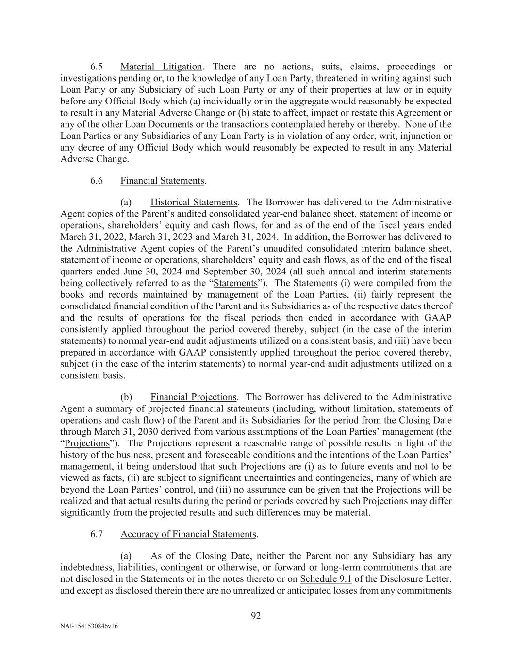 NAI-1541530846v16 92 6.5 Material Litigation. There are no actions, suits, claims, proceedings or investigations pending or, to the knowledge of any Loan Party, threatened in writing against such Loan Party or any Subsidiary of such Loan Party or any of their properties at law or in equity before any Official Body which (a) individually or in the aggregate would reasonably be expected to result in any Material Adverse Change or (b) state to affect, impact or restate this Agreement or any of the other Loan Documents or the transactions contemplated hereby or thereby. None of the Loan Parties or any Subsidiaries of any Loan Party is in violation of any order, writ, injunction or any decree of any Official Body which would reasonably be expected to result in any Material Adverse Change. 6.6 Financial Statements. (a) Historical Statements. The Borrower has delivered to the Administrative Agent copies of the Parent’s audited consolidated year-end balance sheet, statement of income or operations, shareholders’ equity and cash flows, for and as of the end of the fiscal years ended March 31, 2022, March 31, 2023 and March 31, 2024. In addition, the Borrower has delivered to the Administrative Agent copies of the Parent’s unaudited consolidated interim balance sheet, statement of income or operations, shareholders’ equity and cash flows, as of the end of the fiscal quarters ended June 30, 2024 and September 30, 2024 (all such annual and interim statements being collectively referred to as the “Statements”). The Statements (i) were compiled from the books and records maintained by management of the Loan Parties, (ii) fairly represent the consolidated financial condition of the Parent and its Subsidiaries as of the respective dates thereof and the results of operations for the fiscal periods then ended in accordance with GAAP consistently applied throughout the period covered thereby, subject (in the case of the interim statements) to normal year-end audit adjustments utilized on a consistent basis, and (iii) have been prepared in accordance with GAAP consistently applied throughout the period covered thereby, subject (in the case of the interim statements) to normal year-end audit adjustments utilized on a consistent basis. (b) Financial Projections. The Borrower has delivered to the Administrative Agent a summary of projected financial statements (including, without limitation, statements of operations and cash flow) of the Parent and its Subsidiaries for the period from the Closing Date through March 31, 2030 derived from various assumptions of the Loan Parties’ management (the “Projections”). The Projections represent a reasonable range of possible results in light of the history of the business, present and foreseeable conditions and the intentions of the Loan Parties’ management, it being understood that such Projections are (i) as to future events and not to be viewed as facts, (ii) are subject to significant uncertainties and contingencies, many of which are beyond the Loan Parties’ control, and (iii) no assurance can be given that the Projections will be realized and that actual results during the period or periods covered by such Projections may differ significantly from the projected results and such differences may be material. 6.7 Accuracy of Financial Statements. (a) As of the Closing Date, neither the Parent nor any Subsidiary has any indebtedness, liabilities, contingent or otherwise, or forward or long-term commitments that are not disclosed in the Statements or in the notes thereto or on Schedule 9.1 of the Disclosure Letter, and except as disclosed therein there are no unrealized or anticipated losses from any commitments