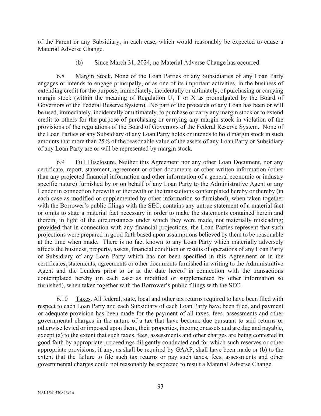 NAI-1541530846v16 93 of the Parent or any Subsidiary, in each case, which would reasonably be expected to cause a Material Adverse Change. (b) Since March 31, 2024, no Material Adverse Change has occurred. 6.8 Margin Stock. None of the Loan Parties or any Subsidiaries of any Loan Party engages or intends to engage principally, or as one of its important activities, in the business of extending credit for the purpose, immediately, incidentally or ultimately, of purchasing or carrying margin stock (within the meaning of Regulation U, T or X as promulgated by the Board of Governors of the Federal Reserve System). No part of the proceeds of any Loan has been or will be used, immediately, incidentally or ultimately, to purchase or carry any margin stock or to extend credit to others for the purpose of purchasing or carrying any margin stock in violation of the provisions of the regulations of the Board of Governors of the Federal Reserve System. None of the Loan Parties or any Subsidiary of any Loan Party holds or intends to hold margin stock in such amounts that more than 25% of the reasonable value of the assets of any Loan Party or Subsidiary of any Loan Party are or will be represented by margin stock. 6.9 Full Disclosure. Neither this Agreement nor any other Loan Document, nor any certificate, report, statement, agreement or other documents or other written information (other than any projected financial information and other information of a general economic or industry specific nature) furnished by or on behalf of any Loan Party to the Administrative Agent or any Lender in connection herewith or therewith or the transactions contemplated hereby or thereby (in each case as modified or supplemented by other information so furnished), when taken together with the Borrower’s public filings with the SEC, contains any untrue statement of a material fact or omits to state a material fact necessary in order to make the statements contained herein and therein, in light of the circumstances under which they were made, not materially misleading; provided that in connection with any financial projections, the Loan Parties represent that such projections were prepared in good faith based upon assumptions believed by them to be reasonable at the time when made. There is no fact known to any Loan Party which materially adversely affects the business, property, assets, financial condition or results of operations of any Loan Party or Subsidiary of any Loan Party which has not been specified in this Agreement or in the certificates, statements, agreements or other documents furnished in writing to the Administrative Agent and the Lenders prior to or at the date hereof in connection with the transactions contemplated hereby (in each case as modified or supplemented by other information so furnished), when taken together with the Borrower’s public filings with the SEC. 6.10 Taxes. All federal, state, local and other tax returns required to have been filed with respect to each Loan Party and each Subsidiary of each Loan Party have been filed, and payment or adequate provision has been made for the payment of all taxes, fees, assessments and other governmental charges in the nature of a tax that have become due pursuant to said returns or otherwise levied or imposed upon them, their properties, income or assets and are due and payable, except (a) to the extent that such taxes, fees, assessments and other charges are being contested in good faith by appropriate proceedings diligently conducted and for which such reserves or other appropriate provisions, if any, as shall be required by GAAP, shall have been made or (b) to the extent that the failure to file such tax returns or pay such taxes, fees, assessments and other governmental charges could not reasonably be expected to result a Material Adverse Change.