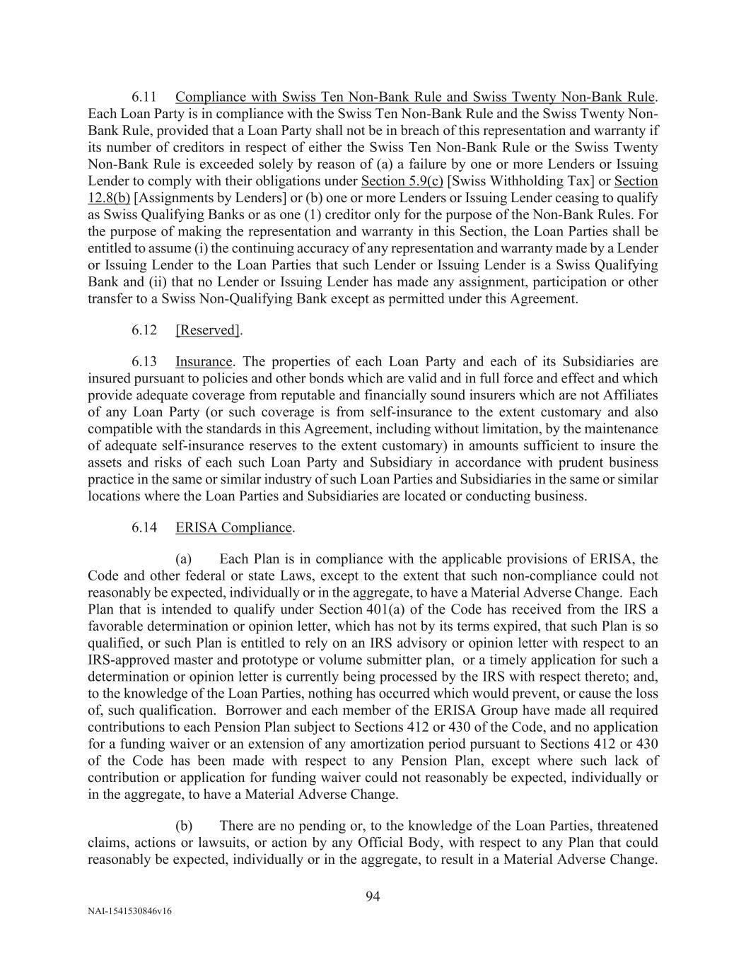 NAI-1541530846v16 94 6.11 Compliance with Swiss Ten Non-Bank Rule and Swiss Twenty Non-Bank Rule. Each Loan Party is in compliance with the Swiss Ten Non-Bank Rule and the Swiss Twenty Non- Bank Rule, provided that a Loan Party shall not be in breach of this representation and warranty if its number of creditors in respect of either the Swiss Ten Non-Bank Rule or the Swiss Twenty Non-Bank Rule is exceeded solely by reason of (a) a failure by one or more Lenders or Issuing Lender to comply with their obligations under Section 5.9(c) [Swiss Withholding Tax] or Section 12.8(b) [Assignments by Lenders] or (b) one or more Lenders or Issuing Lender ceasing to qualify as Swiss Qualifying Banks or as one (1) creditor only for the purpose of the Non-Bank Rules. For the purpose of making the representation and warranty in this Section, the Loan Parties shall be entitled to assume (i) the continuing accuracy of any representation and warranty made by a Lender or Issuing Lender to the Loan Parties that such Lender or Issuing Lender is a Swiss Qualifying Bank and (ii) that no Lender or Issuing Lender has made any assignment, participation or other transfer to a Swiss Non-Qualifying Bank except as permitted under this Agreement. 6.12 [Reserved]. 6.13 Insurance. The properties of each Loan Party and each of its Subsidiaries are insured pursuant to policies and other bonds which are valid and in full force and effect and which provide adequate coverage from reputable and financially sound insurers which are not Affiliates of any Loan Party (or such coverage is from self-insurance to the extent customary and also compatible with the standards in this Agreement, including without limitation, by the maintenance of adequate self-insurance reserves to the extent customary) in amounts sufficient to insure the assets and risks of each such Loan Party and Subsidiary in accordance with prudent business practice in the same or similar industry of such Loan Parties and Subsidiaries in the same or similar locations where the Loan Parties and Subsidiaries are located or conducting business. 6.14 ERISA Compliance. (a) Each Plan is in compliance with the applicable provisions of ERISA, the Code and other federal or state Laws, except to the extent that such non-compliance could not reasonably be expected, individually or in the aggregate, to have a Material Adverse Change. Each Plan that is intended to qualify under Section 401(a) of the Code has received from the IRS a favorable determination or opinion letter, which has not by its terms expired, that such Plan is so qualified, or such Plan is entitled to rely on an IRS advisory or opinion letter with respect to an IRS-approved master and prototype or volume submitter plan, or a timely application for such a determination or opinion letter is currently being processed by the IRS with respect thereto; and, to the knowledge of the Loan Parties, nothing has occurred which would prevent, or cause the loss of, such qualification. Borrower and each member of the ERISA Group have made all required contributions to each Pension Plan subject to Sections 412 or 430 of the Code, and no application for a funding waiver or an extension of any amortization period pursuant to Sections 412 or 430 of the Code has been made with respect to any Pension Plan, except where such lack of contribution or application for funding waiver could not reasonably be expected, individually or in the aggregate, to have a Material Adverse Change. (b) There are no pending or, to the knowledge of the Loan Parties, threatened claims, actions or lawsuits, or action by any Official Body, with respect to any Plan that could reasonably be expected, individually or in the aggregate, to result in a Material Adverse Change.