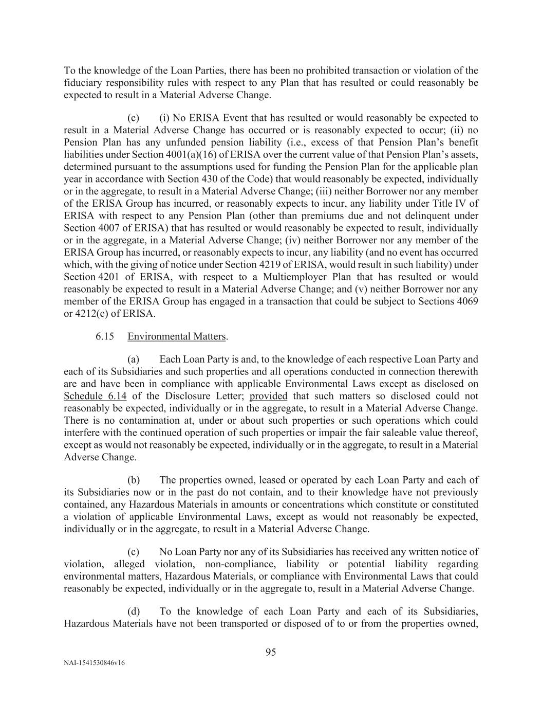 NAI-1541530846v16 95 To the knowledge of the Loan Parties, there has been no prohibited transaction or violation of the fiduciary responsibility rules with respect to any Plan that has resulted or could reasonably be expected to result in a Material Adverse Change. (c) (i) No ERISA Event that has resulted or would reasonably be expected to result in a Material Adverse Change has occurred or is reasonably expected to occur; (ii) no Pension Plan has any unfunded pension liability (i.e., excess of that Pension Plan’s benefit liabilities under Section 4001(a)(16) of ERISA over the current value of that Pension Plan’s assets, determined pursuant to the assumptions used for funding the Pension Plan for the applicable plan year in accordance with Section 430 of the Code) that would reasonably be expected, individually or in the aggregate, to result in a Material Adverse Change; (iii) neither Borrower nor any member of the ERISA Group has incurred, or reasonably expects to incur, any liability under Title IV of ERISA with respect to any Pension Plan (other than premiums due and not delinquent under Section 4007 of ERISA) that has resulted or would reasonably be expected to result, individually or in the aggregate, in a Material Adverse Change; (iv) neither Borrower nor any member of the ERISA Group has incurred, or reasonably expects to incur, any liability (and no event has occurred which, with the giving of notice under Section 4219 of ERISA, would result in such liability) under Section 4201 of ERISA, with respect to a Multiemployer Plan that has resulted or would reasonably be expected to result in a Material Adverse Change; and (v) neither Borrower nor any member of the ERISA Group has engaged in a transaction that could be subject to Sections 4069 or 4212(c) of ERISA. 6.15 Environmental Matters. (a) Each Loan Party is and, to the knowledge of each respective Loan Party and each of its Subsidiaries and such properties and all operations conducted in connection therewith are and have been in compliance with applicable Environmental Laws except as disclosed on Schedule 6.14 of the Disclosure Letter; provided that such matters so disclosed could not reasonably be expected, individually or in the aggregate, to result in a Material Adverse Change. There is no contamination at, under or about such properties or such operations which could interfere with the continued operation of such properties or impair the fair saleable value thereof, except as would not reasonably be expected, individually or in the aggregate, to result in a Material Adverse Change. (b) The properties owned, leased or operated by each Loan Party and each of its Subsidiaries now or in the past do not contain, and to their knowledge have not previously contained, any Hazardous Materials in amounts or concentrations which constitute or constituted a violation of applicable Environmental Laws, except as would not reasonably be expected, individually or in the aggregate, to result in a Material Adverse Change. (c) No Loan Party nor any of its Subsidiaries has received any written notice of violation, alleged violation, non-compliance, liability or potential liability regarding environmental matters, Hazardous Materials, or compliance with Environmental Laws that could reasonably be expected, individually or in the aggregate to, result in a Material Adverse Change. (d) To the knowledge of each Loan Party and each of its Subsidiaries, Hazardous Materials have not been transported or disposed of to or from the properties owned,