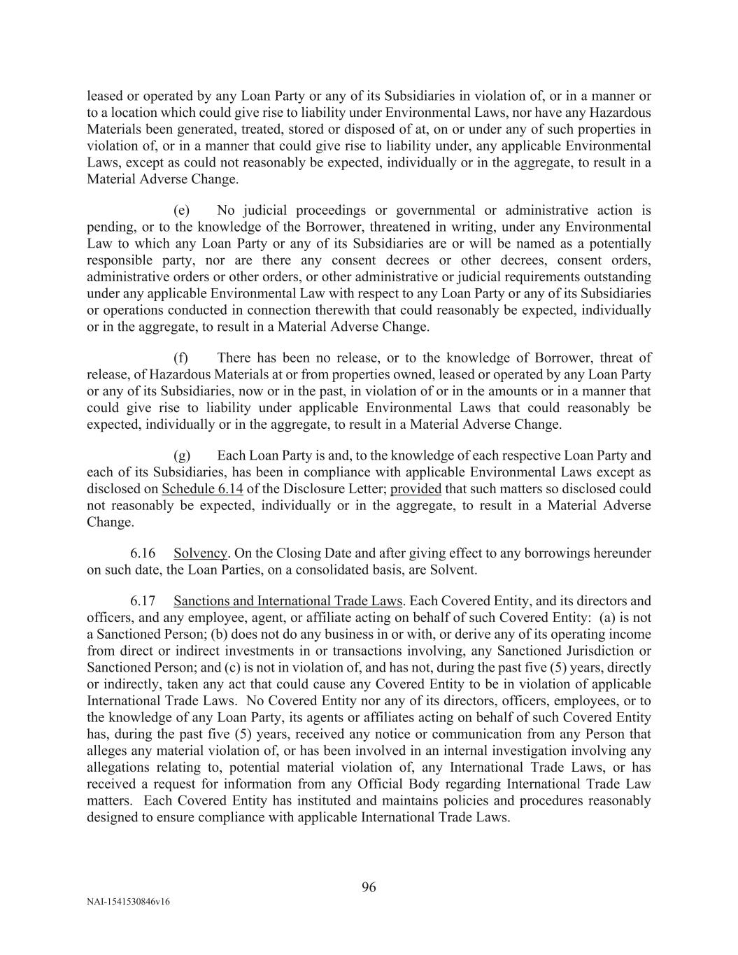 NAI-1541530846v16 96 leased or operated by any Loan Party or any of its Subsidiaries in violation of, or in a manner or to a location which could give rise to liability under Environmental Laws, nor have any Hazardous Materials been generated, treated, stored or disposed of at, on or under any of such properties in violation of, or in a manner that could give rise to liability under, any applicable Environmental Laws, except as could not reasonably be expected, individually or in the aggregate, to result in a Material Adverse Change. (e) No judicial proceedings or governmental or administrative action is pending, or to the knowledge of the Borrower, threatened in writing, under any Environmental Law to which any Loan Party or any of its Subsidiaries are or will be named as a potentially responsible party, nor are there any consent decrees or other decrees, consent orders, administrative orders or other orders, or other administrative or judicial requirements outstanding under any applicable Environmental Law with respect to any Loan Party or any of its Subsidiaries or operations conducted in connection therewith that could reasonably be expected, individually or in the aggregate, to result in a Material Adverse Change. (f) There has been no release, or to the knowledge of Borrower, threat of release, of Hazardous Materials at or from properties owned, leased or operated by any Loan Party or any of its Subsidiaries, now or in the past, in violation of or in the amounts or in a manner that could give rise to liability under applicable Environmental Laws that could reasonably be expected, individually or in the aggregate, to result in a Material Adverse Change. (g) Each Loan Party is and, to the knowledge of each respective Loan Party and each of its Subsidiaries, has been in compliance with applicable Environmental Laws except as disclosed on Schedule 6.14 of the Disclosure Letter; provided that such matters so disclosed could not reasonably be expected, individually or in the aggregate, to result in a Material Adverse Change. 6.16 Solvency. On the Closing Date and after giving effect to any borrowings hereunder on such date, the Loan Parties, on a consolidated basis, are Solvent. 6.17 Sanctions and International Trade Laws. Each Covered Entity, and its directors and officers, and any employee, agent, or affiliate acting on behalf of such Covered Entity: (a) is not a Sanctioned Person; (b) does not do any business in or with, or derive any of its operating income from direct or indirect investments in or transactions involving, any Sanctioned Jurisdiction or Sanctioned Person; and (c) is not in violation of, and has not, during the past five (5) years, directly or indirectly, taken any act that could cause any Covered Entity to be in violation of applicable International Trade Laws. No Covered Entity nor any of its directors, officers, employees, or to the knowledge of any Loan Party, its agents or affiliates acting on behalf of such Covered Entity has, during the past five (5) years, received any notice or communication from any Person that alleges any material violation of, or has been involved in an internal investigation involving any allegations relating to, potential material violation of, any International Trade Laws, or has received a request for information from any Official Body regarding International Trade Law matters. Each Covered Entity has instituted and maintains policies and procedures reasonably designed to ensure compliance with applicable International Trade Laws.