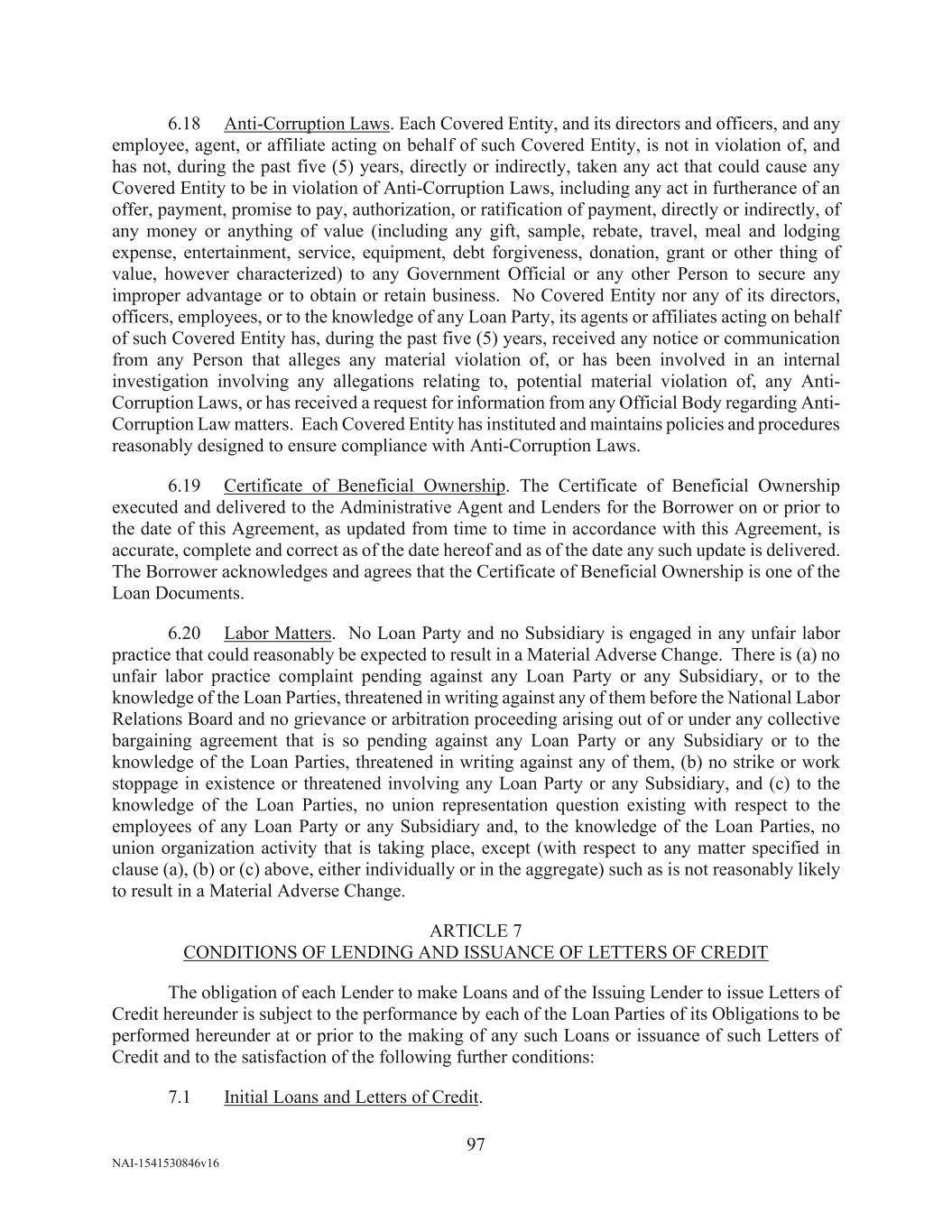 NAI-1541530846v16 97 6.18 Anti-Corruption Laws. Each Covered Entity, and its directors and officers, and any employee, agent, or affiliate acting on behalf of such Covered Entity, is not in violation of, and has not, during the past five (5) years, directly or indirectly, taken any act that could cause any Covered Entity to be in violation of Anti-Corruption Laws, including any act in furtherance of an offer, payment, promise to pay, authorization, or ratification of payment, directly or indirectly, of any money or anything of value (including any gift, sample, rebate, travel, meal and lodging expense, entertainment, service, equipment, debt forgiveness, donation, grant or other thing of value, however characterized) to any Government Official or any other Person to secure any improper advantage or to obtain or retain business. No Covered Entity nor any of its directors, officers, employees, or to the knowledge of any Loan Party, its agents or affiliates acting on behalf of such Covered Entity has, during the past five (5) years, received any notice or communication from any Person that alleges any material violation of, or has been involved in an internal investigation involving any allegations relating to, potential material violation of, any Anti- Corruption Laws, or has received a request for information from any Official Body regarding Anti- Corruption Law matters. Each Covered Entity has instituted and maintains policies and procedures reasonably designed to ensure compliance with Anti-Corruption Laws. 6.19 Certificate of Beneficial Ownership. The Certificate of Beneficial Ownership executed and delivered to the Administrative Agent and Lenders for the Borrower on or prior to the date of this Agreement, as updated from time to time in accordance with this Agreement, is accurate, complete and correct as of the date hereof and as of the date any such update is delivered. The Borrower acknowledges and agrees that the Certificate of Beneficial Ownership is one of the Loan Documents. 6.20 Labor Matters. No Loan Party and no Subsidiary is engaged in any unfair labor practice that could reasonably be expected to result in a Material Adverse Change. There is (a) no unfair labor practice complaint pending against any Loan Party or any Subsidiary, or to the knowledge of the Loan Parties, threatened in writing against any of them before the National Labor Relations Board and no grievance or arbitration proceeding arising out of or under any collective bargaining agreement that is so pending against any Loan Party or any Subsidiary or to the knowledge of the Loan Parties, threatened in writing against any of them, (b) no strike or work stoppage in existence or threatened involving any Loan Party or any Subsidiary, and (c) to the knowledge of the Loan Parties, no union representation question existing with respect to the employees of any Loan Party or any Subsidiary and, to the knowledge of the Loan Parties, no union organization activity that is taking place, except (with respect to any matter specified in clause (a), (b) or (c) above, either individually or in the aggregate) such as is not reasonably likely to result in a Material Adverse Change. ARTICLE 7 CONDITIONS OF LENDING AND ISSUANCE OF LETTERS OF CREDIT The obligation of each Lender to make Loans and of the Issuing Lender to issue Letters of Credit hereunder is subject to the performance by each of the Loan Parties of its Obligations to be performed hereunder at or prior to the making of any such Loans or issuance of such Letters of Credit and to the satisfaction of the following further conditions: 7.1 Initial Loans and Letters of Credit.