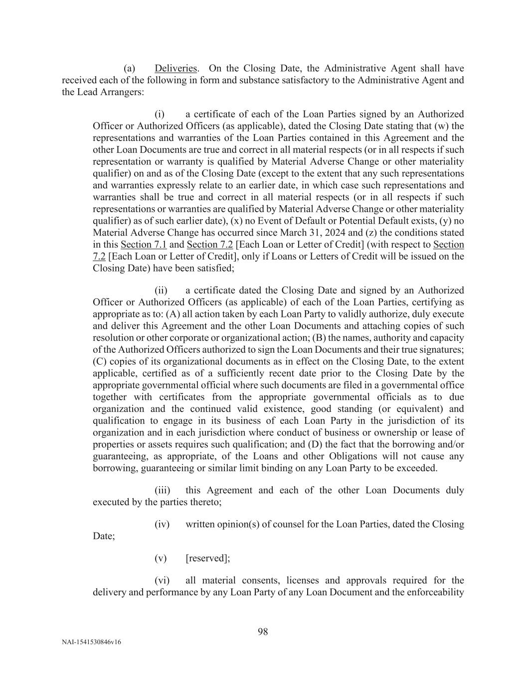 NAI-1541530846v16 98 (a) Deliveries. On the Closing Date, the Administrative Agent shall have received each of the following in form and substance satisfactory to the Administrative Agent and the Lead Arrangers: (i) a certificate of each of the Loan Parties signed by an Authorized Officer or Authorized Officers (as applicable), dated the Closing Date stating that (w) the representations and warranties of the Loan Parties contained in this Agreement and the other Loan Documents are true and correct in all material respects (or in all respects if such representation or warranty is qualified by Material Adverse Change or other materiality qualifier) on and as of the Closing Date (except to the extent that any such representations and warranties expressly relate to an earlier date, in which case such representations and warranties shall be true and correct in all material respects (or in all respects if such representations or warranties are qualified by Material Adverse Change or other materiality qualifier) as of such earlier date), (x) no Event of Default or Potential Default exists, (y) no Material Adverse Change has occurred since March 31, 2024 and (z) the conditions stated in this Section 7.1 and Section 7.2 [Each Loan or Letter of Credit] (with respect to Section 7.2 [Each Loan or Letter of Credit], only if Loans or Letters of Credit will be issued on the Closing Date) have been satisfied; (ii) a certificate dated the Closing Date and signed by an Authorized Officer or Authorized Officers (as applicable) of each of the Loan Parties, certifying as appropriate as to: (A) all action taken by each Loan Party to validly authorize, duly execute and deliver this Agreement and the other Loan Documents and attaching copies of such resolution or other corporate or organizational action; (B) the names, authority and capacity of the Authorized Officers authorized to sign the Loan Documents and their true signatures; (C) copies of its organizational documents as in effect on the Closing Date, to the extent applicable, certified as of a sufficiently recent date prior to the Closing Date by the appropriate governmental official where such documents are filed in a governmental office together with certificates from the appropriate governmental officials as to due organization and the continued valid existence, good standing (or equivalent) and qualification to engage in its business of each Loan Party in the jurisdiction of its organization and in each jurisdiction where conduct of business or ownership or lease of properties or assets requires such qualification; and (D) the fact that the borrowing and/or guaranteeing, as appropriate, of the Loans and other Obligations will not cause any borrowing, guaranteeing or similar limit binding on any Loan Party to be exceeded. (iii) this Agreement and each of the other Loan Documents duly executed by the parties thereto; (iv) written opinion(s) of counsel for the Loan Parties, dated the Closing Date; (v) [reserved]; (vi) all material consents, licenses and approvals required for the delivery and performance by any Loan Party of any Loan Document and the enforceability