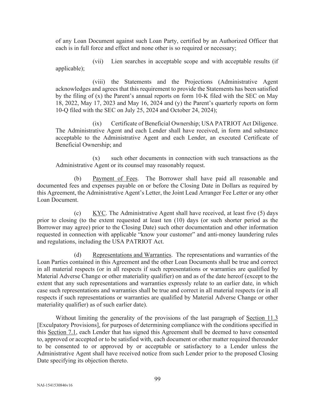 NAI-1541530846v16 99 of any Loan Document against such Loan Party, certified by an Authorized Officer that each is in full force and effect and none other is so required or necessary; (vii) Lien searches in acceptable scope and with acceptable results (if applicable); (viii) the Statements and the Projections (Administrative Agent acknowledges and agrees that this requirement to provide the Statements has been satisfied by the filing of (x) the Parent’s annual reports on form 10-K filed with the SEC on May 18, 2022, May 17, 2023 and May 16, 2024 and (y) the Parent’s quarterly reports on form 10-Q filed with the SEC on July 25, 2024 and October 24, 2024); (ix) Certificate of Beneficial Ownership; USA PATRIOT Act Diligence. The Administrative Agent and each Lender shall have received, in form and substance acceptable to the Administrative Agent and each Lender, an executed Certificate of Beneficial Ownership; and (x) such other documents in connection with such transactions as the Administrative Agent or its counsel may reasonably request. (b) Payment of Fees. The Borrower shall have paid all reasonable and documented fees and expenses payable on or before the Closing Date in Dollars as required by this Agreement, the Administrative Agent’s Letter, the Joint Lead Arranger Fee Letter or any other Loan Document. (c) KYC. The Administrative Agent shall have received, at least five (5) days prior to closing (to the extent requested at least ten (10) days (or such shorter period as the Borrower may agree) prior to the Closing Date) such other documentation and other information requested in connection with applicable “know your customer” and anti-money laundering rules and regulations, including the USA PATRIOT Act. (d) Representations and Warranties. The representations and warranties of the Loan Parties contained in this Agreement and the other Loan Documents shall be true and correct in all material respects (or in all respects if such representations or warranties are qualified by Material Adverse Change or other materiality qualifier) on and as of the date hereof (except to the extent that any such representations and warranties expressly relate to an earlier date, in which case such representations and warranties shall be true and correct in all material respects (or in all respects if such representations or warranties are qualified by Material Adverse Change or other materiality qualifier) as of such earlier date). Without limiting the generality of the provisions of the last paragraph of Section 11.3 [Exculpatory Provisions], for purposes of determining compliance with the conditions specified in this Section 7.1, each Lender that has signed this Agreement shall be deemed to have consented to, approved or accepted or to be satisfied with, each document or other matter required thereunder to be consented to or approved by or acceptable or satisfactory to a Lender unless the Administrative Agent shall have received notice from such Lender prior to the proposed Closing Date specifying its objection thereto.