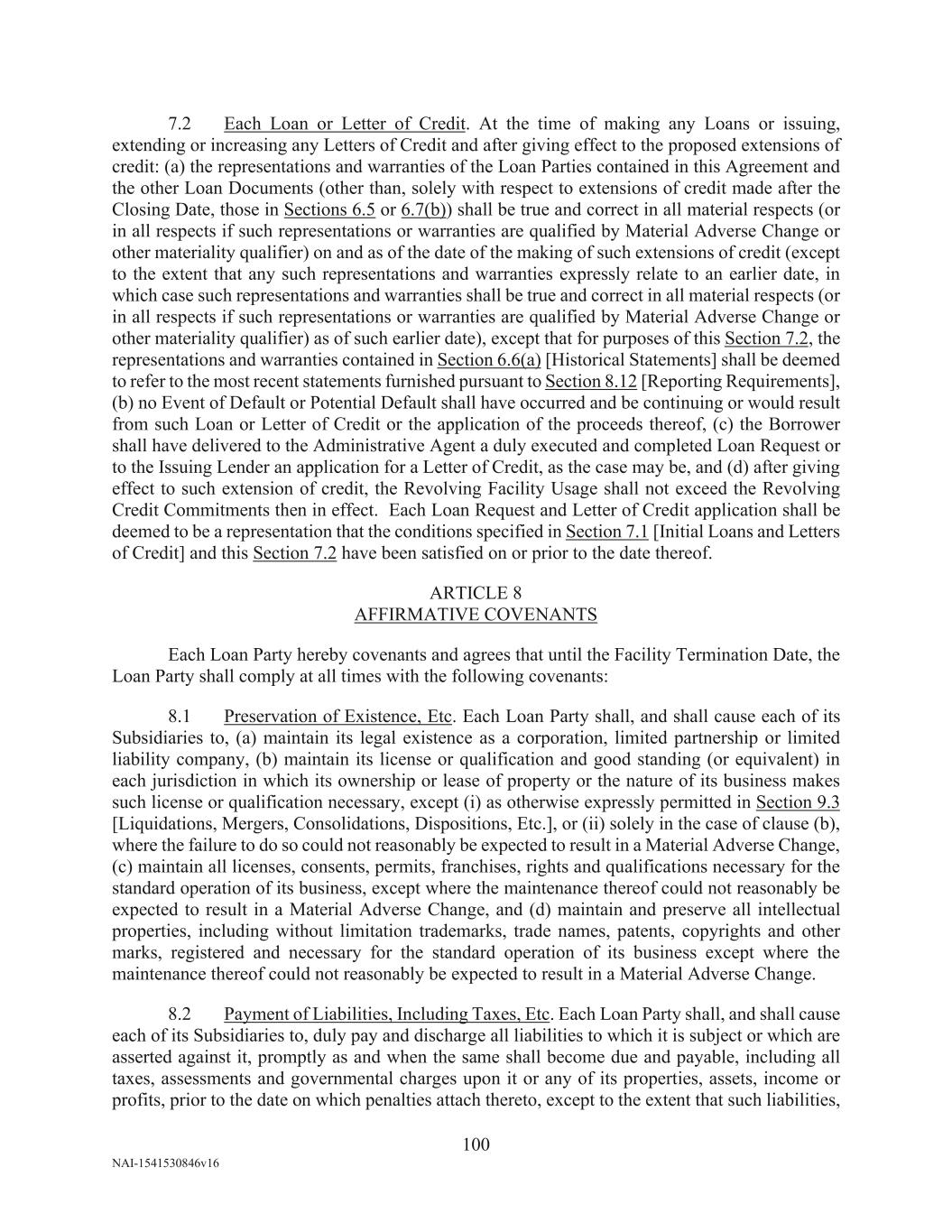NAI-1541530846v16 100 7.2 Each Loan or Letter of Credit. At the time of making any Loans or issuing, extending or increasing any Letters of Credit and after giving effect to the proposed extensions of credit: (a) the representations and warranties of the Loan Parties contained in this Agreement and the other Loan Documents (other than, solely with respect to extensions of credit made after the Closing Date, those in Sections 6.5 or 6.7(b)) shall be true and correct in all material respects (or in all respects if such representations or warranties are qualified by Material Adverse Change or other materiality qualifier) on and as of the date of the making of such extensions of credit (except to the extent that any such representations and warranties expressly relate to an earlier date, in which case such representations and warranties shall be true and correct in all material respects (or in all respects if such representations or warranties are qualified by Material Adverse Change or other materiality qualifier) as of such earlier date), except that for purposes of this Section 7.2, the representations and warranties contained in Section 6.6(a) [Historical Statements] shall be deemed to refer to the most recent statements furnished pursuant to Section 8.12 [Reporting Requirements], (b) no Event of Default or Potential Default shall have occurred and be continuing or would result from such Loan or Letter of Credit or the application of the proceeds thereof, (c) the Borrower shall have delivered to the Administrative Agent a duly executed and completed Loan Request or to the Issuing Lender an application for a Letter of Credit, as the case may be, and (d) after giving effect to such extension of credit, the Revolving Facility Usage shall not exceed the Revolving Credit Commitments then in effect. Each Loan Request and Letter of Credit application shall be deemed to be a representation that the conditions specified in Section 7.1 [Initial Loans and Letters of Credit] and this Section 7.2 have been satisfied on or prior to the date thereof. ARTICLE 8 AFFIRMATIVE COVENANTS Each Loan Party hereby covenants and agrees that until the Facility Termination Date, the Loan Party shall comply at all times with the following covenants: 8.1 Preservation of Existence, Etc. Each Loan Party shall, and shall cause each of its Subsidiaries to, (a) maintain its legal existence as a corporation, limited partnership or limited liability company, (b) maintain its license or qualification and good standing (or equivalent) in each jurisdiction in which its ownership or lease of property or the nature of its business makes such license or qualification necessary, except (i) as otherwise expressly permitted in Section 9.3 [Liquidations, Mergers, Consolidations, Dispositions, Etc.], or (ii) solely in the case of clause (b), where the failure to do so could not reasonably be expected to result in a Material Adverse Change, (c) maintain all licenses, consents, permits, franchises, rights and qualifications necessary for the standard operation of its business, except where the maintenance thereof could not reasonably be expected to result in a Material Adverse Change, and (d) maintain and preserve all intellectual properties, including without limitation trademarks, trade names, patents, copyrights and other marks, registered and necessary for the standard operation of its business except where the maintenance thereof could not reasonably be expected to result in a Material Adverse Change. 8.2 Payment of Liabilities, Including Taxes, Etc. Each Loan Party shall, and shall cause each of its Subsidiaries to, duly pay and discharge all liabilities to which it is subject or which are asserted against it, promptly as and when the same shall become due and payable, including all taxes, assessments and governmental charges upon it or any of its properties, assets, income or profits, prior to the date on which penalties attach thereto, except to the extent that such liabilities,
