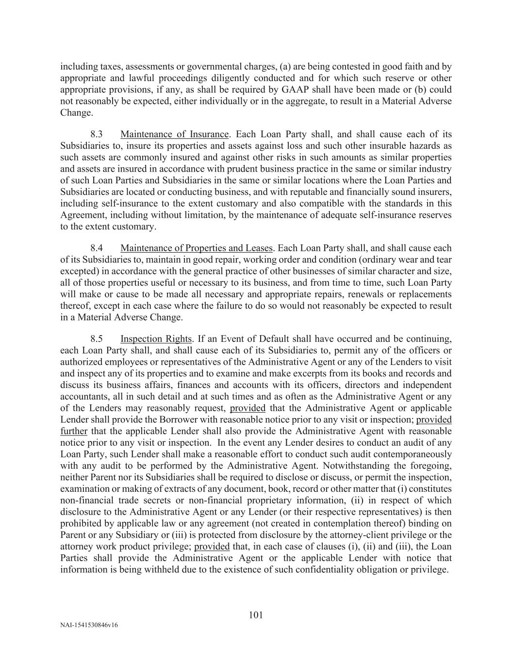 NAI-1541530846v16 101 including taxes, assessments or governmental charges, (a) are being contested in good faith and by appropriate and lawful proceedings diligently conducted and for which such reserve or other appropriate provisions, if any, as shall be required by GAAP shall have been made or (b) could not reasonably be expected, either individually or in the aggregate, to result in a Material Adverse Change. 8.3 Maintenance of Insurance. Each Loan Party shall, and shall cause each of its Subsidiaries to, insure its properties and assets against loss and such other insurable hazards as such assets are commonly insured and against other risks in such amounts as similar properties and assets are insured in accordance with prudent business practice in the same or similar industry of such Loan Parties and Subsidiaries in the same or similar locations where the Loan Parties and Subsidiaries are located or conducting business, and with reputable and financially sound insurers, including self-insurance to the extent customary and also compatible with the standards in this Agreement, including without limitation, by the maintenance of adequate self-insurance reserves to the extent customary. 8.4 Maintenance of Properties and Leases. Each Loan Party shall, and shall cause each of its Subsidiaries to, maintain in good repair, working order and condition (ordinary wear and tear excepted) in accordance with the general practice of other businesses of similar character and size, all of those properties useful or necessary to its business, and from time to time, such Loan Party will make or cause to be made all necessary and appropriate repairs, renewals or replacements thereof, except in each case where the failure to do so would not reasonably be expected to result in a Material Adverse Change. 8.5 Inspection Rights. If an Event of Default shall have occurred and be continuing, each Loan Party shall, and shall cause each of its Subsidiaries to, permit any of the officers or authorized employees or representatives of the Administrative Agent or any of the Lenders to visit and inspect any of its properties and to examine and make excerpts from its books and records and discuss its business affairs, finances and accounts with its officers, directors and independent accountants, all in such detail and at such times and as often as the Administrative Agent or any of the Lenders may reasonably request, provided that the Administrative Agent or applicable Lender shall provide the Borrower with reasonable notice prior to any visit or inspection; provided further that the applicable Lender shall also provide the Administrative Agent with reasonable notice prior to any visit or inspection. In the event any Lender desires to conduct an audit of any Loan Party, such Lender shall make a reasonable effort to conduct such audit contemporaneously with any audit to be performed by the Administrative Agent. Notwithstanding the foregoing, neither Parent nor its Subsidiaries shall be required to disclose or discuss, or permit the inspection, examination or making of extracts of any document, book, record or other matter that (i) constitutes non-financial trade secrets or non-financial proprietary information, (ii) in respect of which disclosure to the Administrative Agent or any Lender (or their respective representatives) is then prohibited by applicable law or any agreement (not created in contemplation thereof) binding on Parent or any Subsidiary or (iii) is protected from disclosure by the attorney-client privilege or the attorney work product privilege; provided that, in each case of clauses (i), (ii) and (iii), the Loan Parties shall provide the Administrative Agent or the applicable Lender with notice that information is being withheld due to the existence of such confidentiality obligation or privilege.