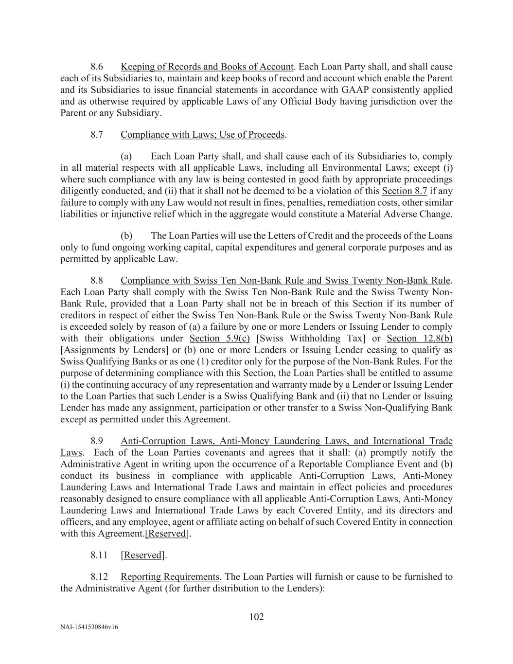 NAI-1541530846v16 102 8.6 Keeping of Records and Books of Account. Each Loan Party shall, and shall cause each of its Subsidiaries to, maintain and keep books of record and account which enable the Parent and its Subsidiaries to issue financial statements in accordance with GAAP consistently applied and as otherwise required by applicable Laws of any Official Body having jurisdiction over the Parent or any Subsidiary. 8.7 Compliance with Laws; Use of Proceeds. (a) Each Loan Party shall, and shall cause each of its Subsidiaries to, comply in all material respects with all applicable Laws, including all Environmental Laws; except (i) where such compliance with any law is being contested in good faith by appropriate proceedings diligently conducted, and (ii) that it shall not be deemed to be a violation of this Section 8.7 if any failure to comply with any Law would not result in fines, penalties, remediation costs, other similar liabilities or injunctive relief which in the aggregate would constitute a Material Adverse Change. (b) The Loan Parties will use the Letters of Credit and the proceeds of the Loans only to fund ongoing working capital, capital expenditures and general corporate purposes and as permitted by applicable Law. 8.8 Compliance with Swiss Ten Non-Bank Rule and Swiss Twenty Non-Bank Rule. Each Loan Party shall comply with the Swiss Ten Non-Bank Rule and the Swiss Twenty Non- Bank Rule, provided that a Loan Party shall not be in breach of this Section if its number of creditors in respect of either the Swiss Ten Non-Bank Rule or the Swiss Twenty Non-Bank Rule is exceeded solely by reason of (a) a failure by one or more Lenders or Issuing Lender to comply with their obligations under Section 5.9(c) [Swiss Withholding Tax] or Section 12.8(b) [Assignments by Lenders] or (b) one or more Lenders or Issuing Lender ceasing to qualify as Swiss Qualifying Banks or as one (1) creditor only for the purpose of the Non-Bank Rules. For the purpose of determining compliance with this Section, the Loan Parties shall be entitled to assume (i) the continuing accuracy of any representation and warranty made by a Lender or Issuing Lender to the Loan Parties that such Lender is a Swiss Qualifying Bank and (ii) that no Lender or Issuing Lender has made any assignment, participation or other transfer to a Swiss Non-Qualifying Bank except as permitted under this Agreement. 8.9 Anti-Corruption Laws, Anti-Money Laundering Laws, and International Trade Laws. Each of the Loan Parties covenants and agrees that it shall: (a) promptly notify the Administrative Agent in writing upon the occurrence of a Reportable Compliance Event and (b) conduct its business in compliance with applicable Anti-Corruption Laws, Anti-Money Laundering Laws and International Trade Laws and maintain in effect policies and procedures reasonably designed to ensure compliance with all applicable Anti-Corruption Laws, Anti-Money Laundering Laws and International Trade Laws by each Covered Entity, and its directors and officers, and any employee, agent or affiliate acting on behalf of such Covered Entity in connection with this Agreement.[Reserved]. 8.11 [Reserved]. 8.12 Reporting Requirements. The Loan Parties will furnish or cause to be furnished to the Administrative Agent (for further distribution to the Lenders):
