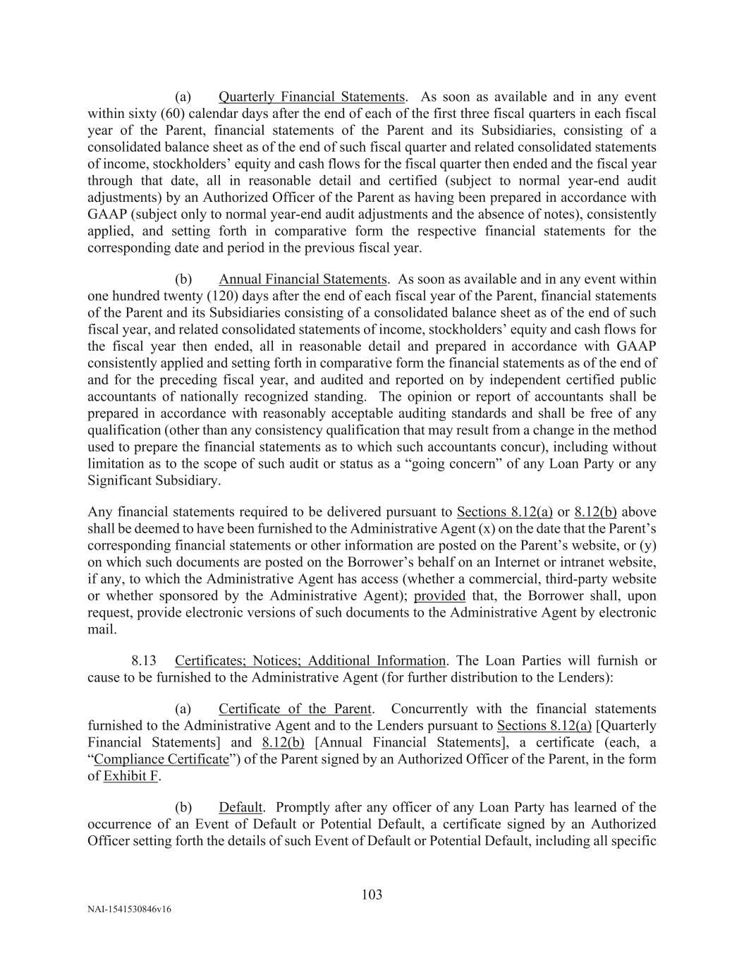 NAI-1541530846v16 103 (a) Quarterly Financial Statements. As soon as available and in any event within sixty (60) calendar days after the end of each of the first three fiscal quarters in each fiscal year of the Parent, financial statements of the Parent and its Subsidiaries, consisting of a consolidated balance sheet as of the end of such fiscal quarter and related consolidated statements of income, stockholders’ equity and cash flows for the fiscal quarter then ended and the fiscal year through that date, all in reasonable detail and certified (subject to normal year-end audit adjustments) by an Authorized Officer of the Parent as having been prepared in accordance with GAAP (subject only to normal year-end audit adjustments and the absence of notes), consistently applied, and setting forth in comparative form the respective financial statements for the corresponding date and period in the previous fiscal year. (b) Annual Financial Statements. As soon as available and in any event within one hundred twenty (120) days after the end of each fiscal year of the Parent, financial statements of the Parent and its Subsidiaries consisting of a consolidated balance sheet as of the end of such fiscal year, and related consolidated statements of income, stockholders’ equity and cash flows for the fiscal year then ended, all in reasonable detail and prepared in accordance with GAAP consistently applied and setting forth in comparative form the financial statements as of the end of and for the preceding fiscal year, and audited and reported on by independent certified public accountants of nationally recognized standing. The opinion or report of accountants shall be prepared in accordance with reasonably acceptable auditing standards and shall be free of any qualification (other than any consistency qualification that may result from a change in the method used to prepare the financial statements as to which such accountants concur), including without limitation as to the scope of such audit or status as a “going concern” of any Loan Party or any Significant Subsidiary. Any financial statements required to be delivered pursuant to Sections 8.12(a) or 8.12(b) above shall be deemed to have been furnished to the Administrative Agent (x) on the date that the Parent’s corresponding financial statements or other information are posted on the Parent’s website, or (y) on which such documents are posted on the Borrower’s behalf on an Internet or intranet website, if any, to which the Administrative Agent has access (whether a commercial, third-party website or whether sponsored by the Administrative Agent); provided that, the Borrower shall, upon request, provide electronic versions of such documents to the Administrative Agent by electronic mail. 8.13 Certificates; Notices; Additional Information. The Loan Parties will furnish or cause to be furnished to the Administrative Agent (for further distribution to the Lenders): (a) Certificate of the Parent. Concurrently with the financial statements furnished to the Administrative Agent and to the Lenders pursuant to Sections 8.12(a) [Quarterly Financial Statements] and 8.12(b) [Annual Financial Statements], a certificate (each, a “Compliance Certificate”) of the Parent signed by an Authorized Officer of the Parent, in the form of Exhibit F. (b) Default. Promptly after any officer of any Loan Party has learned of the occurrence of an Event of Default or Potential Default, a certificate signed by an Authorized Officer setting forth the details of such Event of Default or Potential Default, including all specific