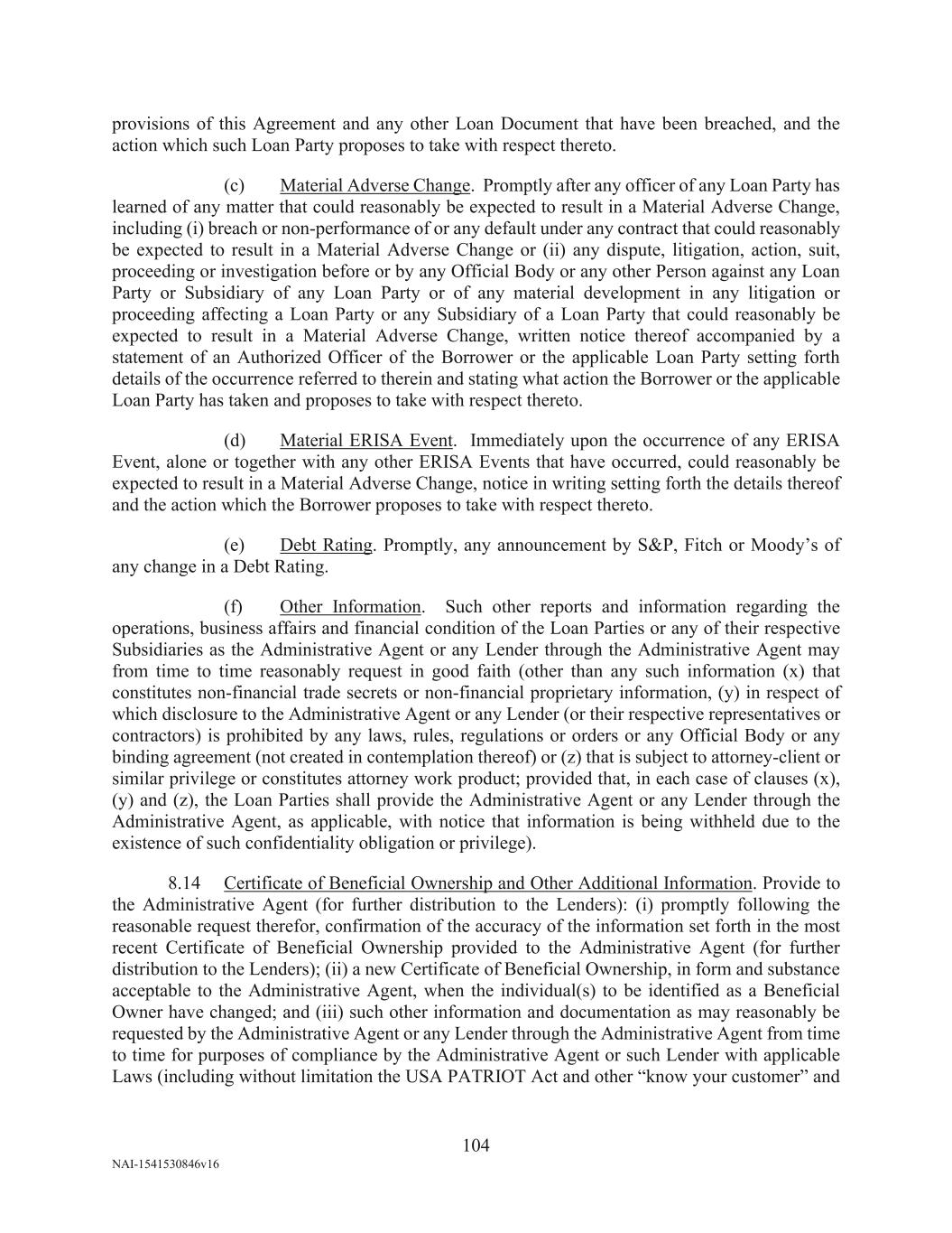 NAI-1541530846v16 104 provisions of this Agreement and any other Loan Document that have been breached, and the action which such Loan Party proposes to take with respect thereto. (c) Material Adverse Change. Promptly after any officer of any Loan Party has learned of any matter that could reasonably be expected to result in a Material Adverse Change, including (i) breach or non-performance of or any default under any contract that could reasonably be expected to result in a Material Adverse Change or (ii) any dispute, litigation, action, suit, proceeding or investigation before or by any Official Body or any other Person against any Loan Party or Subsidiary of any Loan Party or of any material development in any litigation or proceeding affecting a Loan Party or any Subsidiary of a Loan Party that could reasonably be expected to result in a Material Adverse Change, written notice thereof accompanied by a statement of an Authorized Officer of the Borrower or the applicable Loan Party setting forth details of the occurrence referred to therein and stating what action the Borrower or the applicable Loan Party has taken and proposes to take with respect thereto. (d) Material ERISA Event. Immediately upon the occurrence of any ERISA Event, alone or together with any other ERISA Events that have occurred, could reasonably be expected to result in a Material Adverse Change, notice in writing setting forth the details thereof and the action which the Borrower proposes to take with respect thereto. (e) Debt Rating. Promptly, any announcement by S&P, Fitch or Moody’s of any change in a Debt Rating. (f) Other Information. Such other reports and information regarding the operations, business affairs and financial condition of the Loan Parties or any of their respective Subsidiaries as the Administrative Agent or any Lender through the Administrative Agent may from time to time reasonably request in good faith (other than any such information (x) that constitutes non-financial trade secrets or non-financial proprietary information, (y) in respect of which disclosure to the Administrative Agent or any Lender (or their respective representatives or contractors) is prohibited by any laws, rules, regulations or orders or any Official Body or any binding agreement (not created in contemplation thereof) or (z) that is subject to attorney-client or similar privilege or constitutes attorney work product; provided that, in each case of clauses (x), (y) and (z), the Loan Parties shall provide the Administrative Agent or any Lender through the Administrative Agent, as applicable, with notice that information is being withheld due to the existence of such confidentiality obligation or privilege). 8.14 Certificate of Beneficial Ownership and Other Additional Information. Provide to the Administrative Agent (for further distribution to the Lenders): (i) promptly following the reasonable request therefor, confirmation of the accuracy of the information set forth in the most recent Certificate of Beneficial Ownership provided to the Administrative Agent (for further distribution to the Lenders); (ii) a new Certificate of Beneficial Ownership, in form and substance acceptable to the Administrative Agent, when the individual(s) to be identified as a Beneficial Owner have changed; and (iii) such other information and documentation as may reasonably be requested by the Administrative Agent or any Lender through the Administrative Agent from time to time for purposes of compliance by the Administrative Agent or such Lender with applicable Laws (including without limitation the USA PATRIOT Act and other “know your customer” and