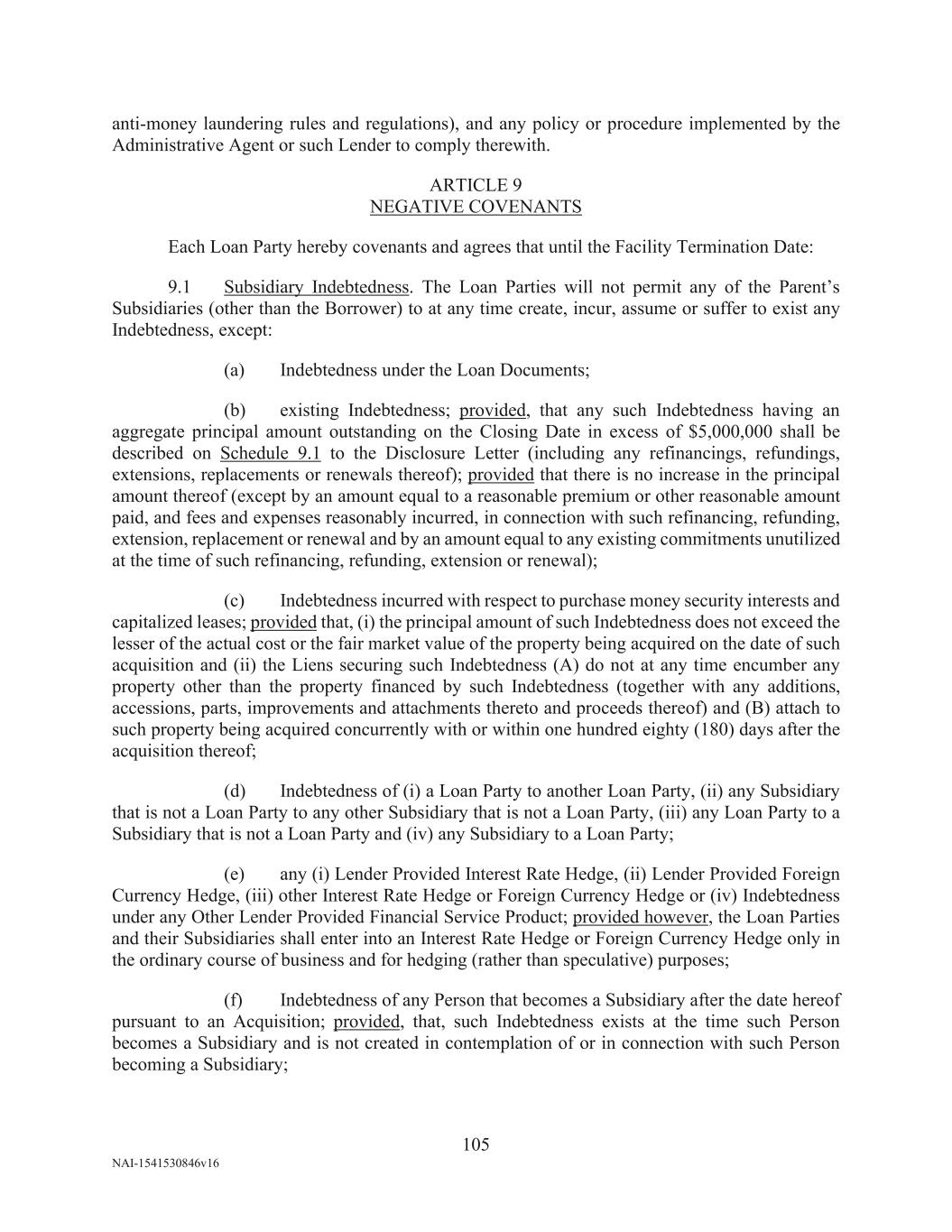 NAI-1541530846v16 105 anti-money laundering rules and regulations), and any policy or procedure implemented by the Administrative Agent or such Lender to comply therewith. ARTICLE 9 NEGATIVE COVENANTS Each Loan Party hereby covenants and agrees that until the Facility Termination Date: 9.1 Subsidiary Indebtedness. The Loan Parties will not permit any of the Parent’s Subsidiaries (other than the Borrower) to at any time create, incur, assume or suffer to exist any Indebtedness, except: (a) Indebtedness under the Loan Documents; (b) existing Indebtedness; provided, that any such Indebtedness having an aggregate principal amount outstanding on the Closing Date in excess of $5,000,000 shall be described on Schedule 9.1 to the Disclosure Letter (including any refinancings, refundings, extensions, replacements or renewals thereof); provided that there is no increase in the principal amount thereof (except by an amount equal to a reasonable premium or other reasonable amount paid, and fees and expenses reasonably incurred, in connection with such refinancing, refunding, extension, replacement or renewal and by an amount equal to any existing commitments unutilized at the time of such refinancing, refunding, extension or renewal); (c) Indebtedness incurred with respect to purchase money security interests and capitalized leases; provided that, (i) the principal amount of such Indebtedness does not exceed the lesser of the actual cost or the fair market value of the property being acquired on the date of such acquisition and (ii) the Liens securing such Indebtedness (A) do not at any time encumber any property other than the property financed by such Indebtedness (together with any additions, accessions, parts, improvements and attachments thereto and proceeds thereof) and (B) attach to such property being acquired concurrently with or within one hundred eighty (180) days after the acquisition thereof; (d) Indebtedness of (i) a Loan Party to another Loan Party, (ii) any Subsidiary that is not a Loan Party to any other Subsidiary that is not a Loan Party, (iii) any Loan Party to a Subsidiary that is not a Loan Party and (iv) any Subsidiary to a Loan Party; (e) any (i) Lender Provided Interest Rate Hedge, (ii) Lender Provided Foreign Currency Hedge, (iii) other Interest Rate Hedge or Foreign Currency Hedge or (iv) Indebtedness under any Other Lender Provided Financial Service Product; provided however, the Loan Parties and their Subsidiaries shall enter into an Interest Rate Hedge or Foreign Currency Hedge only in the ordinary course of business and for hedging (rather than speculative) purposes; (f) Indebtedness of any Person that becomes a Subsidiary after the date hereof pursuant to an Acquisition; provided, that, such Indebtedness exists at the time such Person becomes a Subsidiary and is not created in contemplation of or in connection with such Person becoming a Subsidiary;