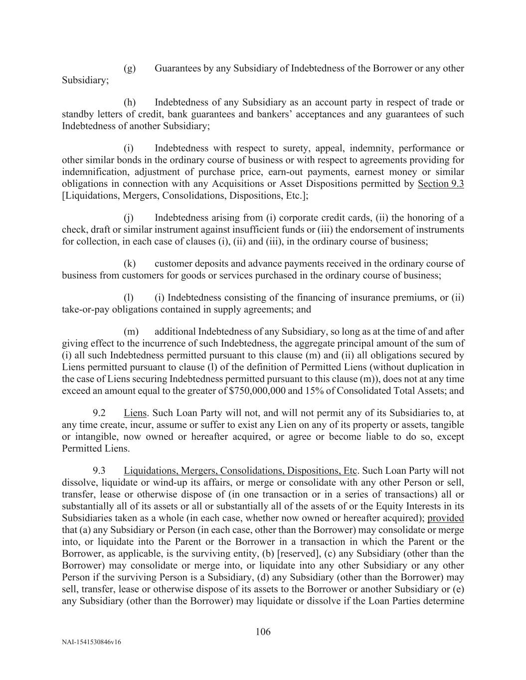 NAI-1541530846v16 106 (g) Guarantees by any Subsidiary of Indebtedness of the Borrower or any other Subsidiary; (h) Indebtedness of any Subsidiary as an account party in respect of trade or standby letters of credit, bank guarantees and bankers’ acceptances and any guarantees of such Indebtedness of another Subsidiary; (i) Indebtedness with respect to surety, appeal, indemnity, performance or other similar bonds in the ordinary course of business or with respect to agreements providing for indemnification, adjustment of purchase price, earn-out payments, earnest money or similar obligations in connection with any Acquisitions or Asset Dispositions permitted by Section 9.3 [Liquidations, Mergers, Consolidations, Dispositions, Etc.]; (j) Indebtedness arising from (i) corporate credit cards, (ii) the honoring of a check, draft or similar instrument against insufficient funds or (iii) the endorsement of instruments for collection, in each case of clauses (i), (ii) and (iii), in the ordinary course of business; (k) customer deposits and advance payments received in the ordinary course of business from customers for goods or services purchased in the ordinary course of business; (l) (i) Indebtedness consisting of the financing of insurance premiums, or (ii) take-or-pay obligations contained in supply agreements; and (m) additional Indebtedness of any Subsidiary, so long as at the time of and after giving effect to the incurrence of such Indebtedness, the aggregate principal amount of the sum of (i) all such Indebtedness permitted pursuant to this clause (m) and (ii) all obligations secured by Liens permitted pursuant to clause (l) of the definition of Permitted Liens (without duplication in the case of Liens securing Indebtedness permitted pursuant to this clause (m)), does not at any time exceed an amount equal to the greater of $750,000,000 and 15% of Consolidated Total Assets; and 9.2 Liens. Such Loan Party will not, and will not permit any of its Subsidiaries to, at any time create, incur, assume or suffer to exist any Lien on any of its property or assets, tangible or intangible, now owned or hereafter acquired, or agree or become liable to do so, except Permitted Liens. 9.3 Liquidations, Mergers, Consolidations, Dispositions, Etc. Such Loan Party will not dissolve, liquidate or wind-up its affairs, or merge or consolidate with any other Person or sell, transfer, lease or otherwise dispose of (in one transaction or in a series of transactions) all or substantially all of its assets or all or substantially all of the assets of or the Equity Interests in its Subsidiaries taken as a whole (in each case, whether now owned or hereafter acquired); provided that (a) any Subsidiary or Person (in each case, other than the Borrower) may consolidate or merge into, or liquidate into the Parent or the Borrower in a transaction in which the Parent or the Borrower, as applicable, is the surviving entity, (b) [reserved], (c) any Subsidiary (other than the Borrower) may consolidate or merge into, or liquidate into any other Subsidiary or any other Person if the surviving Person is a Subsidiary, (d) any Subsidiary (other than the Borrower) may sell, transfer, lease or otherwise dispose of its assets to the Borrower or another Subsidiary or (e) any Subsidiary (other than the Borrower) may liquidate or dissolve if the Loan Parties determine