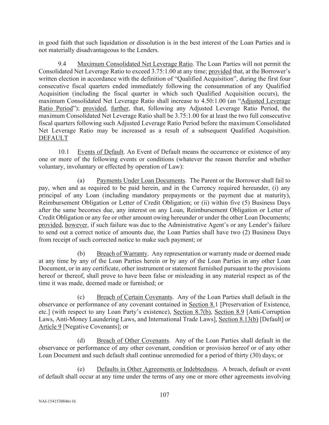 NAI-1541530846v16 107 in good faith that such liquidation or dissolution is in the best interest of the Loan Parties and is not materially disadvantageous to the Lenders. 9.4 Maximum Consolidated Net Leverage Ratio. The Loan Parties will not permit the Consolidated Net Leverage Ratio to exceed 3.75:1.00 at any time; provided that, at the Borrower’s written election in accordance with the definition of “Qualified Acquisition”, during the first four consecutive fiscal quarters ended immediately following the consummation of any Qualified Acquisition (including the fiscal quarter in which such Qualified Acquisition occurs), the maximum Consolidated Net Leverage Ratio shall increase to 4.50:1.00 (an “Adjusted Leverage Ratio Period”); provided, further, that, following any Adjusted Leverage Ratio Period, the maximum Consolidated Net Leverage Ratio shall be 3.75:1.00 for at least the two full consecutive fiscal quarters following such Adjusted Leverage Ratio Period before the maximum Consolidated Net Leverage Ratio may be increased as a result of a subsequent Qualified Acquisition. DEFAULT 10.1 Events of Default. An Event of Default means the occurrence or existence of any one or more of the following events or conditions (whatever the reason therefor and whether voluntary, involuntary or effected by operation of Law): (a) Payments Under Loan Documents. The Parent or the Borrower shall fail to pay, when and as required to be paid herein, and in the Currency required hereunder, (i) any principal of any Loan (including mandatory prepayments or the payment due at maturity), Reimbursement Obligation or Letter of Credit Obligation; or (ii) within five (5) Business Days after the same becomes due, any interest on any Loan, Reimbursement Obligation or Letter of Credit Obligation or any fee or other amount owing hereunder or under the other Loan Documents; provided, however, if such failure was due to the Administrative Agent’s or any Lender’s failure to send out a correct notice of amounts due, the Loan Parties shall have two (2) Business Days from receipt of such corrected notice to make such payment; or (b) Breach of Warranty. Any representation or warranty made or deemed made at any time by any of the Loan Parties herein or by any of the Loan Parties in any other Loan Document, or in any certificate, other instrument or statement furnished pursuant to the provisions hereof or thereof, shall prove to have been false or misleading in any material respect as of the time it was made, deemed made or furnished; or (c) Breach of Certain Covenants. Any of the Loan Parties shall default in the observance or performance of any covenant contained in Section 8.1 [Preservation of Existence, etc.] (with respect to any Loan Party’s existence), Section 8.7(b), Section 8.9 [Anti-Corruption Laws, Anti-Money Laundering Laws, and International Trade Laws], Section 8.13(b) [Default] or Article 9 [Negative Covenants]; or (d) Breach of Other Covenants. Any of the Loan Parties shall default in the observance or performance of any other covenant, condition or provision hereof or of any other Loan Document and such default shall continue unremedied for a period of thirty (30) days; or (e) Defaults in Other Agreements or Indebtedness. A breach, default or event of default shall occur at any time under the terms of any one or more other agreements involving