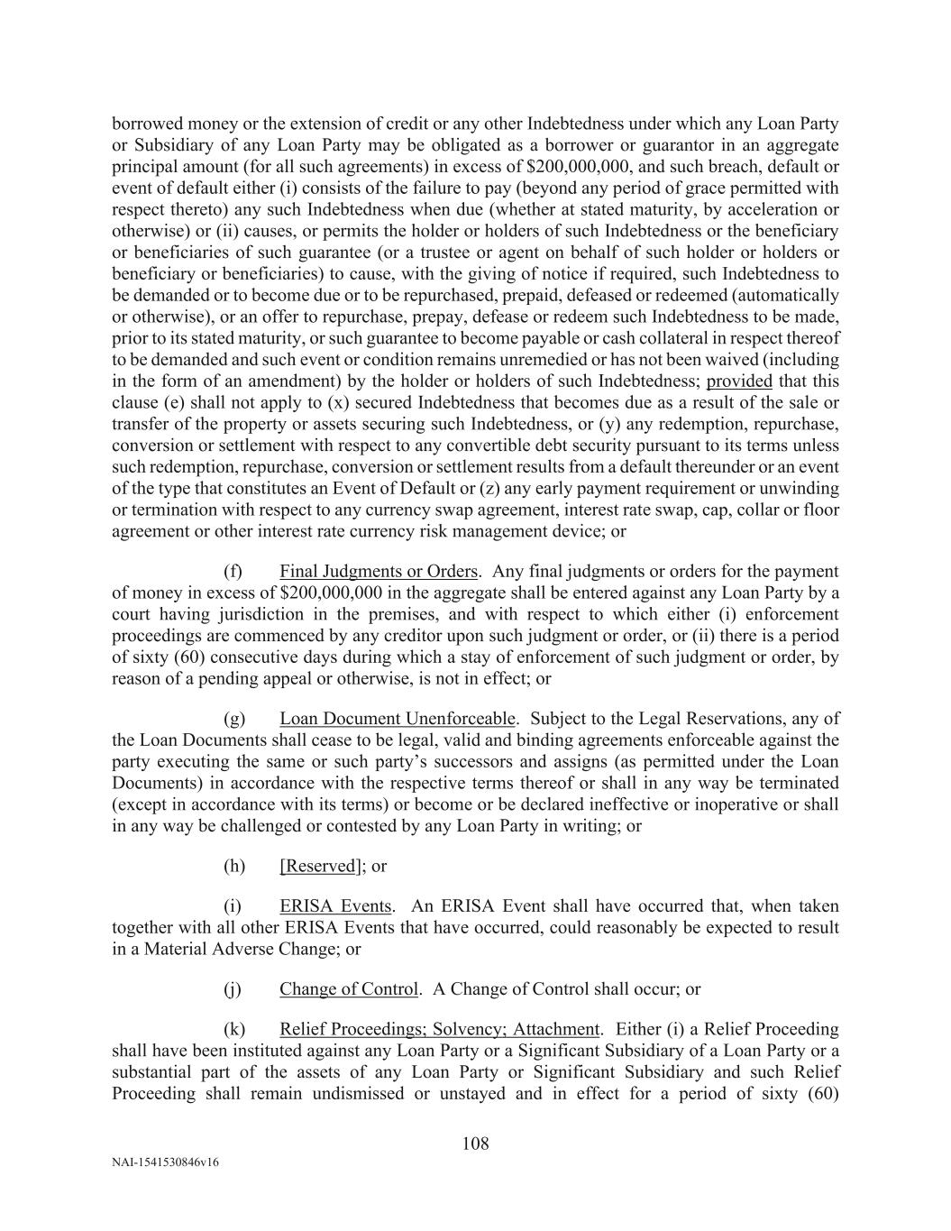 NAI-1541530846v16 108 borrowed money or the extension of credit or any other Indebtedness under which any Loan Party or Subsidiary of any Loan Party may be obligated as a borrower or guarantor in an aggregate principal amount (for all such agreements) in excess of $200,000,000, and such breach, default or event of default either (i) consists of the failure to pay (beyond any period of grace permitted with respect thereto) any such Indebtedness when due (whether at stated maturity, by acceleration or otherwise) or (ii) causes, or permits the holder or holders of such Indebtedness or the beneficiary or beneficiaries of such guarantee (or a trustee or agent on behalf of such holder or holders or beneficiary or beneficiaries) to cause, with the giving of notice if required, such Indebtedness to be demanded or to become due or to be repurchased, prepaid, defeased or redeemed (automatically or otherwise), or an offer to repurchase, prepay, defease or redeem such Indebtedness to be made, prior to its stated maturity, or such guarantee to become payable or cash collateral in respect thereof to be demanded and such event or condition remains unremedied or has not been waived (including in the form of an amendment) by the holder or holders of such Indebtedness; provided that this clause (e) shall not apply to (x) secured Indebtedness that becomes due as a result of the sale or transfer of the property or assets securing such Indebtedness, or (y) any redemption, repurchase, conversion or settlement with respect to any convertible debt security pursuant to its terms unless such redemption, repurchase, conversion or settlement results from a default thereunder or an event of the type that constitutes an Event of Default or (z) any early payment requirement or unwinding or termination with respect to any currency swap agreement, interest rate swap, cap, collar or floor agreement or other interest rate currency risk management device; or (f) Final Judgments or Orders. Any final judgments or orders for the payment of money in excess of $200,000,000 in the aggregate shall be entered against any Loan Party by a court having jurisdiction in the premises, and with respect to which either (i) enforcement proceedings are commenced by any creditor upon such judgment or order, or (ii) there is a period of sixty (60) consecutive days during which a stay of enforcement of such judgment or order, by reason of a pending appeal or otherwise, is not in effect; or (g) Loan Document Unenforceable. Subject to the Legal Reservations, any of the Loan Documents shall cease to be legal, valid and binding agreements enforceable against the party executing the same or such party’s successors and assigns (as permitted under the Loan Documents) in accordance with the respective terms thereof or shall in any way be terminated (except in accordance with its terms) or become or be declared ineffective or inoperative or shall in any way be challenged or contested by any Loan Party in writing; or (h) [Reserved]; or (i) ERISA Events. An ERISA Event shall have occurred that, when taken together with all other ERISA Events that have occurred, could reasonably be expected to result in a Material Adverse Change; or (j) Change of Control. A Change of Control shall occur; or (k) Relief Proceedings; Solvency; Attachment. Either (i) a Relief Proceeding shall have been instituted against any Loan Party or a Significant Subsidiary of a Loan Party or a substantial part of the assets of any Loan Party or Significant Subsidiary and such Relief Proceeding shall remain undismissed or unstayed and in effect for a period of sixty (60)