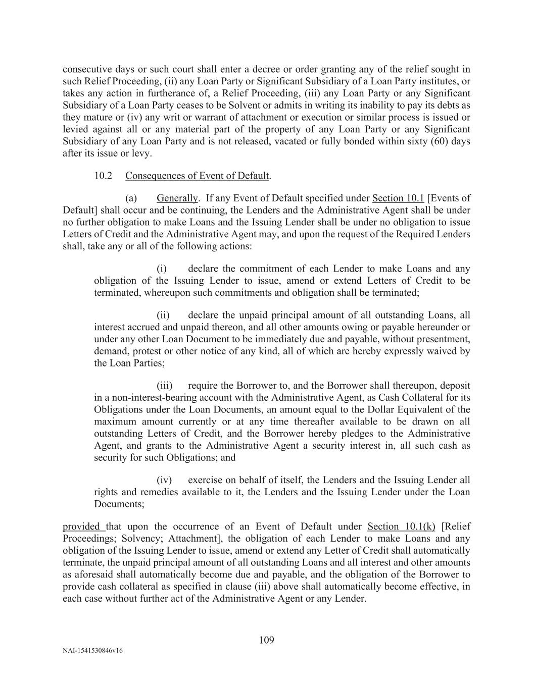 NAI-1541530846v16 109 consecutive days or such court shall enter a decree or order granting any of the relief sought in such Relief Proceeding, (ii) any Loan Party or Significant Subsidiary of a Loan Party institutes, or takes any action in furtherance of, a Relief Proceeding, (iii) any Loan Party or any Significant Subsidiary of a Loan Party ceases to be Solvent or admits in writing its inability to pay its debts as they mature or (iv) any writ or warrant of attachment or execution or similar process is issued or levied against all or any material part of the property of any Loan Party or any Significant Subsidiary of any Loan Party and is not released, vacated or fully bonded within sixty (60) days after its issue or levy. 10.2 Consequences of Event of Default. (a) Generally. If any Event of Default specified under Section 10.1 [Events of Default] shall occur and be continuing, the Lenders and the Administrative Agent shall be under no further obligation to make Loans and the Issuing Lender shall be under no obligation to issue Letters of Credit and the Administrative Agent may, and upon the request of the Required Lenders shall, take any or all of the following actions: (i) declare the commitment of each Lender to make Loans and any obligation of the Issuing Lender to issue, amend or extend Letters of Credit to be terminated, whereupon such commitments and obligation shall be terminated; (ii) declare the unpaid principal amount of all outstanding Loans, all interest accrued and unpaid thereon, and all other amounts owing or payable hereunder or under any other Loan Document to be immediately due and payable, without presentment, demand, protest or other notice of any kind, all of which are hereby expressly waived by the Loan Parties; (iii) require the Borrower to, and the Borrower shall thereupon, deposit in a non-interest-bearing account with the Administrative Agent, as Cash Collateral for its Obligations under the Loan Documents, an amount equal to the Dollar Equivalent of the maximum amount currently or at any time thereafter available to be drawn on all outstanding Letters of Credit, and the Borrower hereby pledges to the Administrative Agent, and grants to the Administrative Agent a security interest in, all such cash as security for such Obligations; and (iv) exercise on behalf of itself, the Lenders and the Issuing Lender all rights and remedies available to it, the Lenders and the Issuing Lender under the Loan Documents; provided that upon the occurrence of an Event of Default under Section 10.1(k) [Relief Proceedings; Solvency; Attachment], the obligation of each Lender to make Loans and any obligation of the Issuing Lender to issue, amend or extend any Letter of Credit shall automatically terminate, the unpaid principal amount of all outstanding Loans and all interest and other amounts as aforesaid shall automatically become due and payable, and the obligation of the Borrower to provide cash collateral as specified in clause (iii) above shall automatically become effective, in each case without further act of the Administrative Agent or any Lender.