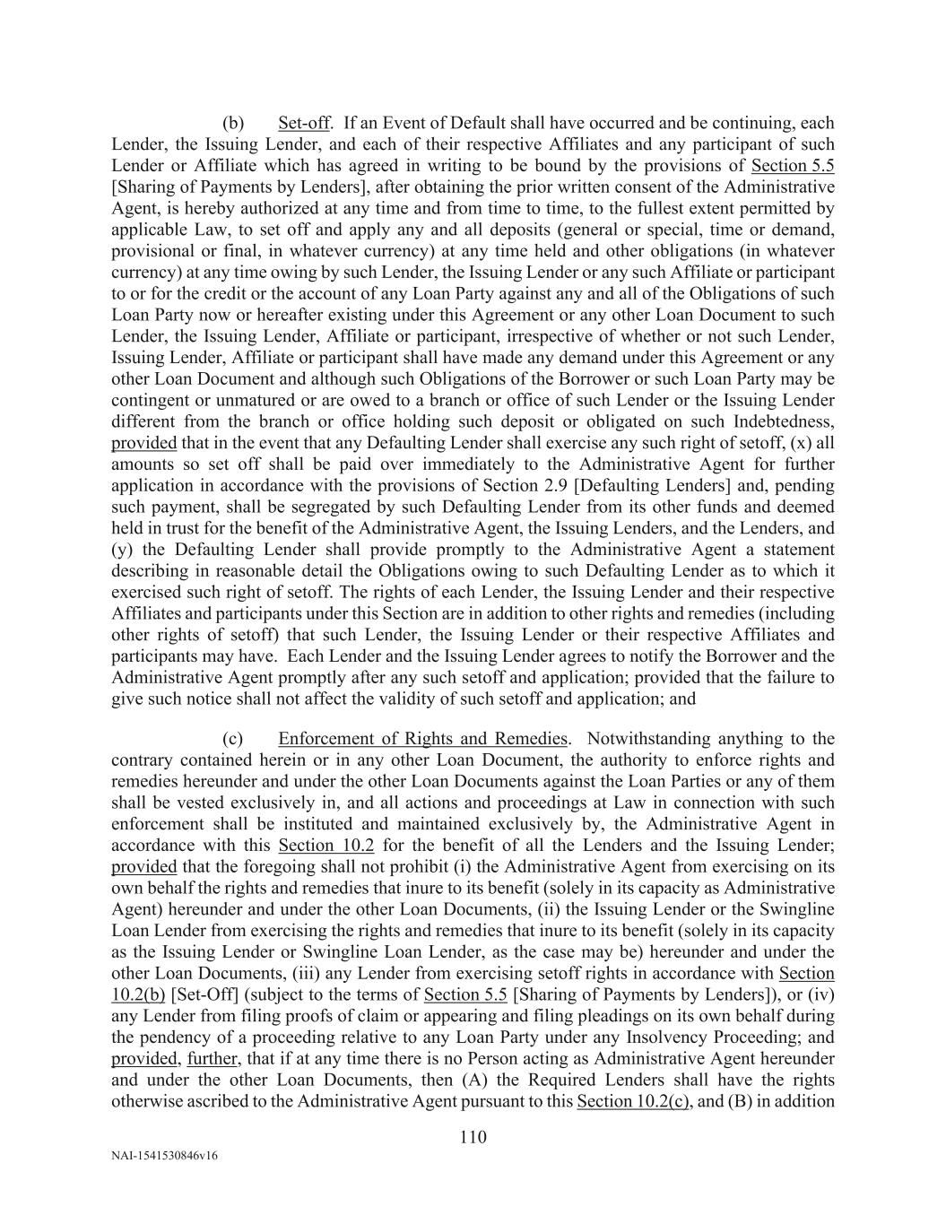NAI-1541530846v16 110 (b) Set-off. If an Event of Default shall have occurred and be continuing, each Lender, the Issuing Lender, and each of their respective Affiliates and any participant of such Lender or Affiliate which has agreed in writing to be bound by the provisions of Section 5.5 [Sharing of Payments by Lenders], after obtaining the prior written consent of the Administrative Agent, is hereby authorized at any time and from time to time, to the fullest extent permitted by applicable Law, to set off and apply any and all deposits (general or special, time or demand, provisional or final, in whatever currency) at any time held and other obligations (in whatever currency) at any time owing by such Lender, the Issuing Lender or any such Affiliate or participant to or for the credit or the account of any Loan Party against any and all of the Obligations of such Loan Party now or hereafter existing under this Agreement or any other Loan Document to such Lender, the Issuing Lender, Affiliate or participant, irrespective of whether or not such Lender, Issuing Lender, Affiliate or participant shall have made any demand under this Agreement or any other Loan Document and although such Obligations of the Borrower or such Loan Party may be contingent or unmatured or are owed to a branch or office of such Lender or the Issuing Lender different from the branch or office holding such deposit or obligated on such Indebtedness, provided that in the event that any Defaulting Lender shall exercise any such right of setoff, (x) all amounts so set off shall be paid over immediately to the Administrative Agent for further application in accordance with the provisions of Section 2.9 [Defaulting Lenders] and, pending such payment, shall be segregated by such Defaulting Lender from its other funds and deemed held in trust for the benefit of the Administrative Agent, the Issuing Lenders, and the Lenders, and (y) the Defaulting Lender shall provide promptly to the Administrative Agent a statement describing in reasonable detail the Obligations owing to such Defaulting Lender as to which it exercised such right of setoff. The rights of each Lender, the Issuing Lender and their respective Affiliates and participants under this Section are in addition to other rights and remedies (including other rights of setoff) that such Lender, the Issuing Lender or their respective Affiliates and participants may have. Each Lender and the Issuing Lender agrees to notify the Borrower and the Administrative Agent promptly after any such setoff and application; provided that the failure to give such notice shall not affect the validity of such setoff and application; and (c) Enforcement of Rights and Remedies. Notwithstanding anything to the contrary contained herein or in any other Loan Document, the authority to enforce rights and remedies hereunder and under the other Loan Documents against the Loan Parties or any of them shall be vested exclusively in, and all actions and proceedings at Law in connection with such enforcement shall be instituted and maintained exclusively by, the Administrative Agent in accordance with this Section 10.2 for the benefit of all the Lenders and the Issuing Lender; provided that the foregoing shall not prohibit (i) the Administrative Agent from exercising on its own behalf the rights and remedies that inure to its benefit (solely in its capacity as Administrative Agent) hereunder and under the other Loan Documents, (ii) the Issuing Lender or the Swingline Loan Lender from exercising the rights and remedies that inure to its benefit (solely in its capacity as the Issuing Lender or Swingline Loan Lender, as the case may be) hereunder and under the other Loan Documents, (iii) any Lender from exercising setoff rights in accordance with Section 10.2(b) [Set-Off] (subject to the terms of Section 5.5 [Sharing of Payments by Lenders]), or (iv) any Lender from filing proofs of claim or appearing and filing pleadings on its own behalf during the pendency of a proceeding relative to any Loan Party under any Insolvency Proceeding; and provided, further, that if at any time there is no Person acting as Administrative Agent hereunder and under the other Loan Documents, then (A) the Required Lenders shall have the rights otherwise ascribed to the Administrative Agent pursuant to this Section 10.2(c), and (B) in addition