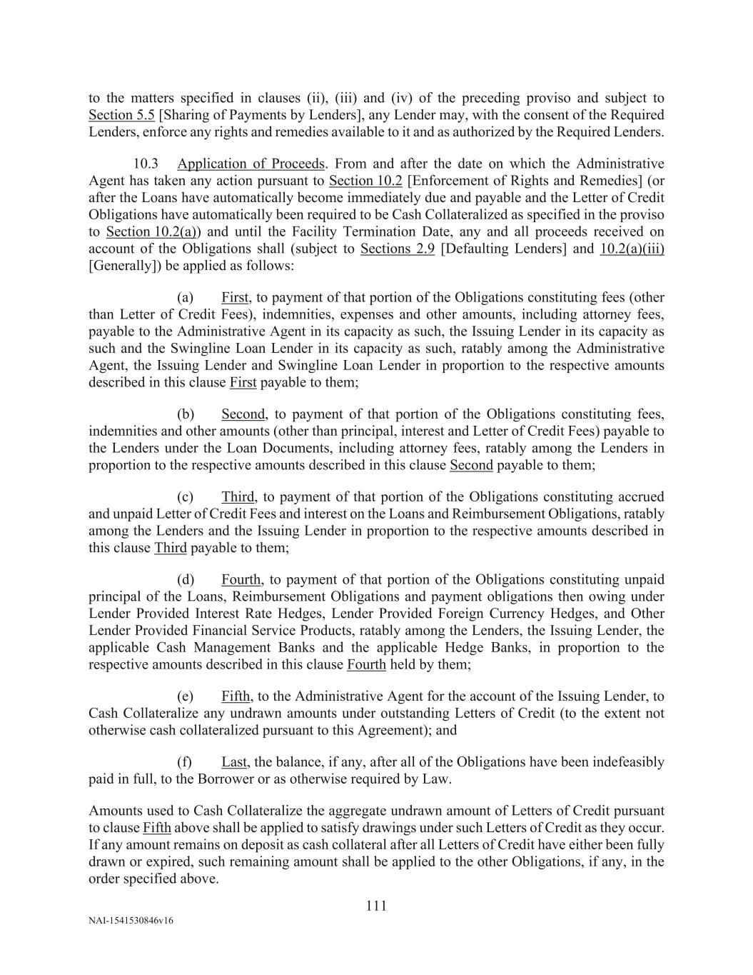 NAI-1541530846v16 111 to the matters specified in clauses (ii), (iii) and (iv) of the preceding proviso and subject to Section 5.5 [Sharing of Payments by Lenders], any Lender may, with the consent of the Required Lenders, enforce any rights and remedies available to it and as authorized by the Required Lenders. 10.3 Application of Proceeds. From and after the date on which the Administrative Agent has taken any action pursuant to Section 10.2 [Enforcement of Rights and Remedies] (or after the Loans have automatically become immediately due and payable and the Letter of Credit Obligations have automatically been required to be Cash Collateralized as specified in the proviso to Section 10.2(a)) and until the Facility Termination Date, any and all proceeds received on account of the Obligations shall (subject to Sections 2.9 [Defaulting Lenders] and 10.2(a)(iii) [Generally]) be applied as follows: (a) First, to payment of that portion of the Obligations constituting fees (other than Letter of Credit Fees), indemnities, expenses and other amounts, including attorney fees, payable to the Administrative Agent in its capacity as such, the Issuing Lender in its capacity as such and the Swingline Loan Lender in its capacity as such, ratably among the Administrative Agent, the Issuing Lender and Swingline Loan Lender in proportion to the respective amounts described in this clause First payable to them; (b) Second, to payment of that portion of the Obligations constituting fees, indemnities and other amounts (other than principal, interest and Letter of Credit Fees) payable to the Lenders under the Loan Documents, including attorney fees, ratably among the Lenders in proportion to the respective amounts described in this clause Second payable to them; (c) Third, to payment of that portion of the Obligations constituting accrued and unpaid Letter of Credit Fees and interest on the Loans and Reimbursement Obligations, ratably among the Lenders and the Issuing Lender in proportion to the respective amounts described in this clause Third payable to them; (d) Fourth, to payment of that portion of the Obligations constituting unpaid principal of the Loans, Reimbursement Obligations and payment obligations then owing under Lender Provided Interest Rate Hedges, Lender Provided Foreign Currency Hedges, and Other Lender Provided Financial Service Products, ratably among the Lenders, the Issuing Lender, the applicable Cash Management Banks and the applicable Hedge Banks, in proportion to the respective amounts described in this clause Fourth held by them; (e) Fifth, to the Administrative Agent for the account of the Issuing Lender, to Cash Collateralize any undrawn amounts under outstanding Letters of Credit (to the extent not otherwise cash collateralized pursuant to this Agreement); and (f) Last, the balance, if any, after all of the Obligations have been indefeasibly paid in full, to the Borrower or as otherwise required by Law. Amounts used to Cash Collateralize the aggregate undrawn amount of Letters of Credit pursuant to clause Fifth above shall be applied to satisfy drawings under such Letters of Credit as they occur. If any amount remains on deposit as cash collateral after all Letters of Credit have either been fully drawn or expired, such remaining amount shall be applied to the other Obligations, if any, in the order specified above.