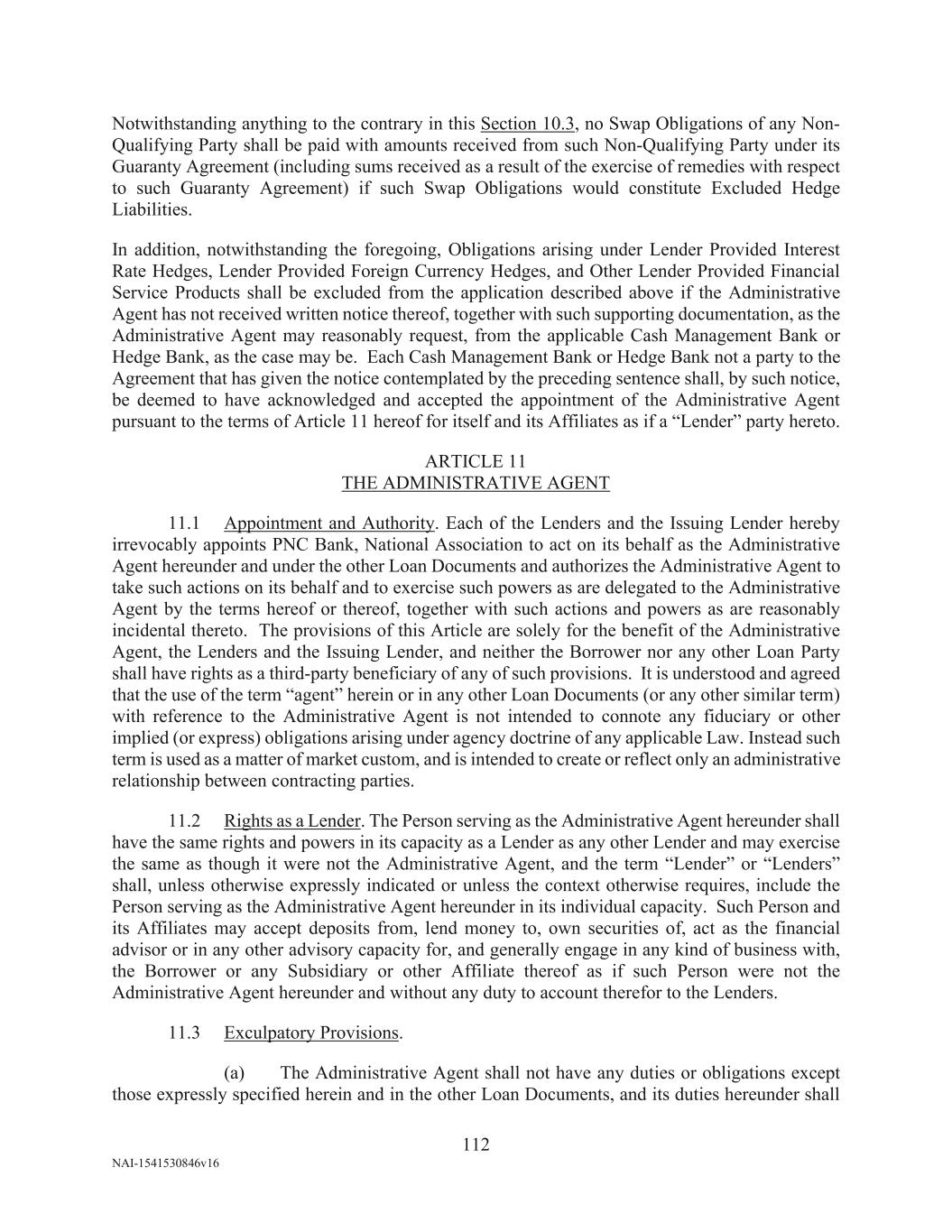 NAI-1541530846v16 112 Notwithstanding anything to the contrary in this Section 10.3, no Swap Obligations of any Non- Qualifying Party shall be paid with amounts received from such Non-Qualifying Party under its Guaranty Agreement (including sums received as a result of the exercise of remedies with respect to such Guaranty Agreement) if such Swap Obligations would constitute Excluded Hedge Liabilities. In addition, notwithstanding the foregoing, Obligations arising under Lender Provided Interest Rate Hedges, Lender Provided Foreign Currency Hedges, and Other Lender Provided Financial Service Products shall be excluded from the application described above if the Administrative Agent has not received written notice thereof, together with such supporting documentation, as the Administrative Agent may reasonably request, from the applicable Cash Management Bank or Hedge Bank, as the case may be. Each Cash Management Bank or Hedge Bank not a party to the Agreement that has given the notice contemplated by the preceding sentence shall, by such notice, be deemed to have acknowledged and accepted the appointment of the Administrative Agent pursuant to the terms of Article 11 hereof for itself and its Affiliates as if a “Lender” party hereto. ARTICLE 11 THE ADMINISTRATIVE AGENT 11.1 Appointment and Authority. Each of the Lenders and the Issuing Lender hereby irrevocably appoints PNC Bank, National Association to act on its behalf as the Administrative Agent hereunder and under the other Loan Documents and authorizes the Administrative Agent to take such actions on its behalf and to exercise such powers as are delegated to the Administrative Agent by the terms hereof or thereof, together with such actions and powers as are reasonably incidental thereto. The provisions of this Article are solely for the benefit of the Administrative Agent, the Lenders and the Issuing Lender, and neither the Borrower nor any other Loan Party shall have rights as a third-party beneficiary of any of such provisions. It is understood and agreed that the use of the term “agent” herein or in any other Loan Documents (or any other similar term) with reference to the Administrative Agent is not intended to connote any fiduciary or other implied (or express) obligations arising under agency doctrine of any applicable Law. Instead such term is used as a matter of market custom, and is intended to create or reflect only an administrative relationship between contracting parties. 11.2 Rights as a Lender. The Person serving as the Administrative Agent hereunder shall have the same rights and powers in its capacity as a Lender as any other Lender and may exercise the same as though it were not the Administrative Agent, and the term “Lender” or “Lenders” shall, unless otherwise expressly indicated or unless the context otherwise requires, include the Person serving as the Administrative Agent hereunder in its individual capacity. Such Person and its Affiliates may accept deposits from, lend money to, own securities of, act as the financial advisor or in any other advisory capacity for, and generally engage in any kind of business with, the Borrower or any Subsidiary or other Affiliate thereof as if such Person were not the Administrative Agent hereunder and without any duty to account therefor to the Lenders. 11.3 Exculpatory Provisions. (a) The Administrative Agent shall not have any duties or obligations except those expressly specified herein and in the other Loan Documents, and its duties hereunder shall
