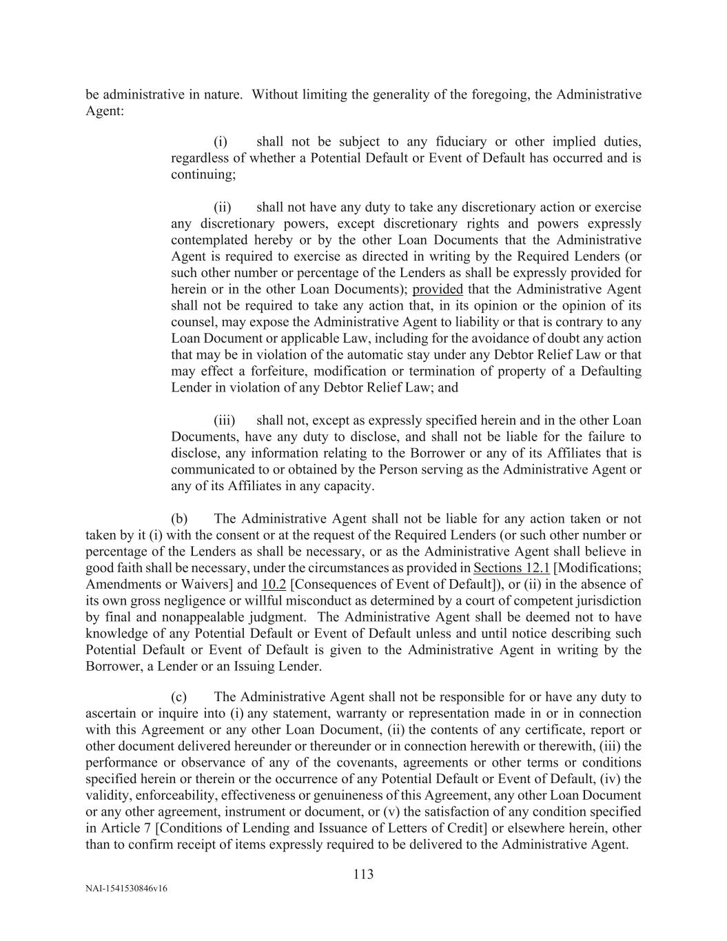 NAI-1541530846v16 113 be administrative in nature. Without limiting the generality of the foregoing, the Administrative Agent: (i) shall not be subject to any fiduciary or other implied duties, regardless of whether a Potential Default or Event of Default has occurred and is continuing; (ii) shall not have any duty to take any discretionary action or exercise any discretionary powers, except discretionary rights and powers expressly contemplated hereby or by the other Loan Documents that the Administrative Agent is required to exercise as directed in writing by the Required Lenders (or such other number or percentage of the Lenders as shall be expressly provided for herein or in the other Loan Documents); provided that the Administrative Agent shall not be required to take any action that, in its opinion or the opinion of its counsel, may expose the Administrative Agent to liability or that is contrary to any Loan Document or applicable Law, including for the avoidance of doubt any action that may be in violation of the automatic stay under any Debtor Relief Law or that may effect a forfeiture, modification or termination of property of a Defaulting Lender in violation of any Debtor Relief Law; and (iii) shall not, except as expressly specified herein and in the other Loan Documents, have any duty to disclose, and shall not be liable for the failure to disclose, any information relating to the Borrower or any of its Affiliates that is communicated to or obtained by the Person serving as the Administrative Agent or any of its Affiliates in any capacity. (b) The Administrative Agent shall not be liable for any action taken or not taken by it (i) with the consent or at the request of the Required Lenders (or such other number or percentage of the Lenders as shall be necessary, or as the Administrative Agent shall believe in good faith shall be necessary, under the circumstances as provided in Sections 12.1 [Modifications; Amendments or Waivers] and 10.2 [Consequences of Event of Default]), or (ii) in the absence of its own gross negligence or willful misconduct as determined by a court of competent jurisdiction by final and nonappealable judgment. The Administrative Agent shall be deemed not to have knowledge of any Potential Default or Event of Default unless and until notice describing such Potential Default or Event of Default is given to the Administrative Agent in writing by the Borrower, a Lender or an Issuing Lender. (c) The Administrative Agent shall not be responsible for or have any duty to ascertain or inquire into (i) any statement, warranty or representation made in or in connection with this Agreement or any other Loan Document, (ii) the contents of any certificate, report or other document delivered hereunder or thereunder or in connection herewith or therewith, (iii) the performance or observance of any of the covenants, agreements or other terms or conditions specified herein or therein or the occurrence of any Potential Default or Event of Default, (iv) the validity, enforceability, effectiveness or genuineness of this Agreement, any other Loan Document or any other agreement, instrument or document, or (v) the satisfaction of any condition specified in Article 7 [Conditions of Lending and Issuance of Letters of Credit] or elsewhere herein, other than to confirm receipt of items expressly required to be delivered to the Administrative Agent.