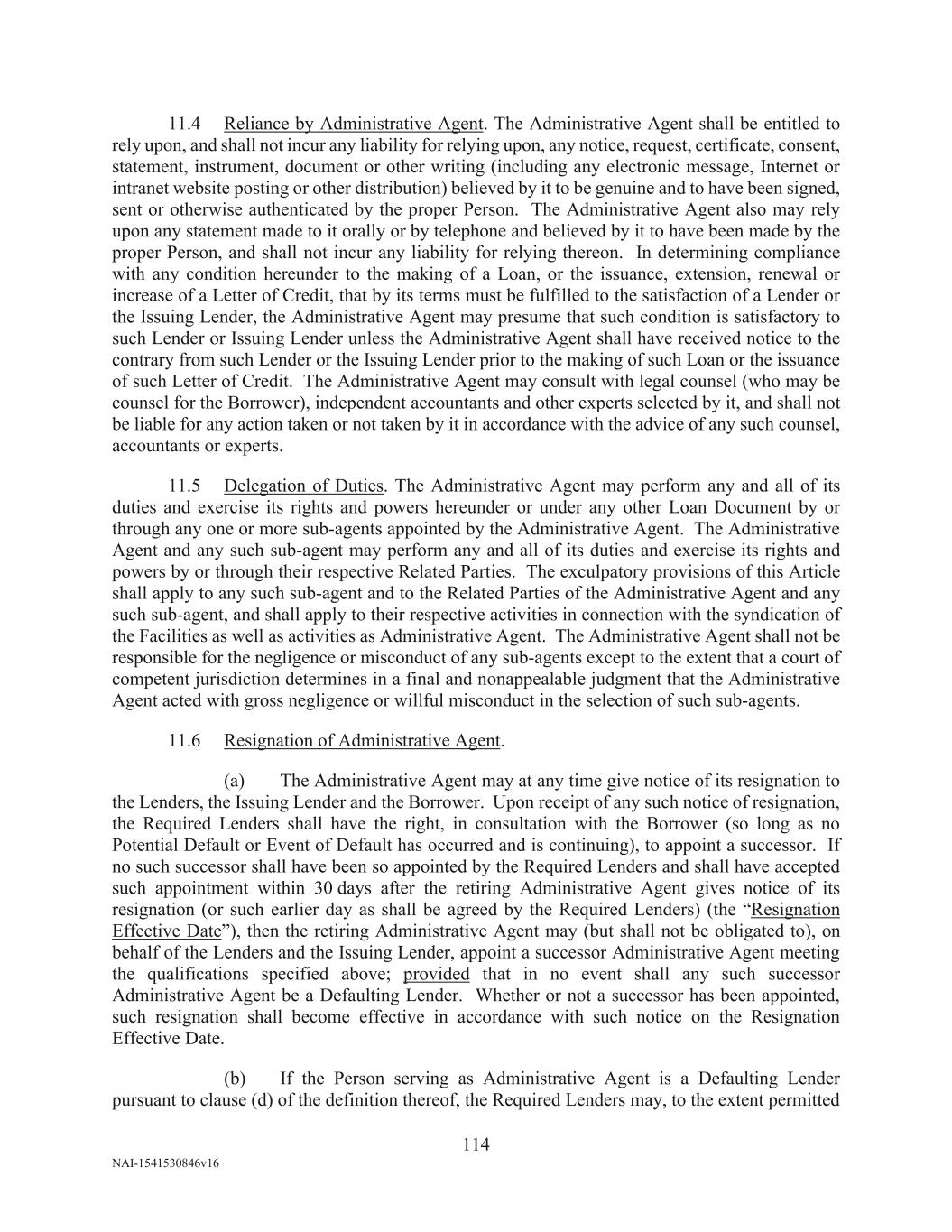 NAI-1541530846v16 114 11.4 Reliance by Administrative Agent. The Administrative Agent shall be entitled to rely upon, and shall not incur any liability for relying upon, any notice, request, certificate, consent, statement, instrument, document or other writing (including any electronic message, Internet or intranet website posting or other distribution) believed by it to be genuine and to have been signed, sent or otherwise authenticated by the proper Person. The Administrative Agent also may rely upon any statement made to it orally or by telephone and believed by it to have been made by the proper Person, and shall not incur any liability for relying thereon. In determining compliance with any condition hereunder to the making of a Loan, or the issuance, extension, renewal or increase of a Letter of Credit, that by its terms must be fulfilled to the satisfaction of a Lender or the Issuing Lender, the Administrative Agent may presume that such condition is satisfactory to such Lender or Issuing Lender unless the Administrative Agent shall have received notice to the contrary from such Lender or the Issuing Lender prior to the making of such Loan or the issuance of such Letter of Credit. The Administrative Agent may consult with legal counsel (who may be counsel for the Borrower), independent accountants and other experts selected by it, and shall not be liable for any action taken or not taken by it in accordance with the advice of any such counsel, accountants or experts. 11.5 Delegation of Duties. The Administrative Agent may perform any and all of its duties and exercise its rights and powers hereunder or under any other Loan Document by or through any one or more sub-agents appointed by the Administrative Agent. The Administrative Agent and any such sub-agent may perform any and all of its duties and exercise its rights and powers by or through their respective Related Parties. The exculpatory provisions of this Article shall apply to any such sub-agent and to the Related Parties of the Administrative Agent and any such sub-agent, and shall apply to their respective activities in connection with the syndication of the Facilities as well as activities as Administrative Agent. The Administrative Agent shall not be responsible for the negligence or misconduct of any sub-agents except to the extent that a court of competent jurisdiction determines in a final and nonappealable judgment that the Administrative Agent acted with gross negligence or willful misconduct in the selection of such sub-agents. 11.6 Resignation of Administrative Agent. (a) The Administrative Agent may at any time give notice of its resignation to the Lenders, the Issuing Lender and the Borrower. Upon receipt of any such notice of resignation, the Required Lenders shall have the right, in consultation with the Borrower (so long as no Potential Default or Event of Default has occurred and is continuing), to appoint a successor. If no such successor shall have been so appointed by the Required Lenders and shall have accepted such appointment within 30 days after the retiring Administrative Agent gives notice of its resignation (or such earlier day as shall be agreed by the Required Lenders) (the “Resignation Effective Date”), then the retiring Administrative Agent may (but shall not be obligated to), on behalf of the Lenders and the Issuing Lender, appoint a successor Administrative Agent meeting the qualifications specified above; provided that in no event shall any such successor Administrative Agent be a Defaulting Lender. Whether or not a successor has been appointed, such resignation shall become effective in accordance with such notice on the Resignation Effective Date. (b) If the Person serving as Administrative Agent is a Defaulting Lender pursuant to clause (d) of the definition thereof, the Required Lenders may, to the extent permitted