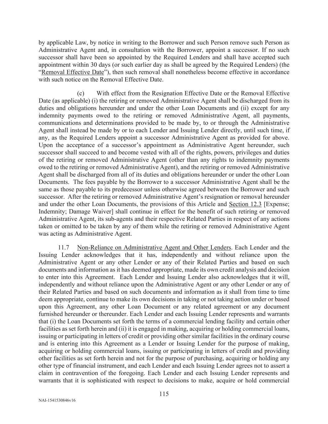NAI-1541530846v16 115 by applicable Law, by notice in writing to the Borrower and such Person remove such Person as Administrative Agent and, in consultation with the Borrower, appoint a successor. If no such successor shall have been so appointed by the Required Lenders and shall have accepted such appointment within 30 days (or such earlier day as shall be agreed by the Required Lenders) (the “Removal Effective Date”), then such removal shall nonetheless become effective in accordance with such notice on the Removal Effective Date. (c) With effect from the Resignation Effective Date or the Removal Effective Date (as applicable) (i) the retiring or removed Administrative Agent shall be discharged from its duties and obligations hereunder and under the other Loan Documents and (ii) except for any indemnity payments owed to the retiring or removed Administrative Agent, all payments, communications and determinations provided to be made by, to or through the Administrative Agent shall instead be made by or to each Lender and Issuing Lender directly, until such time, if any, as the Required Lenders appoint a successor Administrative Agent as provided for above. Upon the acceptance of a successor’s appointment as Administrative Agent hereunder, such successor shall succeed to and become vested with all of the rights, powers, privileges and duties of the retiring or removed Administrative Agent (other than any rights to indemnity payments owed to the retiring or removed Administrative Agent), and the retiring or removed Administrative Agent shall be discharged from all of its duties and obligations hereunder or under the other Loan Documents. The fees payable by the Borrower to a successor Administrative Agent shall be the same as those payable to its predecessor unless otherwise agreed between the Borrower and such successor. After the retiring or removed Administrative Agent’s resignation or removal hereunder and under the other Loan Documents, the provisions of this Article and Section 12.3 [Expense; Indemnity; Damage Waiver] shall continue in effect for the benefit of such retiring or removed Administrative Agent, its sub-agents and their respective Related Parties in respect of any actions taken or omitted to be taken by any of them while the retiring or removed Administrative Agent was acting as Administrative Agent. 11.7 Non-Reliance on Administrative Agent and Other Lenders. Each Lender and the Issuing Lender acknowledges that it has, independently and without reliance upon the Administrative Agent or any other Lender or any of their Related Parties and based on such documents and information as it has deemed appropriate, made its own credit analysis and decision to enter into this Agreement. Each Lender and Issuing Lender also acknowledges that it will, independently and without reliance upon the Administrative Agent or any other Lender or any of their Related Parties and based on such documents and information as it shall from time to time deem appropriate, continue to make its own decisions in taking or not taking action under or based upon this Agreement, any other Loan Document or any related agreement or any document furnished hereunder or thereunder. Each Lender and each Issuing Lender represents and warrants that (i) the Loan Documents set forth the terms of a commercial lending facility and certain other facilities as set forth herein and (ii) it is engaged in making, acquiring or holding commercial loans, issuing or participating in letters of credit or providing other similar facilities in the ordinary course and is entering into this Agreement as a Lender or Issuing Lender for the purpose of making, acquiring or holding commercial loans, issuing or participating in letters of credit and providing other facilities as set forth herein and not for the purpose of purchasing, acquiring or holding any other type of financial instrument, and each Lender and each Issuing Lender agrees not to assert a claim in contravention of the foregoing. Each Lender and each Issuing Lender represents and warrants that it is sophisticated with respect to decisions to make, acquire or hold commercial