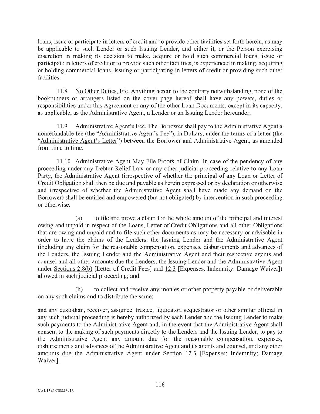 NAI-1541530846v16 116 loans, issue or participate in letters of credit and to provide other facilities set forth herein, as may be applicable to such Lender or such Issuing Lender, and either it, or the Person exercising discretion in making its decision to make, acquire or hold such commercial loans, issue or participate in letters of credit or to provide such other facilities, is experienced in making, acquiring or holding commercial loans, issuing or participating in letters of credit or providing such other facilities. 11.8 No Other Duties, Etc. Anything herein to the contrary notwithstanding, none of the bookrunners or arrangers listed on the cover page hereof shall have any powers, duties or responsibilities under this Agreement or any of the other Loan Documents, except in its capacity, as applicable, as the Administrative Agent, a Lender or an Issuing Lender hereunder. 11.9 Administrative Agent’s Fee. The Borrower shall pay to the Administrative Agent a nonrefundable fee (the “Administrative Agent’s Fee”), in Dollars, under the terms of a letter (the “Administrative Agent’s Letter”) between the Borrower and Administrative Agent, as amended from time to time. 11.10 Administrative Agent May File Proofs of Claim. In case of the pendency of any proceeding under any Debtor Relief Law or any other judicial proceeding relative to any Loan Party, the Administrative Agent (irrespective of whether the principal of any Loan or Letter of Credit Obligation shall then be due and payable as herein expressed or by declaration or otherwise and irrespective of whether the Administrative Agent shall have made any demand on the Borrower) shall be entitled and empowered (but not obligated) by intervention in such proceeding or otherwise: (a) to file and prove a claim for the whole amount of the principal and interest owing and unpaid in respect of the Loans, Letter of Credit Obligations and all other Obligations that are owing and unpaid and to file such other documents as may be necessary or advisable in order to have the claims of the Lenders, the Issuing Lender and the Administrative Agent (including any claim for the reasonable compensation, expenses, disbursements and advances of the Lenders, the Issuing Lender and the Administrative Agent and their respective agents and counsel and all other amounts due the Lenders, the Issuing Lender and the Administrative Agent under Sections 2.8(b) [Letter of Credit Fees] and 12.3 [Expenses; Indemnity; Damage Waiver]) allowed in such judicial proceeding; and (b) to collect and receive any monies or other property payable or deliverable on any such claims and to distribute the same; and any custodian, receiver, assignee, trustee, liquidator, sequestrator or other similar official in any such judicial proceeding is hereby authorized by each Lender and the Issuing Lender to make such payments to the Administrative Agent and, in the event that the Administrative Agent shall consent to the making of such payments directly to the Lenders and the Issuing Lender, to pay to the Administrative Agent any amount due for the reasonable compensation, expenses, disbursements and advances of the Administrative Agent and its agents and counsel, and any other amounts due the Administrative Agent under Section 12.3 [Expenses; Indemnity; Damage Waiver].