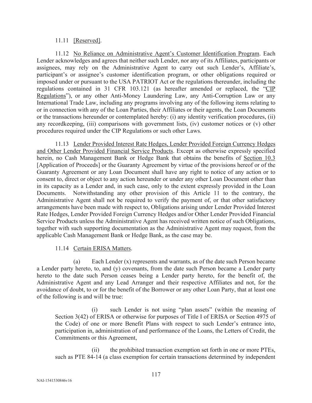 NAI-1541530846v16 117 11.11 [Reserved]. 11.12 No Reliance on Administrative Agent’s Customer Identification Program. Each Lender acknowledges and agrees that neither such Lender, nor any of its Affiliates, participants or assignees, may rely on the Administrative Agent to carry out such Lender’s, Affiliate’s, participant’s or assignee’s customer identification program, or other obligations required or imposed under or pursuant to the USA PATRIOT Act or the regulations thereunder, including the regulations contained in 31 CFR 103.121 (as hereafter amended or replaced, the “CIP Regulations”), or any other Anti-Money Laundering Law, any Anti-Corruption Law or any International Trade Law, including any programs involving any of the following items relating to or in connection with any of the Loan Parties, their Affiliates or their agents, the Loan Documents or the transactions hereunder or contemplated hereby: (i) any identity verification procedures, (ii) any recordkeeping, (iii) comparisons with government lists, (iv) customer notices or (v) other procedures required under the CIP Regulations or such other Laws. 11.13 Lender Provided Interest Rate Hedges, Lender Provided Foreign Currency Hedges and Other Lender Provided Financial Service Products. Except as otherwise expressly specified herein, no Cash Management Bank or Hedge Bank that obtains the benefits of Section 10.3 [Application of Proceeds] or the Guaranty Agreement by virtue of the provisions hereof or of the Guaranty Agreement or any Loan Document shall have any right to notice of any action or to consent to, direct or object to any action hereunder or under any other Loan Document other than in its capacity as a Lender and, in such case, only to the extent expressly provided in the Loan Documents. Notwithstanding any other provision of this Article 11 to the contrary, the Administrative Agent shall not be required to verify the payment of, or that other satisfactory arrangements have been made with respect to, Obligations arising under Lender Provided Interest Rate Hedges, Lender Provided Foreign Currency Hedges and/or Other Lender Provided Financial Service Products unless the Administrative Agent has received written notice of such Obligations, together with such supporting documentation as the Administrative Agent may request, from the applicable Cash Management Bank or Hedge Bank, as the case may be. 11.14 Certain ERISA Matters. (a) Each Lender (x) represents and warrants, as of the date such Person became a Lender party hereto, to, and (y) covenants, from the date such Person became a Lender party hereto to the date such Person ceases being a Lender party hereto, for the benefit of, the Administrative Agent and any Lead Arranger and their respective Affiliates and not, for the avoidance of doubt, to or for the benefit of the Borrower or any other Loan Party, that at least one of the following is and will be true: (i) such Lender is not using “plan assets” (within the meaning of Section 3(42) of ERISA or otherwise for purposes of Title I of ERISA or Section 4975 of the Code) of one or more Benefit Plans with respect to such Lender’s entrance into, participation in, administration of and performance of the Loans, the Letters of Credit, the Commitments or this Agreement, (ii) the prohibited transaction exemption set forth in one or more PTEs, such as PTE 84-14 (a class exemption for certain transactions determined by independent