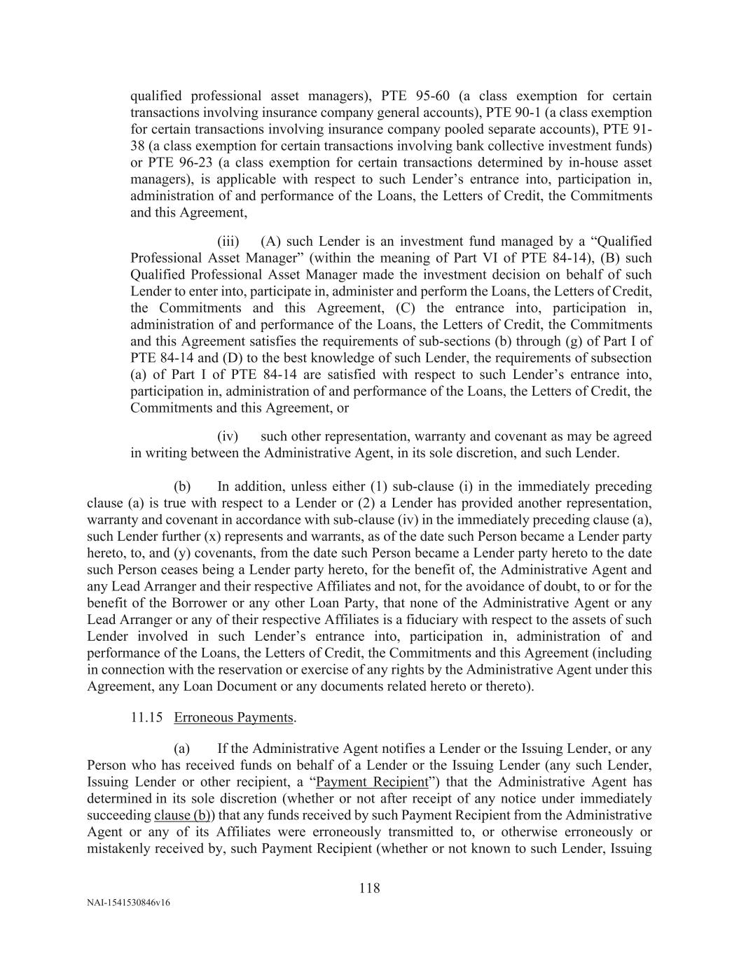 NAI-1541530846v16 118 qualified professional asset managers), PTE 95-60 (a class exemption for certain transactions involving insurance company general accounts), PTE 90-1 (a class exemption for certain transactions involving insurance company pooled separate accounts), PTE 91- 38 (a class exemption for certain transactions involving bank collective investment funds) or PTE 96-23 (a class exemption for certain transactions determined by in-house asset managers), is applicable with respect to such Lender’s entrance into, participation in, administration of and performance of the Loans, the Letters of Credit, the Commitments and this Agreement, (iii) (A) such Lender is an investment fund managed by a “Qualified Professional Asset Manager” (within the meaning of Part VI of PTE 84-14), (B) such Qualified Professional Asset Manager made the investment decision on behalf of such Lender to enter into, participate in, administer and perform the Loans, the Letters of Credit, the Commitments and this Agreement, (C) the entrance into, participation in, administration of and performance of the Loans, the Letters of Credit, the Commitments and this Agreement satisfies the requirements of sub-sections (b) through (g) of Part I of PTE 84-14 and (D) to the best knowledge of such Lender, the requirements of subsection (a) of Part I of PTE 84-14 are satisfied with respect to such Lender’s entrance into, participation in, administration of and performance of the Loans, the Letters of Credit, the Commitments and this Agreement, or (iv) such other representation, warranty and covenant as may be agreed in writing between the Administrative Agent, in its sole discretion, and such Lender. (b) In addition, unless either (1) sub-clause (i) in the immediately preceding clause (a) is true with respect to a Lender or (2) a Lender has provided another representation, warranty and covenant in accordance with sub-clause (iv) in the immediately preceding clause (a), such Lender further (x) represents and warrants, as of the date such Person became a Lender party hereto, to, and (y) covenants, from the date such Person became a Lender party hereto to the date such Person ceases being a Lender party hereto, for the benefit of, the Administrative Agent and any Lead Arranger and their respective Affiliates and not, for the avoidance of doubt, to or for the benefit of the Borrower or any other Loan Party, that none of the Administrative Agent or any Lead Arranger or any of their respective Affiliates is a fiduciary with respect to the assets of such Lender involved in such Lender’s entrance into, participation in, administration of and performance of the Loans, the Letters of Credit, the Commitments and this Agreement (including in connection with the reservation or exercise of any rights by the Administrative Agent under this Agreement, any Loan Document or any documents related hereto or thereto). 11.15 Erroneous Payments. (a) If the Administrative Agent notifies a Lender or the Issuing Lender, or any Person who has received funds on behalf of a Lender or the Issuing Lender (any such Lender, Issuing Lender or other recipient, a “Payment Recipient”) that the Administrative Agent has determined in its sole discretion (whether or not after receipt of any notice under immediately succeeding clause (b)) that any funds received by such Payment Recipient from the Administrative Agent or any of its Affiliates were erroneously transmitted to, or otherwise erroneously or mistakenly received by, such Payment Recipient (whether or not known to such Lender, Issuing