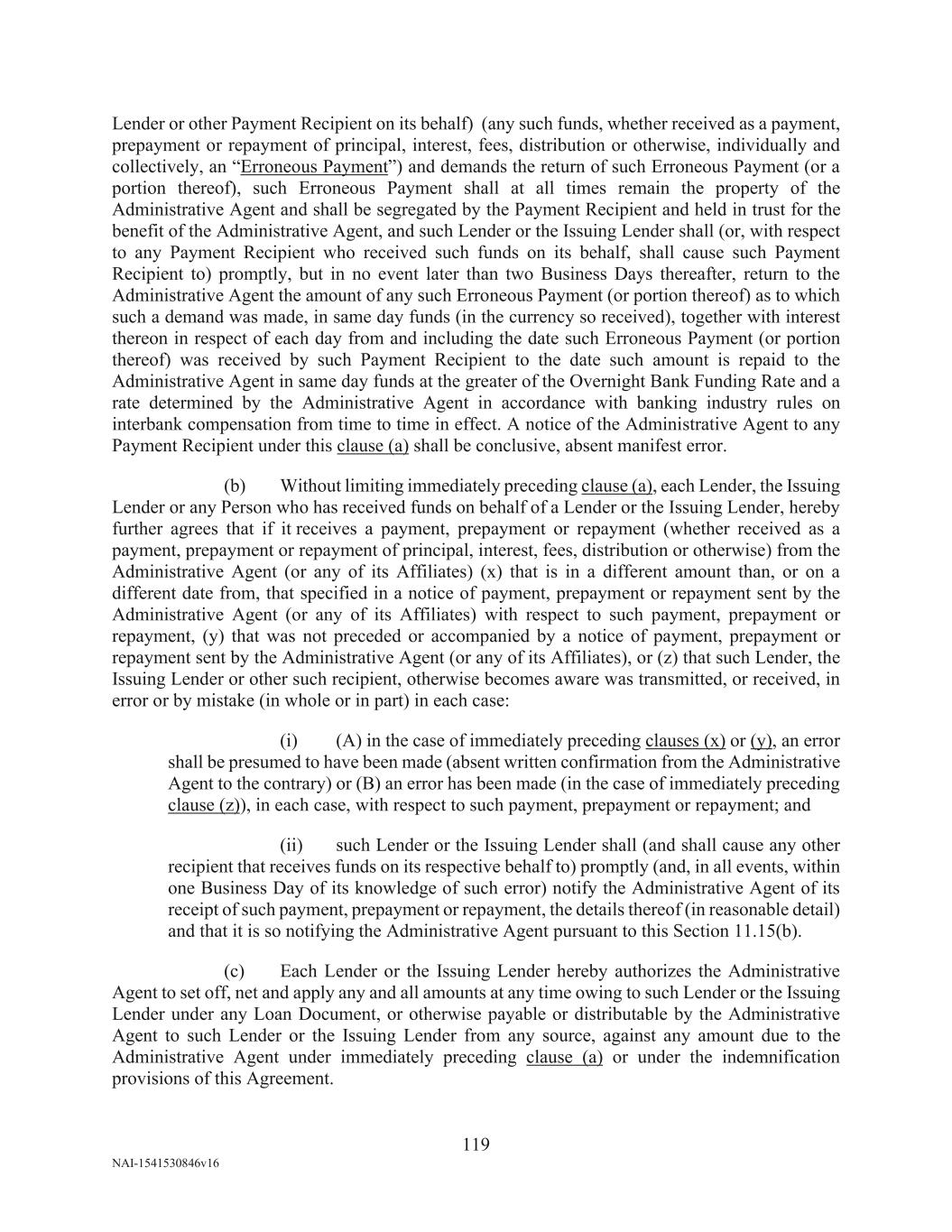 NAI-1541530846v16 119 Lender or other Payment Recipient on its behalf) (any such funds, whether received as a payment, prepayment or repayment of principal, interest, fees, distribution or otherwise, individually and collectively, an “Erroneous Payment”) and demands the return of such Erroneous Payment (or a portion thereof), such Erroneous Payment shall at all times remain the property of the Administrative Agent and shall be segregated by the Payment Recipient and held in trust for the benefit of the Administrative Agent, and such Lender or the Issuing Lender shall (or, with respect to any Payment Recipient who received such funds on its behalf, shall cause such Payment Recipient to) promptly, but in no event later than two Business Days thereafter, return to the Administrative Agent the amount of any such Erroneous Payment (or portion thereof) as to which such a demand was made, in same day funds (in the currency so received), together with interest thereon in respect of each day from and including the date such Erroneous Payment (or portion thereof) was received by such Payment Recipient to the date such amount is repaid to the Administrative Agent in same day funds at the greater of the Overnight Bank Funding Rate and a rate determined by the Administrative Agent in accordance with banking industry rules on interbank compensation from time to time in effect. A notice of the Administrative Agent to any Payment Recipient under this clause (a) shall be conclusive, absent manifest error. (b) Without limiting immediately preceding clause (a), each Lender, the Issuing Lender or any Person who has received funds on behalf of a Lender or the Issuing Lender, hereby further agrees that if it receives a payment, prepayment or repayment (whether received as a payment, prepayment or repayment of principal, interest, fees, distribution or otherwise) from the Administrative Agent (or any of its Affiliates) (x) that is in a different amount than, or on a different date from, that specified in a notice of payment, prepayment or repayment sent by the Administrative Agent (or any of its Affiliates) with respect to such payment, prepayment or repayment, (y) that was not preceded or accompanied by a notice of payment, prepayment or repayment sent by the Administrative Agent (or any of its Affiliates), or (z) that such Lender, the Issuing Lender or other such recipient, otherwise becomes aware was transmitted, or received, in error or by mistake (in whole or in part) in each case: (i) (A) in the case of immediately preceding clauses (x) or (y), an error shall be presumed to have been made (absent written confirmation from the Administrative Agent to the contrary) or (B) an error has been made (in the case of immediately preceding clause (z)), in each case, with respect to such payment, prepayment or repayment; and (ii) such Lender or the Issuing Lender shall (and shall cause any other recipient that receives funds on its respective behalf to) promptly (and, in all events, within one Business Day of its knowledge of such error) notify the Administrative Agent of its receipt of such payment, prepayment or repayment, the details thereof (in reasonable detail) and that it is so notifying the Administrative Agent pursuant to this Section 11.15(b). (c) Each Lender or the Issuing Lender hereby authorizes the Administrative Agent to set off, net and apply any and all amounts at any time owing to such Lender or the Issuing Lender under any Loan Document, or otherwise payable or distributable by the Administrative Agent to such Lender or the Issuing Lender from any source, against any amount due to the Administrative Agent under immediately preceding clause (a) or under the indemnification provisions of this Agreement.