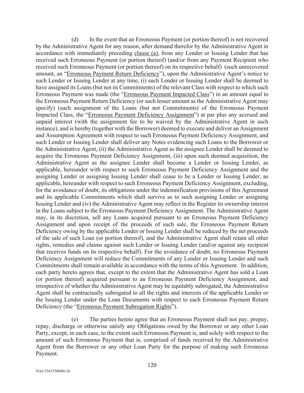 NAI-1541530846v16 120 (d) In the event that an Erroneous Payment (or portion thereof) is not recovered by the Administrative Agent for any reason, after demand therefor by the Administrative Agent in accordance with immediately preceding clause (a), from any Lender or Issuing Lender that has received such Erroneous Payment (or portion thereof) (and/or from any Payment Recipient who received such Erroneous Payment (or portion thereof) on its respective behalf) (such unrecovered amount, an “Erroneous Payment Return Deficiency”), upon the Administrative Agent’s notice to such Lender or Issuing Lender at any time, (i) such Lender or Issuing Lender shall be deemed to have assigned its Loans (but not its Commitments) of the relevant Class with respect to which such Erroneous Payment was made (the “Erroneous Payment Impacted Class”) in an amount equal to the Erroneous Payment Return Deficiency (or such lesser amount as the Administrative Agent may specify) (such assignment of the Loans (but not Commitments) of the Erroneous Payment Impacted Class, the “Erroneous Payment Deficiency Assignment”) at par plus any accrued and unpaid interest (with the assignment fee to be waived by the Administrative Agent in such instance), and is hereby (together with the Borrower) deemed to execute and deliver an Assignment and Assumption Agreement with respect to such Erroneous Payment Deficiency Assignment, and such Lender or Issuing Lender shall deliver any Notes evidencing such Loans to the Borrower or the Administrative Agent, (ii) the Administrative Agent as the assignee Lender shall be deemed to acquire the Erroneous Payment Deficiency Assignment, (iii) upon such deemed acquisition, the Administrative Agent as the assignee Lender shall become a Lender or Issuing Lender, as applicable, hereunder with respect to such Erroneous Payment Deficiency Assignment and the assigning Lender or assigning Issuing Lender shall cease to be a Lender or Issuing Lender, as applicable, hereunder with respect to such Erroneous Payment Deficiency Assignment, excluding, for the avoidance of doubt, its obligations under the indemnification provisions of this Agreement and its applicable Commitments which shall survive as to such assigning Lender or assigning Issuing Lender and (iv) the Administrative Agent may reflect in the Register its ownership interest in the Loans subject to the Erroneous Payment Deficiency Assignment. The Administrative Agent may, in its discretion, sell any Loans acquired pursuant to an Erroneous Payment Deficiency Assignment and upon receipt of the proceeds of such sale, the Erroneous Payment Return Deficiency owing by the applicable Lender or Issuing Lender shall be reduced by the net proceeds of the sale of such Loan (or portion thereof), and the Administrative Agent shall retain all other rights, remedies and claims against such Lender or Issuing Lender (and/or against any recipient that receives funds on its respective behalf). For the avoidance of doubt, no Erroneous Payment Deficiency Assignment will reduce the Commitments of any Lender or Issuing Lender and such Commitments shall remain available in accordance with the terms of this Agreement. In addition, each party hereto agrees that, except to the extent that the Administrative Agent has sold a Loan (or portion thereof) acquired pursuant to an Erroneous Payment Deficiency Assignment, and irrespective of whether the Administrative Agent may be equitably subrogated, the Administrative Agent shall be contractually subrogated to all the rights and interests of the applicable Lender or the Issuing Lender under the Loan Documents with respect to each Erroneous Payment Return Deficiency (the “Erroneous Payment Subrogation Rights”). (e) The parties hereto agree that an Erroneous Payment shall not pay, prepay, repay, discharge or otherwise satisfy any Obligations owed by the Borrower or any other Loan Party, except, in each case, to the extent such Erroneous Payment is, and solely with respect to the amount of such Erroneous Payment that is, comprised of funds received by the Administrative Agent from the Borrower or any other Loan Party for the purpose of making such Erroneous Payment.