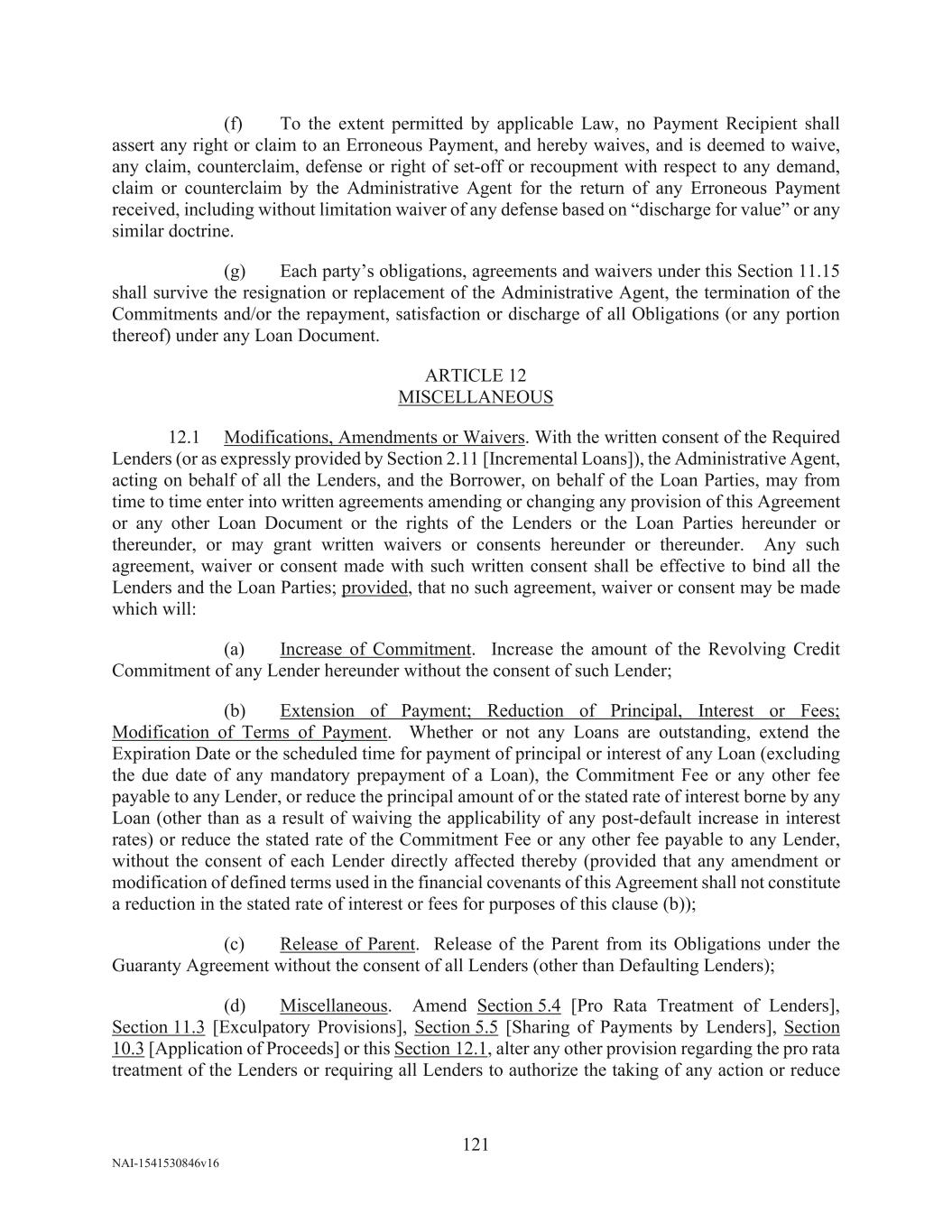 NAI-1541530846v16 121 (f) To the extent permitted by applicable Law, no Payment Recipient shall assert any right or claim to an Erroneous Payment, and hereby waives, and is deemed to waive, any claim, counterclaim, defense or right of set-off or recoupment with respect to any demand, claim or counterclaim by the Administrative Agent for the return of any Erroneous Payment received, including without limitation waiver of any defense based on “discharge for value” or any similar doctrine. (g) Each party’s obligations, agreements and waivers under this Section 11.15 shall survive the resignation or replacement of the Administrative Agent, the termination of the Commitments and/or the repayment, satisfaction or discharge of all Obligations (or any portion thereof) under any Loan Document. ARTICLE 12 MISCELLANEOUS 12.1 Modifications, Amendments or Waivers. With the written consent of the Required Lenders (or as expressly provided by Section 2.11 [Incremental Loans]), the Administrative Agent, acting on behalf of all the Lenders, and the Borrower, on behalf of the Loan Parties, may from time to time enter into written agreements amending or changing any provision of this Agreement or any other Loan Document or the rights of the Lenders or the Loan Parties hereunder or thereunder, or may grant written waivers or consents hereunder or thereunder. Any such agreement, waiver or consent made with such written consent shall be effective to bind all the Lenders and the Loan Parties; provided, that no such agreement, waiver or consent may be made which will: (a) Increase of Commitment. Increase the amount of the Revolving Credit Commitment of any Lender hereunder without the consent of such Lender; (b) Extension of Payment; Reduction of Principal, Interest or Fees; Modification of Terms of Payment. Whether or not any Loans are outstanding, extend the Expiration Date or the scheduled time for payment of principal or interest of any Loan (excluding the due date of any mandatory prepayment of a Loan), the Commitment Fee or any other fee payable to any Lender, or reduce the principal amount of or the stated rate of interest borne by any Loan (other than as a result of waiving the applicability of any post-default increase in interest rates) or reduce the stated rate of the Commitment Fee or any other fee payable to any Lender, without the consent of each Lender directly affected thereby (provided that any amendment or modification of defined terms used in the financial covenants of this Agreement shall not constitute a reduction in the stated rate of interest or fees for purposes of this clause (b)); (c) Release of Parent. Release of the Parent from its Obligations under the Guaranty Agreement without the consent of all Lenders (other than Defaulting Lenders); (d) Miscellaneous. Amend Section 5.4 [Pro Rata Treatment of Lenders], Section 11.3 [Exculpatory Provisions], Section 5.5 [Sharing of Payments by Lenders], Section 10.3 [Application of Proceeds] or this Section 12.1, alter any other provision regarding the pro rata treatment of the Lenders or requiring all Lenders to authorize the taking of any action or reduce