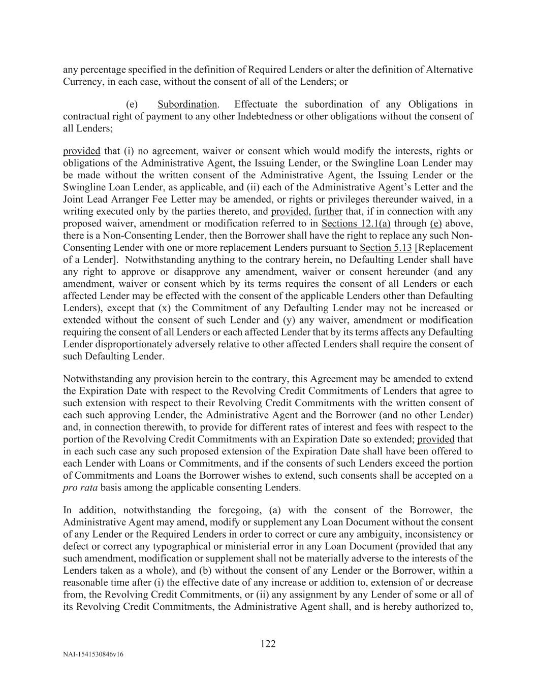 NAI-1541530846v16 122 any percentage specified in the definition of Required Lenders or alter the definition of Alternative Currency, in each case, without the consent of all of the Lenders; or (e) Subordination. Effectuate the subordination of any Obligations in contractual right of payment to any other Indebtedness or other obligations without the consent of all Lenders; provided that (i) no agreement, waiver or consent which would modify the interests, rights or obligations of the Administrative Agent, the Issuing Lender, or the Swingline Loan Lender may be made without the written consent of the Administrative Agent, the Issuing Lender or the Swingline Loan Lender, as applicable, and (ii) each of the Administrative Agent’s Letter and the Joint Lead Arranger Fee Letter may be amended, or rights or privileges thereunder waived, in a writing executed only by the parties thereto, and provided, further that, if in connection with any proposed waiver, amendment or modification referred to in Sections 12.1(a) through (e) above, there is a Non-Consenting Lender, then the Borrower shall have the right to replace any such Non- Consenting Lender with one or more replacement Lenders pursuant to Section 5.13 [Replacement of a Lender]. Notwithstanding anything to the contrary herein, no Defaulting Lender shall have any right to approve or disapprove any amendment, waiver or consent hereunder (and any amendment, waiver or consent which by its terms requires the consent of all Lenders or each affected Lender may be effected with the consent of the applicable Lenders other than Defaulting Lenders), except that (x) the Commitment of any Defaulting Lender may not be increased or extended without the consent of such Lender and (y) any waiver, amendment or modification requiring the consent of all Lenders or each affected Lender that by its terms affects any Defaulting Lender disproportionately adversely relative to other affected Lenders shall require the consent of such Defaulting Lender. Notwithstanding any provision herein to the contrary, this Agreement may be amended to extend the Expiration Date with respect to the Revolving Credit Commitments of Lenders that agree to such extension with respect to their Revolving Credit Commitments with the written consent of each such approving Lender, the Administrative Agent and the Borrower (and no other Lender) and, in connection therewith, to provide for different rates of interest and fees with respect to the portion of the Revolving Credit Commitments with an Expiration Date so extended; provided that in each such case any such proposed extension of the Expiration Date shall have been offered to each Lender with Loans or Commitments, and if the consents of such Lenders exceed the portion of Commitments and Loans the Borrower wishes to extend, such consents shall be accepted on a pro rata basis among the applicable consenting Lenders. In addition, notwithstanding the foregoing, (a) with the consent of the Borrower, the Administrative Agent may amend, modify or supplement any Loan Document without the consent of any Lender or the Required Lenders in order to correct or cure any ambiguity, inconsistency or defect or correct any typographical or ministerial error in any Loan Document (provided that any such amendment, modification or supplement shall not be materially adverse to the interests of the Lenders taken as a whole), and (b) without the consent of any Lender or the Borrower, within a reasonable time after (i) the effective date of any increase or addition to, extension of or decrease from, the Revolving Credit Commitments, or (ii) any assignment by any Lender of some or all of its Revolving Credit Commitments, the Administrative Agent shall, and is hereby authorized to,