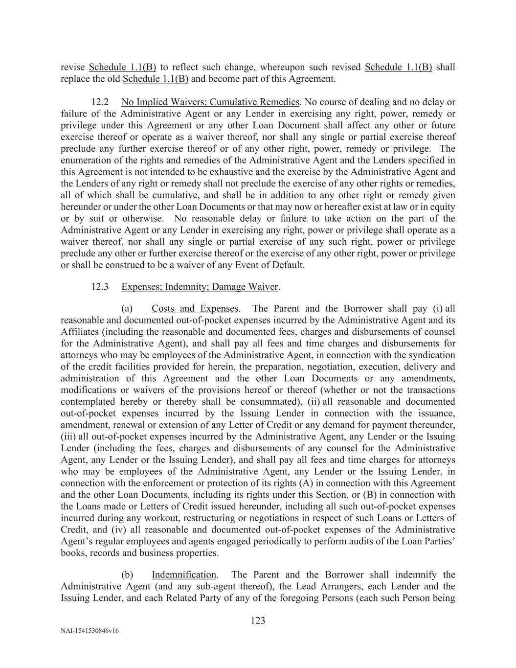 NAI-1541530846v16 123 revise Schedule 1.1(B) to reflect such change, whereupon such revised Schedule 1.1(B) shall replace the old Schedule 1.1(B) and become part of this Agreement. 12.2 No Implied Waivers; Cumulative Remedies. No course of dealing and no delay or failure of the Administrative Agent or any Lender in exercising any right, power, remedy or privilege under this Agreement or any other Loan Document shall affect any other or future exercise thereof or operate as a waiver thereof, nor shall any single or partial exercise thereof preclude any further exercise thereof or of any other right, power, remedy or privilege. The enumeration of the rights and remedies of the Administrative Agent and the Lenders specified in this Agreement is not intended to be exhaustive and the exercise by the Administrative Agent and the Lenders of any right or remedy shall not preclude the exercise of any other rights or remedies, all of which shall be cumulative, and shall be in addition to any other right or remedy given hereunder or under the other Loan Documents or that may now or hereafter exist at law or in equity or by suit or otherwise. No reasonable delay or failure to take action on the part of the Administrative Agent or any Lender in exercising any right, power or privilege shall operate as a waiver thereof, nor shall any single or partial exercise of any such right, power or privilege preclude any other or further exercise thereof or the exercise of any other right, power or privilege or shall be construed to be a waiver of any Event of Default. 12.3 Expenses; Indemnity; Damage Waiver. (a) Costs and Expenses. The Parent and the Borrower shall pay (i) all reasonable and documented out-of-pocket expenses incurred by the Administrative Agent and its Affiliates (including the reasonable and documented fees, charges and disbursements of counsel for the Administrative Agent), and shall pay all fees and time charges and disbursements for attorneys who may be employees of the Administrative Agent, in connection with the syndication of the credit facilities provided for herein, the preparation, negotiation, execution, delivery and administration of this Agreement and the other Loan Documents or any amendments, modifications or waivers of the provisions hereof or thereof (whether or not the transactions contemplated hereby or thereby shall be consummated), (ii) all reasonable and documented out-of-pocket expenses incurred by the Issuing Lender in connection with the issuance, amendment, renewal or extension of any Letter of Credit or any demand for payment thereunder, (iii) all out-of-pocket expenses incurred by the Administrative Agent, any Lender or the Issuing Lender (including the fees, charges and disbursements of any counsel for the Administrative Agent, any Lender or the Issuing Lender), and shall pay all fees and time charges for attorneys who may be employees of the Administrative Agent, any Lender or the Issuing Lender, in connection with the enforcement or protection of its rights (A) in connection with this Agreement and the other Loan Documents, including its rights under this Section, or (B) in connection with the Loans made or Letters of Credit issued hereunder, including all such out-of-pocket expenses incurred during any workout, restructuring or negotiations in respect of such Loans or Letters of Credit, and (iv) all reasonable and documented out-of-pocket expenses of the Administrative Agent’s regular employees and agents engaged periodically to perform audits of the Loan Parties’ books, records and business properties. (b) Indemnification. The Parent and the Borrower shall indemnify the Administrative Agent (and any sub-agent thereof), the Lead Arrangers, each Lender and the Issuing Lender, and each Related Party of any of the foregoing Persons (each such Person being