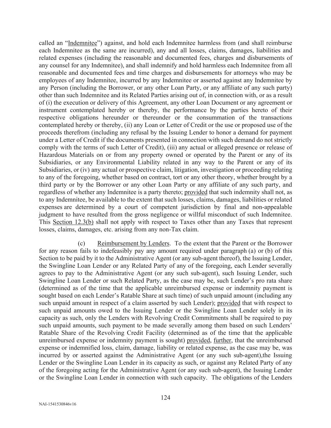 NAI-1541530846v16 124 called an “Indemnitee”) against, and hold each Indemnitee harmless from (and shall reimburse each Indemnitee as the same are incurred), any and all losses, claims, damages, liabilities and related expenses (including the reasonable and documented fees, charges and disbursements of any counsel for any Indemnitee), and shall indemnify and hold harmless each Indemnitee from all reasonable and documented fees and time charges and disbursements for attorneys who may be employees of any Indemnitee, incurred by any Indemnitee or asserted against any Indemnitee by any Person (including the Borrower, or any other Loan Party, or any affiliate of any such party) other than such Indemnitee and its Related Parties arising out of, in connection with, or as a result of (i) the execution or delivery of this Agreement, any other Loan Document or any agreement or instrument contemplated hereby or thereby, the performance by the parties hereto of their respective obligations hereunder or thereunder or the consummation of the transactions contemplated hereby or thereby, (ii) any Loan or Letter of Credit or the use or proposed use of the proceeds therefrom (including any refusal by the Issuing Lender to honor a demand for payment under a Letter of Credit if the documents presented in connection with such demand do not strictly comply with the terms of such Letter of Credit), (iii) any actual or alleged presence or release of Hazardous Materials on or from any property owned or operated by the Parent or any of its Subsidiaries, or any Environmental Liability related in any way to the Parent or any of its Subsidiaries, or (iv) any actual or prospective claim, litigation, investigation or proceeding relating to any of the foregoing, whether based on contract, tort or any other theory, whether brought by a third party or by the Borrower or any other Loan Party or any affiliate of any such party, and regardless of whether any Indemnitee is a party thereto; provided that such indemnity shall not, as to any Indemnitee, be available to the extent that such losses, claims, damages, liabilities or related expenses are determined by a court of competent jurisdiction by final and non-appealable judgment to have resulted from the gross negligence or willful misconduct of such Indemnitee. This Section 12.3(b) shall not apply with respect to Taxes other than any Taxes that represent losses, claims, damages, etc. arising from any non-Tax claim. (c) Reimbursement by Lenders. To the extent that the Parent or the Borrower for any reason fails to indefeasibly pay any amount required under paragraph (a) or (b) of this Section to be paid by it to the Administrative Agent (or any sub-agent thereof), the Issuing Lender, the Swingline Loan Lender or any Related Party of any of the foregoing, each Lender severally agrees to pay to the Administrative Agent (or any such sub-agent), such Issuing Lender, such Swingline Loan Lender or such Related Party, as the case may be, such Lender’s pro rata share (determined as of the time that the applicable unreimbursed expense or indemnity payment is sought based on each Lender’s Ratable Share at such time) of such unpaid amount (including any such unpaid amount in respect of a claim asserted by such Lender); provided that with respect to such unpaid amounts owed to the Issuing Lender or the Swingline Loan Lender solely in its capacity as such, only the Lenders with Revolving Credit Commitments shall be required to pay such unpaid amounts, such payment to be made severally among them based on such Lenders’ Ratable Share of the Revolving Credit Facility (determined as of the time that the applicable unreimbursed expense or indemnity payment is sought) provided, further, that the unreimbursed expense or indemnified loss, claim, damage, liability or related expense, as the case may be, was incurred by or asserted against the Administrative Agent (or any such sub-agent),the Issuing Lender or the Swingline Loan Lender in its capacity as such, or against any Related Party of any of the foregoing acting for the Administrative Agent (or any such sub-agent), the Issuing Lender or the Swingline Loan Lender in connection with such capacity. The obligations of the Lenders