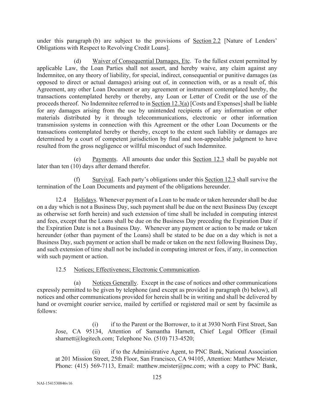 NAI-1541530846v16 125 under this paragraph (b) are subject to the provisions of Section 2.2 [Nature of Lenders’ Obligations with Respect to Revolving Credit Loans]. (d) Waiver of Consequential Damages, Etc. To the fullest extent permitted by applicable Law, the Loan Parties shall not assert, and hereby waive, any claim against any Indemnitee, on any theory of liability, for special, indirect, consequential or punitive damages (as opposed to direct or actual damages) arising out of, in connection with, or as a result of, this Agreement, any other Loan Document or any agreement or instrument contemplated hereby, the transactions contemplated hereby or thereby, any Loan or Letter of Credit or the use of the proceeds thereof. No Indemnitee referred to in Section 12.3(a) [Costs and Expenses] shall be liable for any damages arising from the use by unintended recipients of any information or other materials distributed by it through telecommunications, electronic or other information transmission systems in connection with this Agreement or the other Loan Documents or the transactions contemplated hereby or thereby, except to the extent such liability or damages are determined by a court of competent jurisdiction by final and non-appealable judgment to have resulted from the gross negligence or willful misconduct of such Indemnitee. (e) Payments. All amounts due under this Section 12.3 shall be payable not later than ten (10) days after demand therefor. (f) Survival. Each party’s obligations under this Section 12.3 shall survive the termination of the Loan Documents and payment of the obligations hereunder. 12.4 Holidays. Whenever payment of a Loan to be made or taken hereunder shall be due on a day which is not a Business Day, such payment shall be due on the next Business Day (except as otherwise set forth herein) and such extension of time shall be included in computing interest and fees, except that the Loans shall be due on the Business Day preceding the Expiration Date if the Expiration Date is not a Business Day. Whenever any payment or action to be made or taken hereunder (other than payment of the Loans) shall be stated to be due on a day which is not a Business Day, such payment or action shall be made or taken on the next following Business Day, and such extension of time shall not be included in computing interest or fees, if any, in connection with such payment or action. 12.5 Notices; Effectiveness; Electronic Communication. (a) Notices Generally. Except in the case of notices and other communications expressly permitted to be given by telephone (and except as provided in paragraph (b) below), all notices and other communications provided for herein shall be in writing and shall be delivered by hand or overnight courier service, mailed by certified or registered mail or sent by facsimile as follows: (i) if to the Parent or the Borrower, to it at 3930 North First Street, San Jose, CA 95134, Attention of Samantha Harnett, Chief Legal Officer (Email sharnett@logitech.com; Telephone No. (510) 713-4520; (ii) if to the Administrative Agent, to PNC Bank, National Association at 201 Mission Street, 25th Floor, San Francisco, CA 94105, Attention: Matthew Meister, Phone: (415) 569-7113, Email: matthew.meister@pnc.com; with a copy to PNC Bank,