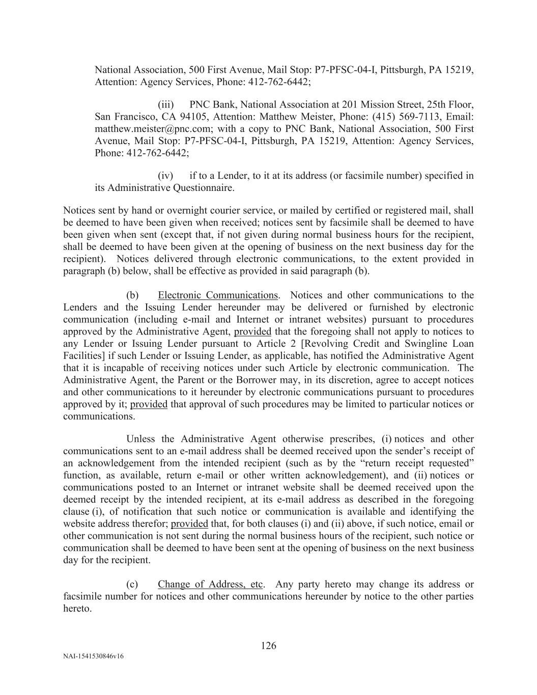 NAI-1541530846v16 126 National Association, 500 First Avenue, Mail Stop: P7-PFSC-04-I, Pittsburgh, PA 15219, Attention: Agency Services, Phone: 412-762-6442; (iii) PNC Bank, National Association at 201 Mission Street, 25th Floor, San Francisco, CA 94105, Attention: Matthew Meister, Phone: (415) 569-7113, Email: matthew.meister@pnc.com; with a copy to PNC Bank, National Association, 500 First Avenue, Mail Stop: P7-PFSC-04-I, Pittsburgh, PA 15219, Attention: Agency Services, Phone: 412-762-6442; (iv) if to a Lender, to it at its address (or facsimile number) specified in its Administrative Questionnaire. Notices sent by hand or overnight courier service, or mailed by certified or registered mail, shall be deemed to have been given when received; notices sent by facsimile shall be deemed to have been given when sent (except that, if not given during normal business hours for the recipient, shall be deemed to have been given at the opening of business on the next business day for the recipient). Notices delivered through electronic communications, to the extent provided in paragraph (b) below, shall be effective as provided in said paragraph (b). (b) Electronic Communications. Notices and other communications to the Lenders and the Issuing Lender hereunder may be delivered or furnished by electronic communication (including e-mail and Internet or intranet websites) pursuant to procedures approved by the Administrative Agent, provided that the foregoing shall not apply to notices to any Lender or Issuing Lender pursuant to Article 2 [Revolving Credit and Swingline Loan Facilities] if such Lender or Issuing Lender, as applicable, has notified the Administrative Agent that it is incapable of receiving notices under such Article by electronic communication. The Administrative Agent, the Parent or the Borrower may, in its discretion, agree to accept notices and other communications to it hereunder by electronic communications pursuant to procedures approved by it; provided that approval of such procedures may be limited to particular notices or communications. Unless the Administrative Agent otherwise prescribes, (i) notices and other communications sent to an e-mail address shall be deemed received upon the sender’s receipt of an acknowledgement from the intended recipient (such as by the “return receipt requested” function, as available, return e-mail or other written acknowledgement), and (ii) notices or communications posted to an Internet or intranet website shall be deemed received upon the deemed receipt by the intended recipient, at its e-mail address as described in the foregoing clause (i), of notification that such notice or communication is available and identifying the website address therefor; provided that, for both clauses (i) and (ii) above, if such notice, email or other communication is not sent during the normal business hours of the recipient, such notice or communication shall be deemed to have been sent at the opening of business on the next business day for the recipient. (c) Change of Address, etc. Any party hereto may change its address or facsimile number for notices and other communications hereunder by notice to the other parties hereto.