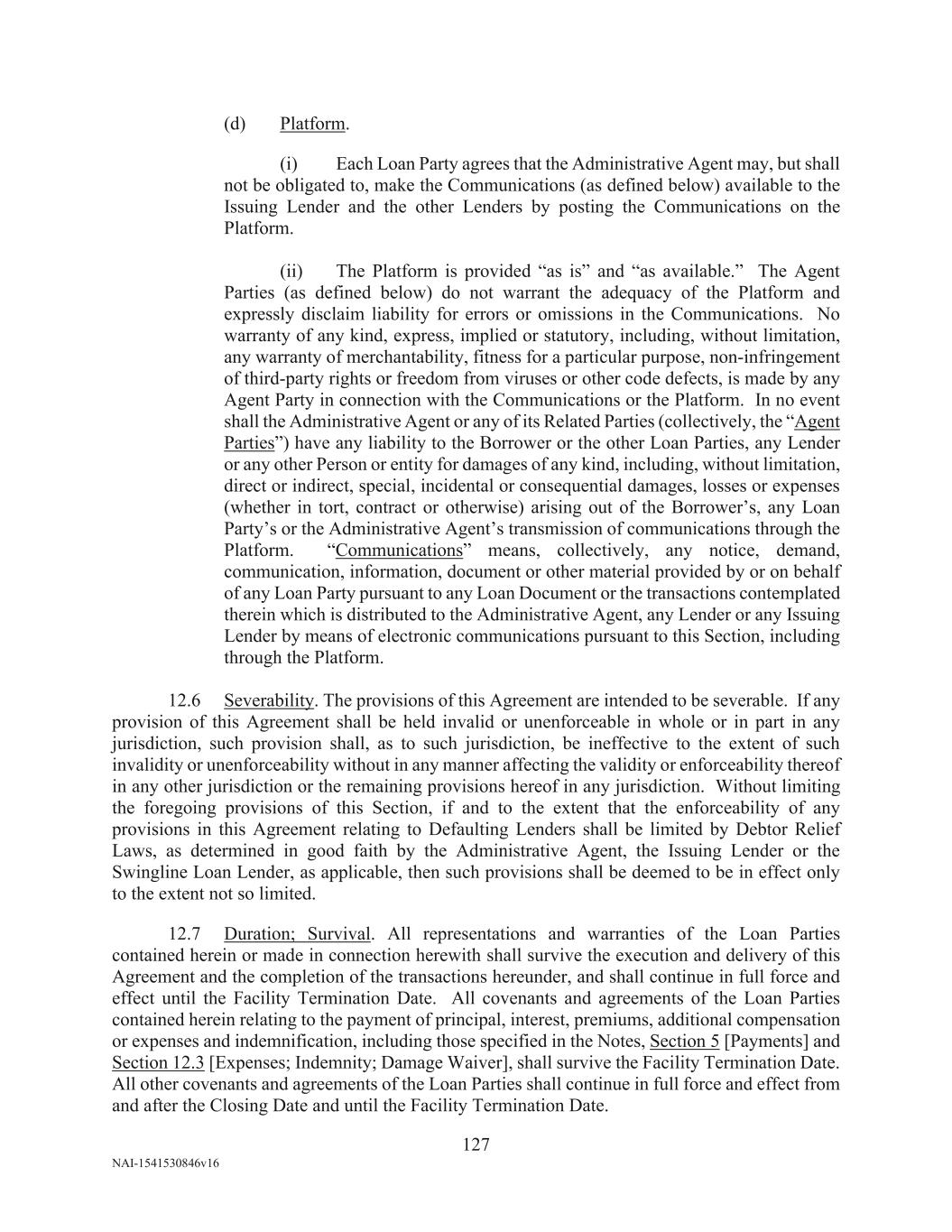 NAI-1541530846v16 127 (d) Platform. (i) Each Loan Party agrees that the Administrative Agent may, but shall not be obligated to, make the Communications (as defined below) available to the Issuing Lender and the other Lenders by posting the Communications on the Platform. (ii) The Platform is provided “as is” and “as available.” The Agent Parties (as defined below) do not warrant the adequacy of the Platform and expressly disclaim liability for errors or omissions in the Communications. No warranty of any kind, express, implied or statutory, including, without limitation, any warranty of merchantability, fitness for a particular purpose, non-infringement of third-party rights or freedom from viruses or other code defects, is made by any Agent Party in connection with the Communications or the Platform. In no event shall the Administrative Agent or any of its Related Parties (collectively, the “Agent Parties”) have any liability to the Borrower or the other Loan Parties, any Lender or any other Person or entity for damages of any kind, including, without limitation, direct or indirect, special, incidental or consequential damages, losses or expenses (whether in tort, contract or otherwise) arising out of the Borrower’s, any Loan Party’s or the Administrative Agent’s transmission of communications through the Platform. “Communications” means, collectively, any notice, demand, communication, information, document or other material provided by or on behalf of any Loan Party pursuant to any Loan Document or the transactions contemplated therein which is distributed to the Administrative Agent, any Lender or any Issuing Lender by means of electronic communications pursuant to this Section, including through the Platform. 12.6 Severability. The provisions of this Agreement are intended to be severable. If any provision of this Agreement shall be held invalid or unenforceable in whole or in part in any jurisdiction, such provision shall, as to such jurisdiction, be ineffective to the extent of such invalidity or unenforceability without in any manner affecting the validity or enforceability thereof in any other jurisdiction or the remaining provisions hereof in any jurisdiction. Without limiting the foregoing provisions of this Section, if and to the extent that the enforceability of any provisions in this Agreement relating to Defaulting Lenders shall be limited by Debtor Relief Laws, as determined in good faith by the Administrative Agent, the Issuing Lender or the Swingline Loan Lender, as applicable, then such provisions shall be deemed to be in effect only to the extent not so limited. 12.7 Duration; Survival. All representations and warranties of the Loan Parties contained herein or made in connection herewith shall survive the execution and delivery of this Agreement and the completion of the transactions hereunder, and shall continue in full force and effect until the Facility Termination Date. All covenants and agreements of the Loan Parties contained herein relating to the payment of principal, interest, premiums, additional compensation or expenses and indemnification, including those specified in the Notes, Section 5 [Payments] and Section 12.3 [Expenses; Indemnity; Damage Waiver], shall survive the Facility Termination Date. All other covenants and agreements of the Loan Parties shall continue in full force and effect from and after the Closing Date and until the Facility Termination Date.