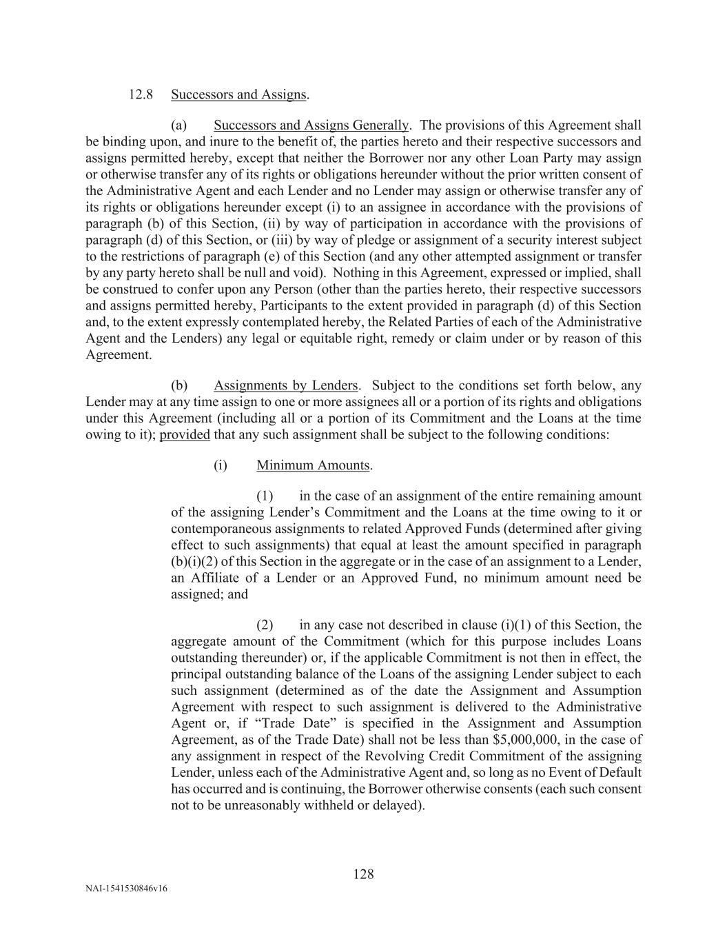 NAI-1541530846v16 128 12.8 Successors and Assigns. (a) Successors and Assigns Generally. The provisions of this Agreement shall be binding upon, and inure to the benefit of, the parties hereto and their respective successors and assigns permitted hereby, except that neither the Borrower nor any other Loan Party may assign or otherwise transfer any of its rights or obligations hereunder without the prior written consent of the Administrative Agent and each Lender and no Lender may assign or otherwise transfer any of its rights or obligations hereunder except (i) to an assignee in accordance with the provisions of paragraph (b) of this Section, (ii) by way of participation in accordance with the provisions of paragraph (d) of this Section, or (iii) by way of pledge or assignment of a security interest subject to the restrictions of paragraph (e) of this Section (and any other attempted assignment or transfer by any party hereto shall be null and void). Nothing in this Agreement, expressed or implied, shall be construed to confer upon any Person (other than the parties hereto, their respective successors and assigns permitted hereby, Participants to the extent provided in paragraph (d) of this Section and, to the extent expressly contemplated hereby, the Related Parties of each of the Administrative Agent and the Lenders) any legal or equitable right, remedy or claim under or by reason of this Agreement. (b) Assignments by Lenders. Subject to the conditions set forth below, any Lender may at any time assign to one or more assignees all or a portion of its rights and obligations under this Agreement (including all or a portion of its Commitment and the Loans at the time owing to it); provided that any such assignment shall be subject to the following conditions: (i) Minimum Amounts. (1) in the case of an assignment of the entire remaining amount of the assigning Lender’s Commitment and the Loans at the time owing to it or contemporaneous assignments to related Approved Funds (determined after giving effect to such assignments) that equal at least the amount specified in paragraph (b)(i)(2) of this Section in the aggregate or in the case of an assignment to a Lender, an Affiliate of a Lender or an Approved Fund, no minimum amount need be assigned; and (2) in any case not described in clause (i)(1) of this Section, the aggregate amount of the Commitment (which for this purpose includes Loans outstanding thereunder) or, if the applicable Commitment is not then in effect, the principal outstanding balance of the Loans of the assigning Lender subject to each such assignment (determined as of the date the Assignment and Assumption Agreement with respect to such assignment is delivered to the Administrative Agent or, if “Trade Date” is specified in the Assignment and Assumption Agreement, as of the Trade Date) shall not be less than $5,000,000, in the case of any assignment in respect of the Revolving Credit Commitment of the assigning Lender, unless each of the Administrative Agent and, so long as no Event of Default has occurred and is continuing, the Borrower otherwise consents (each such consent not to be unreasonably withheld or delayed).