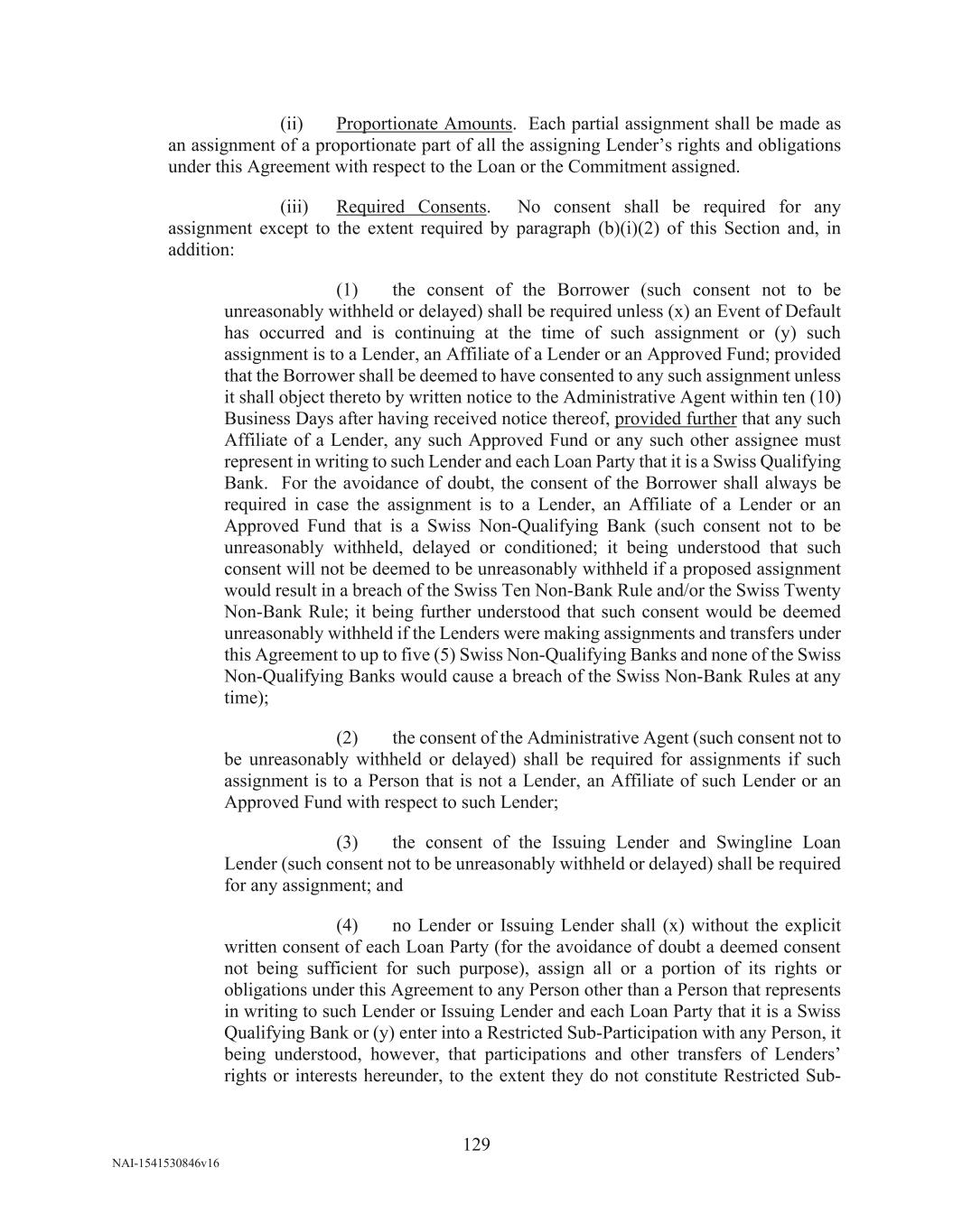 NAI-1541530846v16 129 (ii) Proportionate Amounts. Each partial assignment shall be made as an assignment of a proportionate part of all the assigning Lender’s rights and obligations under this Agreement with respect to the Loan or the Commitment assigned. (iii) Required Consents. No consent shall be required for any assignment except to the extent required by paragraph (b)(i)(2) of this Section and, in addition: (1) the consent of the Borrower (such consent not to be unreasonably withheld or delayed) shall be required unless (x) an Event of Default has occurred and is continuing at the time of such assignment or (y) such assignment is to a Lender, an Affiliate of a Lender or an Approved Fund; provided that the Borrower shall be deemed to have consented to any such assignment unless it shall object thereto by written notice to the Administrative Agent within ten (10) Business Days after having received notice thereof, provided further that any such Affiliate of a Lender, any such Approved Fund or any such other assignee must represent in writing to such Lender and each Loan Party that it is a Swiss Qualifying Bank. For the avoidance of doubt, the consent of the Borrower shall always be required in case the assignment is to a Lender, an Affiliate of a Lender or an Approved Fund that is a Swiss Non-Qualifying Bank (such consent not to be unreasonably withheld, delayed or conditioned; it being understood that such consent will not be deemed to be unreasonably withheld if a proposed assignment would result in a breach of the Swiss Ten Non-Bank Rule and/or the Swiss Twenty Non-Bank Rule; it being further understood that such consent would be deemed unreasonably withheld if the Lenders were making assignments and transfers under this Agreement to up to five (5) Swiss Non-Qualifying Banks and none of the Swiss Non-Qualifying Banks would cause a breach of the Swiss Non-Bank Rules at any time); (2) the consent of the Administrative Agent (such consent not to be unreasonably withheld or delayed) shall be required for assignments if such assignment is to a Person that is not a Lender, an Affiliate of such Lender or an Approved Fund with respect to such Lender; (3) the consent of the Issuing Lender and Swingline Loan Lender (such consent not to be unreasonably withheld or delayed) shall be required for any assignment; and (4) no Lender or Issuing Lender shall (x) without the explicit written consent of each Loan Party (for the avoidance of doubt a deemed consent not being sufficient for such purpose), assign all or a portion of its rights or obligations under this Agreement to any Person other than a Person that represents in writing to such Lender or Issuing Lender and each Loan Party that it is a Swiss Qualifying Bank or (y) enter into a Restricted Sub-Participation with any Person, it being understood, however, that participations and other transfers of Lenders’ rights or interests hereunder, to the extent they do not constitute Restricted Sub-