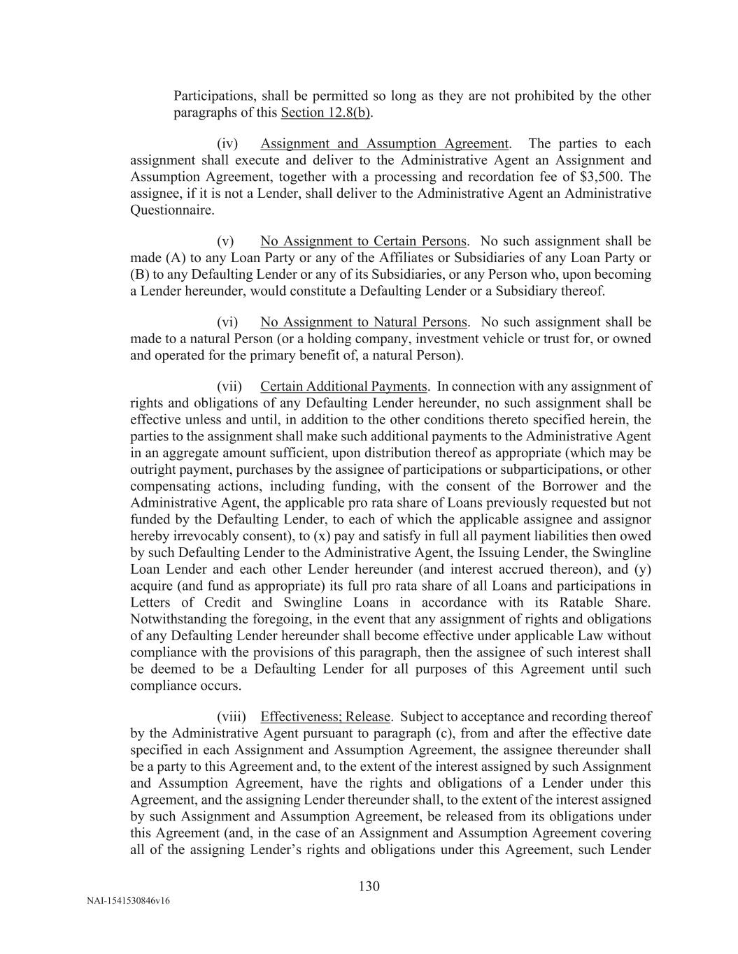 NAI-1541530846v16 130 Participations, shall be permitted so long as they are not prohibited by the other paragraphs of this Section 12.8(b). (iv) Assignment and Assumption Agreement. The parties to each assignment shall execute and deliver to the Administrative Agent an Assignment and Assumption Agreement, together with a processing and recordation fee of $3,500. The assignee, if it is not a Lender, shall deliver to the Administrative Agent an Administrative Questionnaire. (v) No Assignment to Certain Persons. No such assignment shall be made (A) to any Loan Party or any of the Affiliates or Subsidiaries of any Loan Party or (B) to any Defaulting Lender or any of its Subsidiaries, or any Person who, upon becoming a Lender hereunder, would constitute a Defaulting Lender or a Subsidiary thereof. (vi) No Assignment to Natural Persons. No such assignment shall be made to a natural Person (or a holding company, investment vehicle or trust for, or owned and operated for the primary benefit of, a natural Person). (vii) Certain Additional Payments. In connection with any assignment of rights and obligations of any Defaulting Lender hereunder, no such assignment shall be effective unless and until, in addition to the other conditions thereto specified herein, the parties to the assignment shall make such additional payments to the Administrative Agent in an aggregate amount sufficient, upon distribution thereof as appropriate (which may be outright payment, purchases by the assignee of participations or subparticipations, or other compensating actions, including funding, with the consent of the Borrower and the Administrative Agent, the applicable pro rata share of Loans previously requested but not funded by the Defaulting Lender, to each of which the applicable assignee and assignor hereby irrevocably consent), to (x) pay and satisfy in full all payment liabilities then owed by such Defaulting Lender to the Administrative Agent, the Issuing Lender, the Swingline Loan Lender and each other Lender hereunder (and interest accrued thereon), and (y) acquire (and fund as appropriate) its full pro rata share of all Loans and participations in Letters of Credit and Swingline Loans in accordance with its Ratable Share. Notwithstanding the foregoing, in the event that any assignment of rights and obligations of any Defaulting Lender hereunder shall become effective under applicable Law without compliance with the provisions of this paragraph, then the assignee of such interest shall be deemed to be a Defaulting Lender for all purposes of this Agreement until such compliance occurs. (viii) Effectiveness; Release. Subject to acceptance and recording thereof by the Administrative Agent pursuant to paragraph (c), from and after the effective date specified in each Assignment and Assumption Agreement, the assignee thereunder shall be a party to this Agreement and, to the extent of the interest assigned by such Assignment and Assumption Agreement, have the rights and obligations of a Lender under this Agreement, and the assigning Lender thereunder shall, to the extent of the interest assigned by such Assignment and Assumption Agreement, be released from its obligations under this Agreement (and, in the case of an Assignment and Assumption Agreement covering all of the assigning Lender’s rights and obligations under this Agreement, such Lender