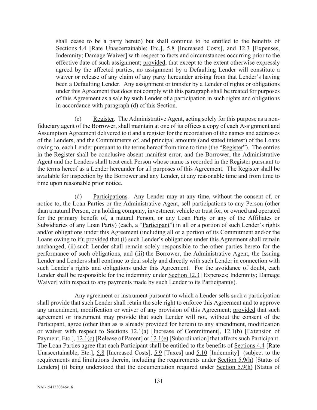 NAI-1541530846v16 131 shall cease to be a party hereto) but shall continue to be entitled to the benefits of Sections 4.4 [Rate Unascertainable; Etc.], 5.8 [Increased Costs], and 12.3 [Expenses, Indemnity; Damage Waiver] with respect to facts and circumstances occurring prior to the effective date of such assignment; provided, that except to the extent otherwise expressly agreed by the affected parties, no assignment by a Defaulting Lender will constitute a waiver or release of any claim of any party hereunder arising from that Lender’s having been a Defaulting Lender. Any assignment or transfer by a Lender of rights or obligations under this Agreement that does not comply with this paragraph shall be treated for purposes of this Agreement as a sale by such Lender of a participation in such rights and obligations in accordance with paragraph (d) of this Section. (c) Register. The Administrative Agent, acting solely for this purpose as a non- fiduciary agent of the Borrower, shall maintain at one of its offices a copy of each Assignment and Assumption Agreement delivered to it and a register for the recordation of the names and addresses of the Lenders, and the Commitments of, and principal amounts (and stated interest) of the Loans owing to, each Lender pursuant to the terms hereof from time to time (the “Register”). The entries in the Register shall be conclusive absent manifest error, and the Borrower, the Administrative Agent and the Lenders shall treat each Person whose name is recorded in the Register pursuant to the terms hereof as a Lender hereunder for all purposes of this Agreement. The Register shall be available for inspection by the Borrower and any Lender, at any reasonable time and from time to time upon reasonable prior notice. (d) Participations. Any Lender may at any time, without the consent of, or notice to, the Loan Parties or the Administrative Agent, sell participations to any Person (other than a natural Person, or a holding company, investment vehicle or trust for, or owned and operated for the primary benefit of, a natural Person, or any Loan Party or any of the Affiliates or Subsidiaries of any Loan Party) (each, a “Participant”) in all or a portion of such Lender’s rights and/or obligations under this Agreement (including all or a portion of its Commitment and/or the Loans owing to it); provided that (i) such Lender’s obligations under this Agreement shall remain unchanged, (ii) such Lender shall remain solely responsible to the other parties hereto for the performance of such obligations, and (iii) the Borrower, the Administrative Agent, the Issuing Lender and Lenders shall continue to deal solely and directly with such Lender in connection with such Lender’s rights and obligations under this Agreement. For the avoidance of doubt, each Lender shall be responsible for the indemnity under Section 12.3 [Expenses; Indemnity; Damage Waiver] with respect to any payments made by such Lender to its Participant(s). Any agreement or instrument pursuant to which a Lender sells such a participation shall provide that such Lender shall retain the sole right to enforce this Agreement and to approve any amendment, modification or waiver of any provision of this Agreement; provided that such agreement or instrument may provide that such Lender will not, without the consent of the Participant, agree (other than as is already provided for herein) to any amendment, modification or waiver with respect to Sections 12.1(a) [Increase of Commitment], 12.1(b) [Extension of Payment, Etc.], 12.1(c) [Release of Parent] or 12.1(e) [Subordination] that affects such Participant. The Loan Parties agree that each Participant shall be entitled to the benefits of Sections 4.4 [Rate Unascertainable, Etc.], 5.8 [Increased Costs], 5.9 [Taxes] and 5.10 [Indemnity] (subject to the requirements and limitations therein, including the requirements under Section 5.9(h) [Status of Lenders] (it being understood that the documentation required under Section 5.9(h) [Status of