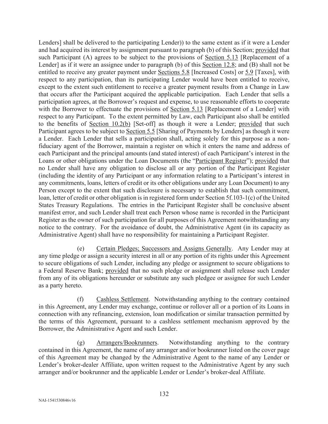 NAI-1541530846v16 132 Lenders] shall be delivered to the participating Lender)) to the same extent as if it were a Lender and had acquired its interest by assignment pursuant to paragraph (b) of this Section; provided that such Participant (A) agrees to be subject to the provisions of Section 5.13 [Replacement of a Lender] as if it were an assignee under to paragraph (b) of this Section 12.8; and (B) shall not be entitled to receive any greater payment under Sections 5.8 [Increased Costs] or 5.9 [Taxes], with respect to any participation, than its participating Lender would have been entitled to receive, except to the extent such entitlement to receive a greater payment results from a Change in Law that occurs after the Participant acquired the applicable participation. Each Lender that sells a participation agrees, at the Borrower’s request and expense, to use reasonable efforts to cooperate with the Borrower to effectuate the provisions of Section 5.13 [Replacement of a Lender] with respect to any Participant. To the extent permitted by Law, each Participant also shall be entitled to the benefits of Section 10.2(b) [Set-off] as though it were a Lender; provided that such Participant agrees to be subject to Section 5.5 [Sharing of Payments by Lenders] as though it were a Lender. Each Lender that sells a participation shall, acting solely for this purpose as a non- fiduciary agent of the Borrower, maintain a register on which it enters the name and address of each Participant and the principal amounts (and stated interest) of each Participant’s interest in the Loans or other obligations under the Loan Documents (the “Participant Register”); provided that no Lender shall have any obligation to disclose all or any portion of the Participant Register (including the identity of any Participant or any information relating to a Participant’s interest in any commitments, loans, letters of credit or its other obligations under any Loan Document) to any Person except to the extent that such disclosure is necessary to establish that such commitment, loan, letter of credit or other obligation is in registered form under Section 5f.103-1(c) of the United States Treasury Regulations. The entries in the Participant Register shall be conclusive absent manifest error, and such Lender shall treat each Person whose name is recorded in the Participant Register as the owner of such participation for all purposes of this Agreement notwithstanding any notice to the contrary. For the avoidance of doubt, the Administrative Agent (in its capacity as Administrative Agent) shall have no responsibility for maintaining a Participant Register. (e) Certain Pledges; Successors and Assigns Generally. Any Lender may at any time pledge or assign a security interest in all or any portion of its rights under this Agreement to secure obligations of such Lender, including any pledge or assignment to secure obligations to a Federal Reserve Bank; provided that no such pledge or assignment shall release such Lender from any of its obligations hereunder or substitute any such pledgee or assignee for such Lender as a party hereto. (f) Cashless Settlement. Notwithstanding anything to the contrary contained in this Agreement, any Lender may exchange, continue or rollover all or a portion of its Loans in connection with any refinancing, extension, loan modification or similar transaction permitted by the terms of this Agreement, pursuant to a cashless settlement mechanism approved by the Borrower, the Administrative Agent and such Lender. (g) Arrangers/Bookrunners. Notwithstanding anything to the contrary contained in this Agreement, the name of any arranger and/or bookrunner listed on the cover page of this Agreement may be changed by the Administrative Agent to the name of any Lender or Lender’s broker-dealer Affiliate, upon written request to the Administrative Agent by any such arranger and/or bookrunner and the applicable Lender or Lender’s broker-deal Affiliate.