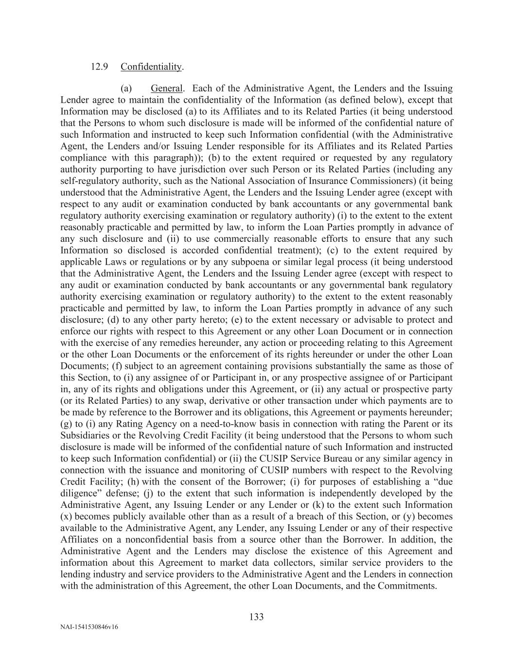 NAI-1541530846v16 133 12.9 Confidentiality. (a) General. Each of the Administrative Agent, the Lenders and the Issuing Lender agree to maintain the confidentiality of the Information (as defined below), except that Information may be disclosed (a) to its Affiliates and to its Related Parties (it being understood that the Persons to whom such disclosure is made will be informed of the confidential nature of such Information and instructed to keep such Information confidential (with the Administrative Agent, the Lenders and/or Issuing Lender responsible for its Affiliates and its Related Parties compliance with this paragraph)); (b) to the extent required or requested by any regulatory authority purporting to have jurisdiction over such Person or its Related Parties (including any self-regulatory authority, such as the National Association of Insurance Commissioners) (it being understood that the Administrative Agent, the Lenders and the Issuing Lender agree (except with respect to any audit or examination conducted by bank accountants or any governmental bank regulatory authority exercising examination or regulatory authority) (i) to the extent to the extent reasonably practicable and permitted by law, to inform the Loan Parties promptly in advance of any such disclosure and (ii) to use commercially reasonable efforts to ensure that any such Information so disclosed is accorded confidential treatment); (c) to the extent required by applicable Laws or regulations or by any subpoena or similar legal process (it being understood that the Administrative Agent, the Lenders and the Issuing Lender agree (except with respect to any audit or examination conducted by bank accountants or any governmental bank regulatory authority exercising examination or regulatory authority) to the extent to the extent reasonably practicable and permitted by law, to inform the Loan Parties promptly in advance of any such disclosure; (d) to any other party hereto; (e) to the extent necessary or advisable to protect and enforce our rights with respect to this Agreement or any other Loan Document or in connection with the exercise of any remedies hereunder, any action or proceeding relating to this Agreement or the other Loan Documents or the enforcement of its rights hereunder or under the other Loan Documents; (f) subject to an agreement containing provisions substantially the same as those of this Section, to (i) any assignee of or Participant in, or any prospective assignee of or Participant in, any of its rights and obligations under this Agreement, or (ii) any actual or prospective party (or its Related Parties) to any swap, derivative or other transaction under which payments are to be made by reference to the Borrower and its obligations, this Agreement or payments hereunder; (g) to (i) any Rating Agency on a need-to-know basis in connection with rating the Parent or its Subsidiaries or the Revolving Credit Facility (it being understood that the Persons to whom such disclosure is made will be informed of the confidential nature of such Information and instructed to keep such Information confidential) or (ii) the CUSIP Service Bureau or any similar agency in connection with the issuance and monitoring of CUSIP numbers with respect to the Revolving Credit Facility; (h) with the consent of the Borrower; (i) for purposes of establishing a “due diligence” defense; (j) to the extent that such information is independently developed by the Administrative Agent, any Issuing Lender or any Lender or (k) to the extent such Information (x) becomes publicly available other than as a result of a breach of this Section, or (y) becomes available to the Administrative Agent, any Lender, any Issuing Lender or any of their respective Affiliates on a nonconfidential basis from a source other than the Borrower. In addition, the Administrative Agent and the Lenders may disclose the existence of this Agreement and information about this Agreement to market data collectors, similar service providers to the lending industry and service providers to the Administrative Agent and the Lenders in connection with the administration of this Agreement, the other Loan Documents, and the Commitments.