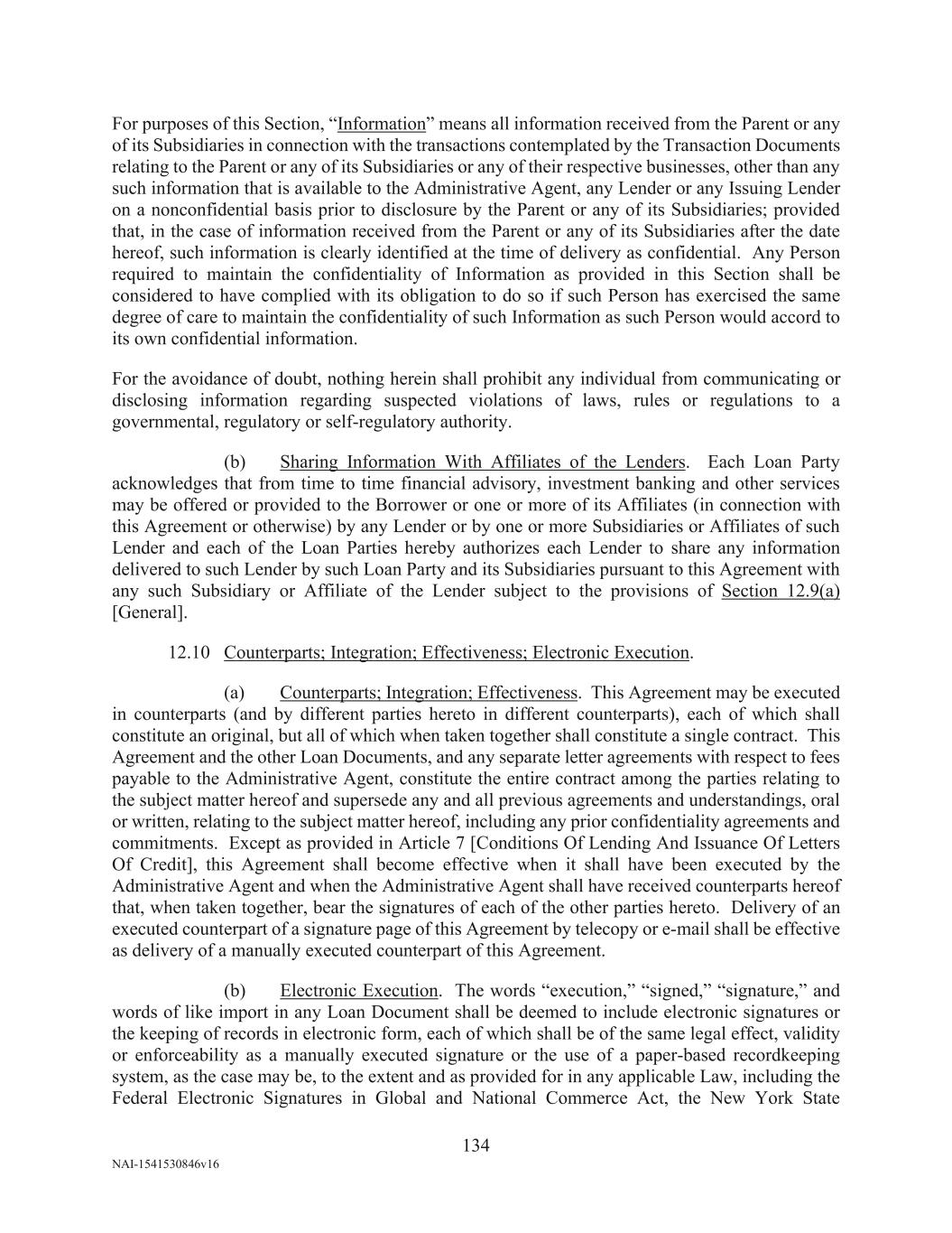 NAI-1541530846v16 134 For purposes of this Section, “Information” means all information received from the Parent or any of its Subsidiaries in connection with the transactions contemplated by the Transaction Documents relating to the Parent or any of its Subsidiaries or any of their respective businesses, other than any such information that is available to the Administrative Agent, any Lender or any Issuing Lender on a nonconfidential basis prior to disclosure by the Parent or any of its Subsidiaries; provided that, in the case of information received from the Parent or any of its Subsidiaries after the date hereof, such information is clearly identified at the time of delivery as confidential. Any Person required to maintain the confidentiality of Information as provided in this Section shall be considered to have complied with its obligation to do so if such Person has exercised the same degree of care to maintain the confidentiality of such Information as such Person would accord to its own confidential information. For the avoidance of doubt, nothing herein shall prohibit any individual from communicating or disclosing information regarding suspected violations of laws, rules or regulations to a governmental, regulatory or self-regulatory authority. (b) Sharing Information With Affiliates of the Lenders. Each Loan Party acknowledges that from time to time financial advisory, investment banking and other services may be offered or provided to the Borrower or one or more of its Affiliates (in connection with this Agreement or otherwise) by any Lender or by one or more Subsidiaries or Affiliates of such Lender and each of the Loan Parties hereby authorizes each Lender to share any information delivered to such Lender by such Loan Party and its Subsidiaries pursuant to this Agreement with any such Subsidiary or Affiliate of the Lender subject to the provisions of Section 12.9(a) [General]. 12.10 Counterparts; Integration; Effectiveness; Electronic Execution. (a) Counterparts; Integration; Effectiveness. This Agreement may be executed in counterparts (and by different parties hereto in different counterparts), each of which shall constitute an original, but all of which when taken together shall constitute a single contract. This Agreement and the other Loan Documents, and any separate letter agreements with respect to fees payable to the Administrative Agent, constitute the entire contract among the parties relating to the subject matter hereof and supersede any and all previous agreements and understandings, oral or written, relating to the subject matter hereof, including any prior confidentiality agreements and commitments. Except as provided in Article 7 [Conditions Of Lending And Issuance Of Letters Of Credit], this Agreement shall become effective when it shall have been executed by the Administrative Agent and when the Administrative Agent shall have received counterparts hereof that, when taken together, bear the signatures of each of the other parties hereto. Delivery of an executed counterpart of a signature page of this Agreement by telecopy or e-mail shall be effective as delivery of a manually executed counterpart of this Agreement. (b) Electronic Execution. The words “execution,” “signed,” “signature,” and words of like import in any Loan Document shall be deemed to include electronic signatures or the keeping of records in electronic form, each of which shall be of the same legal effect, validity or enforceability as a manually executed signature or the use of a paper-based recordkeeping system, as the case may be, to the extent and as provided for in any applicable Law, including the Federal Electronic Signatures in Global and National Commerce Act, the New York State
