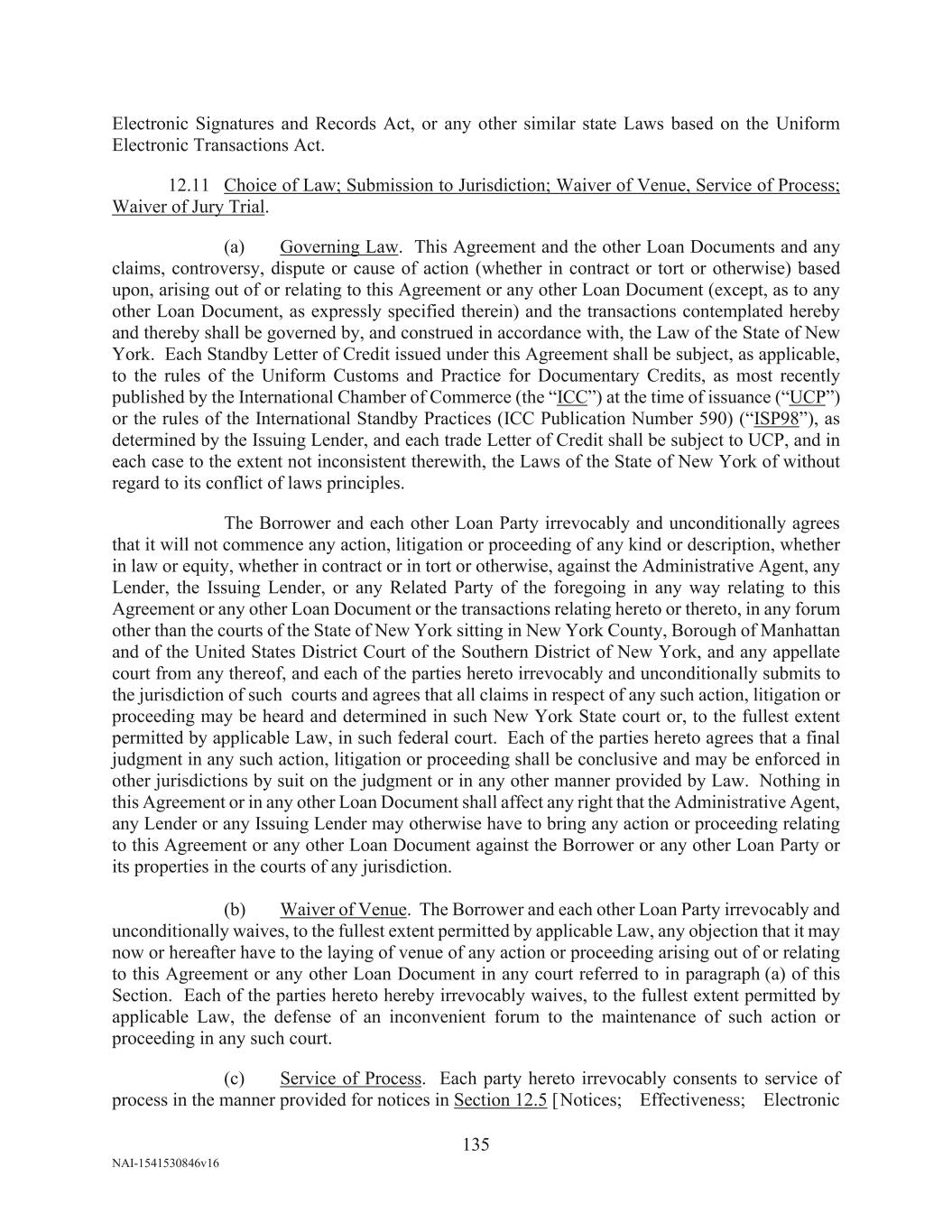 NAI-1541530846v16 135 Electronic Signatures and Records Act, or any other similar state Laws based on the Uniform Electronic Transactions Act. 12.11 Choice of Law; Submission to Jurisdiction; Waiver of Venue, Service of Process; Waiver of Jury Trial. (a) Governing Law. This Agreement and the other Loan Documents and any claims, controversy, dispute or cause of action (whether in contract or tort or otherwise) based upon, arising out of or relating to this Agreement or any other Loan Document (except, as to any other Loan Document, as expressly specified therein) and the transactions contemplated hereby and thereby shall be governed by, and construed in accordance with, the Law of the State of New York. Each Standby Letter of Credit issued under this Agreement shall be subject, as applicable, to the rules of the Uniform Customs and Practice for Documentary Credits, as most recently published by the International Chamber of Commerce (the “ICC”) at the time of issuance (“UCP”) or the rules of the International Standby Practices (ICC Publication Number 590) (“ISP98”), as determined by the Issuing Lender, and each trade Letter of Credit shall be subject to UCP, and in each case to the extent not inconsistent therewith, the Laws of the State of New York of without regard to its conflict of laws principles. The Borrower and each other Loan Party irrevocably and unconditionally agrees that it will not commence any action, litigation or proceeding of any kind or description, whether in law or equity, whether in contract or in tort or otherwise, against the Administrative Agent, any Lender, the Issuing Lender, or any Related Party of the foregoing in any way relating to this Agreement or any other Loan Document or the transactions relating hereto or thereto, in any forum other than the courts of the State of New York sitting in New York County, Borough of Manhattan and of the United States District Court of the Southern District of New York, and any appellate court from any thereof, and each of the parties hereto irrevocably and unconditionally submits to the jurisdiction of such courts and agrees that all claims in respect of any such action, litigation or proceeding may be heard and determined in such New York State court or, to the fullest extent permitted by applicable Law, in such federal court. Each of the parties hereto agrees that a final judgment in any such action, litigation or proceeding shall be conclusive and may be enforced in other jurisdictions by suit on the judgment or in any other manner provided by Law. Nothing in this Agreement or in any other Loan Document shall affect any right that the Administrative Agent, any Lender or any Issuing Lender may otherwise have to bring any action or proceeding relating to this Agreement or any other Loan Document against the Borrower or any other Loan Party or its properties in the courts of any jurisdiction. (b) Waiver of Venue. The Borrower and each other Loan Party irrevocably and unconditionally waives, to the fullest extent permitted by applicable Law, any objection that it may now or hereafter have to the laying of venue of any action or proceeding arising out of or relating to this Agreement or any other Loan Document in any court referred to in paragraph (a) of this Section. Each of the parties hereto hereby irrevocably waives, to the fullest extent permitted by applicable Law, the defense of an inconvenient forum to the maintenance of such action or proceeding in any such court. (c) Service of Process. Each party hereto irrevocably consents to service of process in the manner provided for notices in Section 12.5 [ Notices; Effectiveness; Electronic