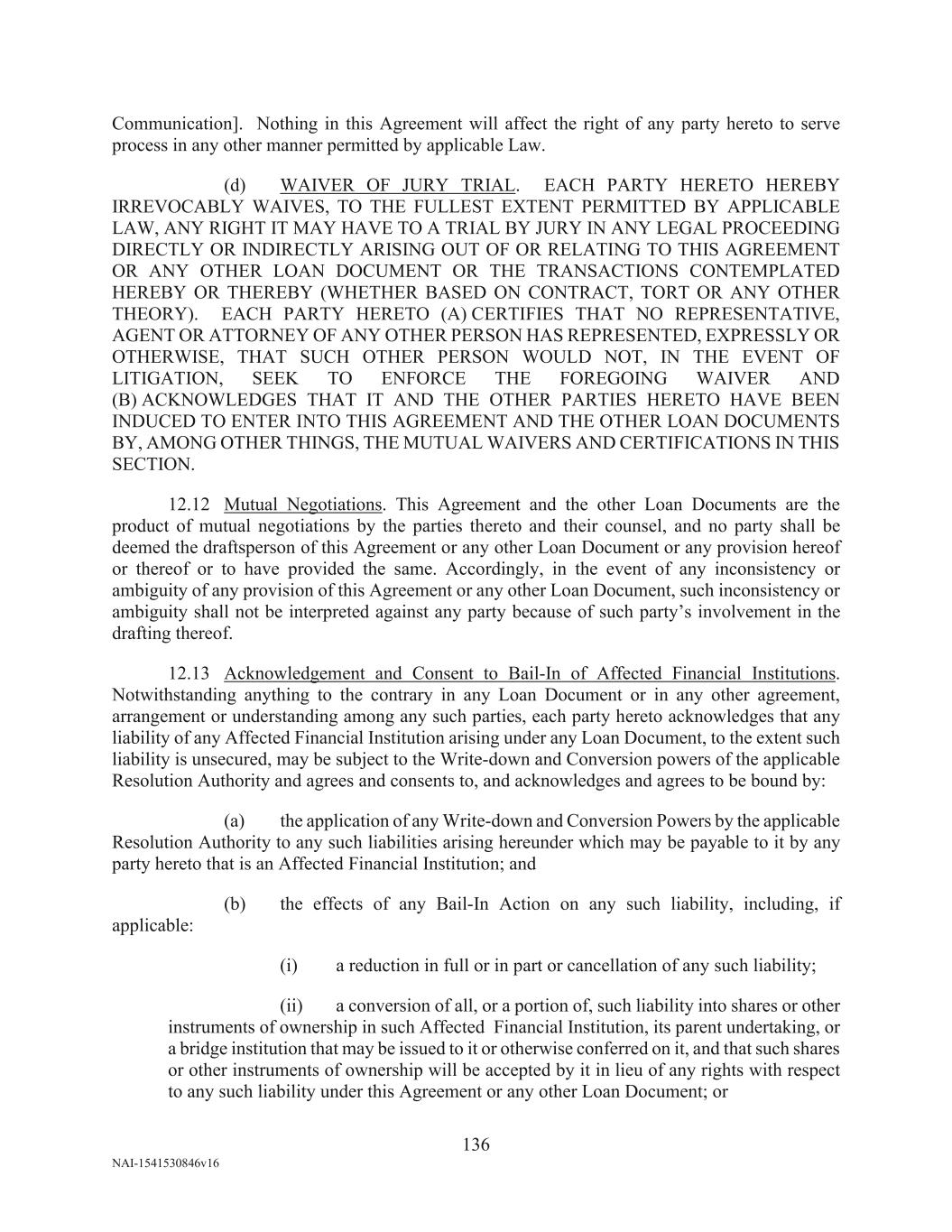 NAI-1541530846v16 136 Communication]. Nothing in this Agreement will affect the right of any party hereto to serve process in any other manner permitted by applicable Law. (d) WAIVER OF JURY TRIAL. EACH PARTY HERETO HEREBY IRREVOCABLY WAIVES, TO THE FULLEST EXTENT PERMITTED BY APPLICABLE LAW, ANY RIGHT IT MAY HAVE TO A TRIAL BY JURY IN ANY LEGAL PROCEEDING DIRECTLY OR INDIRECTLY ARISING OUT OF OR RELATING TO THIS AGREEMENT OR ANY OTHER LOAN DOCUMENT OR THE TRANSACTIONS CONTEMPLATED HEREBY OR THEREBY (WHETHER BASED ON CONTRACT, TORT OR ANY OTHER THEORY). EACH PARTY HERETO (A) CERTIFIES THAT NO REPRESENTATIVE, AGENT OR ATTORNEY OF ANY OTHER PERSON HAS REPRESENTED, EXPRESSLY OR OTHERWISE, THAT SUCH OTHER PERSON WOULD NOT, IN THE EVENT OF LITIGATION, SEEK TO ENFORCE THE FOREGOING WAIVER AND (B) ACKNOWLEDGES THAT IT AND THE OTHER PARTIES HERETO HAVE BEEN INDUCED TO ENTER INTO THIS AGREEMENT AND THE OTHER LOAN DOCUMENTS BY, AMONG OTHER THINGS, THE MUTUAL WAIVERS AND CERTIFICATIONS IN THIS SECTION. 12.12 Mutual Negotiations. This Agreement and the other Loan Documents are the product of mutual negotiations by the parties thereto and their counsel, and no party shall be deemed the draftsperson of this Agreement or any other Loan Document or any provision hereof or thereof or to have provided the same. Accordingly, in the event of any inconsistency or ambiguity of any provision of this Agreement or any other Loan Document, such inconsistency or ambiguity shall not be interpreted against any party because of such party’s involvement in the drafting thereof. 12.13 Acknowledgement and Consent to Bail-In of Affected Financial Institutions. Notwithstanding anything to the contrary in any Loan Document or in any other agreement, arrangement or understanding among any such parties, each party hereto acknowledges that any liability of any Affected Financial Institution arising under any Loan Document, to the extent such liability is unsecured, may be subject to the Write-down and Conversion powers of the applicable Resolution Authority and agrees and consents to, and acknowledges and agrees to be bound by: (a) the application of any Write-down and Conversion Powers by the applicable Resolution Authority to any such liabilities arising hereunder which may be payable to it by any party hereto that is an Affected Financial Institution; and (b) the effects of any Bail-In Action on any such liability, including, if applicable: (i) a reduction in full or in part or cancellation of any such liability; (ii) a conversion of all, or a portion of, such liability into shares or other instruments of ownership in such Affected Financial Institution, its parent undertaking, or a bridge institution that may be issued to it or otherwise conferred on it, and that such shares or other instruments of ownership will be accepted by it in lieu of any rights with respect to any such liability under this Agreement or any other Loan Document; or