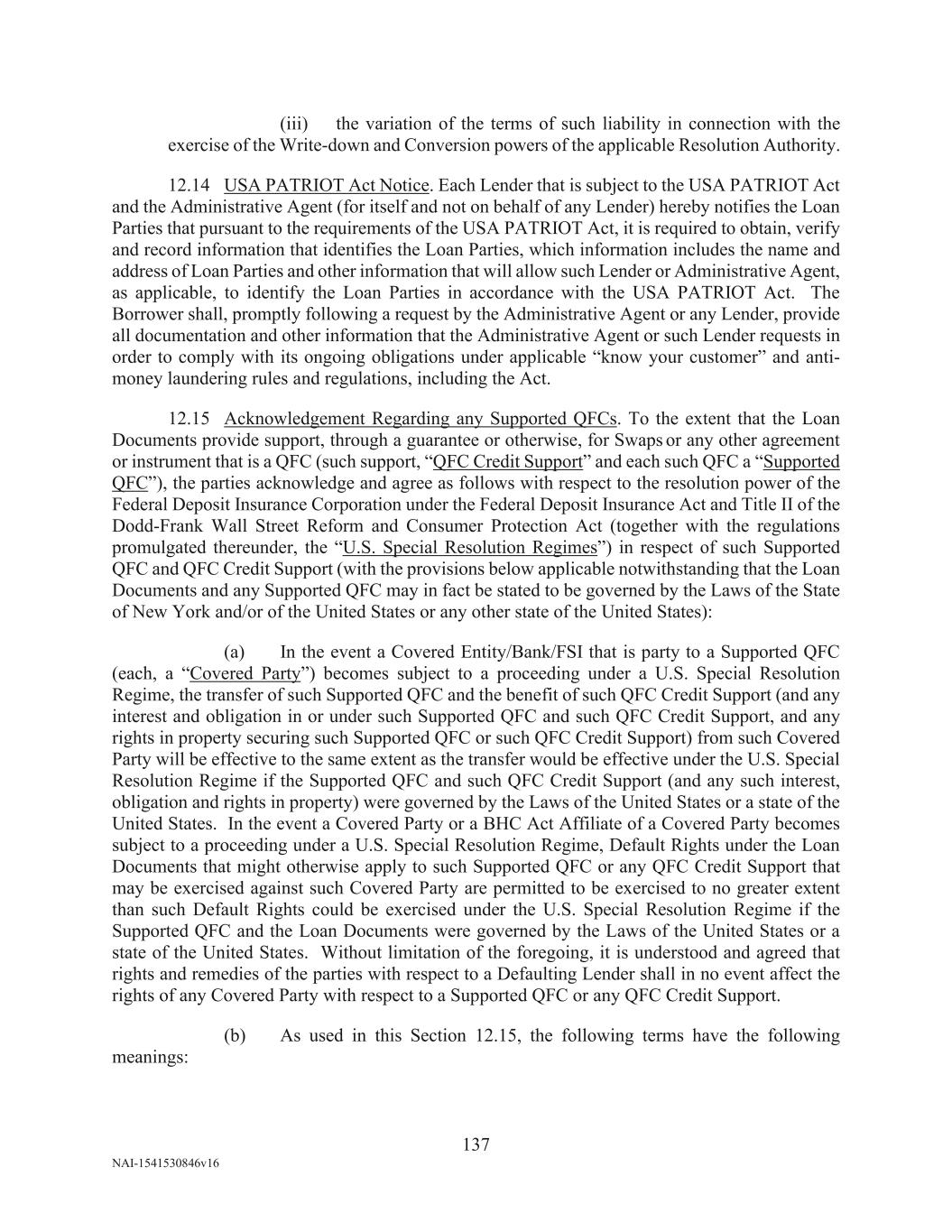 NAI-1541530846v16 137 (iii) the variation of the terms of such liability in connection with the exercise of the Write-down and Conversion powers of the applicable Resolution Authority. 12.14 USA PATRIOT Act Notice. Each Lender that is subject to the USA PATRIOT Act and the Administrative Agent (for itself and not on behalf of any Lender) hereby notifies the Loan Parties that pursuant to the requirements of the USA PATRIOT Act, it is required to obtain, verify and record information that identifies the Loan Parties, which information includes the name and address of Loan Parties and other information that will allow such Lender or Administrative Agent, as applicable, to identify the Loan Parties in accordance with the USA PATRIOT Act. The Borrower shall, promptly following a request by the Administrative Agent or any Lender, provide all documentation and other information that the Administrative Agent or such Lender requests in order to comply with its ongoing obligations under applicable “know your customer” and anti- money laundering rules and regulations, including the Act. 12.15 Acknowledgement Regarding any Supported QFCs. To the extent that the Loan Documents provide support, through a guarantee or otherwise, for Swaps or any other agreement or instrument that is a QFC (such support, “QFC Credit Support” and each such QFC a “Supported QFC”), the parties acknowledge and agree as follows with respect to the resolution power of the Federal Deposit Insurance Corporation under the Federal Deposit Insurance Act and Title II of the Dodd-Frank Wall Street Reform and Consumer Protection Act (together with the regulations promulgated thereunder, the “U.S. Special Resolution Regimes”) in respect of such Supported QFC and QFC Credit Support (with the provisions below applicable notwithstanding that the Loan Documents and any Supported QFC may in fact be stated to be governed by the Laws of the State of New York and/or of the United States or any other state of the United States): (a) In the event a Covered Entity/Bank/FSI that is party to a Supported QFC (each, a “Covered Party”) becomes subject to a proceeding under a U.S. Special Resolution Regime, the transfer of such Supported QFC and the benefit of such QFC Credit Support (and any interest and obligation in or under such Supported QFC and such QFC Credit Support, and any rights in property securing such Supported QFC or such QFC Credit Support) from such Covered Party will be effective to the same extent as the transfer would be effective under the U.S. Special Resolution Regime if the Supported QFC and such QFC Credit Support (and any such interest, obligation and rights in property) were governed by the Laws of the United States or a state of the United States. In the event a Covered Party or a BHC Act Affiliate of a Covered Party becomes subject to a proceeding under a U.S. Special Resolution Regime, Default Rights under the Loan Documents that might otherwise apply to such Supported QFC or any QFC Credit Support that may be exercised against such Covered Party are permitted to be exercised to no greater extent than such Default Rights could be exercised under the U.S. Special Resolution Regime if the Supported QFC and the Loan Documents were governed by the Laws of the United States or a state of the United States. Without limitation of the foregoing, it is understood and agreed that rights and remedies of the parties with respect to a Defaulting Lender shall in no event affect the rights of any Covered Party with respect to a Supported QFC or any QFC Credit Support. (b) As used in this Section 12.15, the following terms have the following meanings: