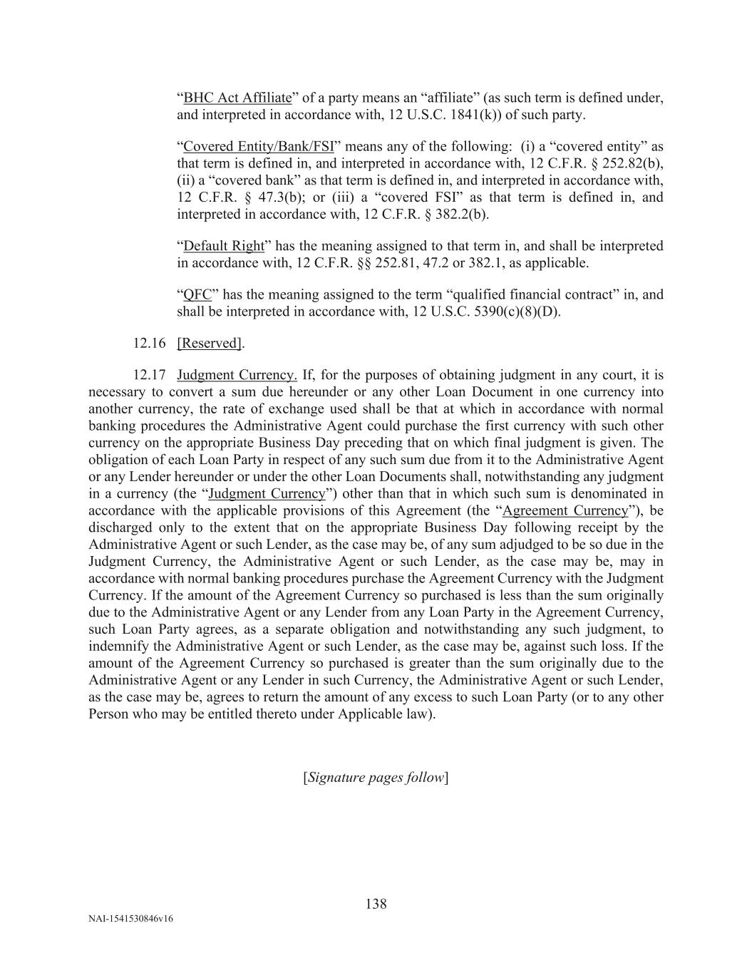 NAI-1541530846v16 138 “BHC Act Affiliate” of a party means an “affiliate” (as such term is defined under, and interpreted in accordance with, 12 U.S.C. 1841(k)) of such party. “Covered Entity/Bank/FSI” means any of the following: (i) a “covered entity” as that term is defined in, and interpreted in accordance with, 12 C.F.R. § 252.82(b), (ii) a “covered bank” as that term is defined in, and interpreted in accordance with, 12 C.F.R. § 47.3(b); or (iii) a “covered FSI” as that term is defined in, and interpreted in accordance with, 12 C.F.R. § 382.2(b). “Default Right” has the meaning assigned to that term in, and shall be interpreted in accordance with, 12 C.F.R. §§ 252.81, 47.2 or 382.1, as applicable. “QFC” has the meaning assigned to the term “qualified financial contract” in, and shall be interpreted in accordance with, 12 U.S.C. 5390(c)(8)(D). 12.16 [Reserved]. 12.17 Judgment Currency. If, for the purposes of obtaining judgment in any court, it is necessary to convert a sum due hereunder or any other Loan Document in one currency into another currency, the rate of exchange used shall be that at which in accordance with normal banking procedures the Administrative Agent could purchase the first currency with such other currency on the appropriate Business Day preceding that on which final judgment is given. The obligation of each Loan Party in respect of any such sum due from it to the Administrative Agent or any Lender hereunder or under the other Loan Documents shall, notwithstanding any judgment in a currency (the “Judgment Currency”) other than that in which such sum is denominated in accordance with the applicable provisions of this Agreement (the “Agreement Currency”), be discharged only to the extent that on the appropriate Business Day following receipt by the Administrative Agent or such Lender, as the case may be, of any sum adjudged to be so due in the Judgment Currency, the Administrative Agent or such Lender, as the case may be, may in accordance with normal banking procedures purchase the Agreement Currency with the Judgment Currency. If the amount of the Agreement Currency so purchased is less than the sum originally due to the Administrative Agent or any Lender from any Loan Party in the Agreement Currency, such Loan Party agrees, as a separate obligation and notwithstanding any such judgment, to indemnify the Administrative Agent or such Lender, as the case may be, against such loss. If the amount of the Agreement Currency so purchased is greater than the sum originally due to the Administrative Agent or any Lender in such Currency, the Administrative Agent or such Lender, as the case may be, agrees to return the amount of any excess to such Loan Party (or to any other Person who may be entitled thereto under Applicable law). [Signature pages follow]