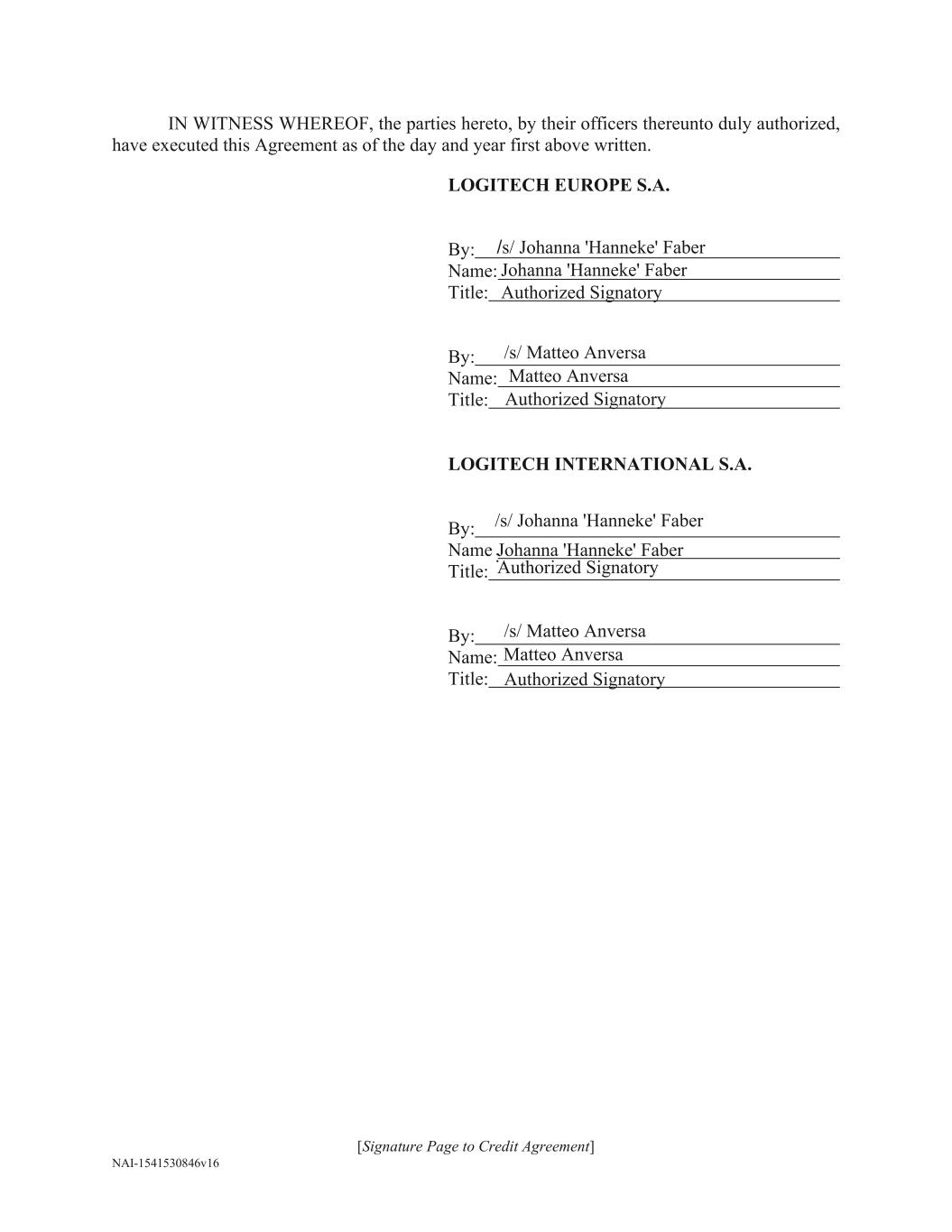 NAI-1541530846v16 [Signature Page to Credit Agreement] IN WITNESS WHEREOF, the parties hereto, by their officers thereunto duly authorized, have executed this Agreement as of the day and year first above written. LOGITECH EUROPE S.A. By: Name: Title: By: Name: Title: LOGITECH INTERNATIONAL S.A. By: Name Title: By: Name: Title: /